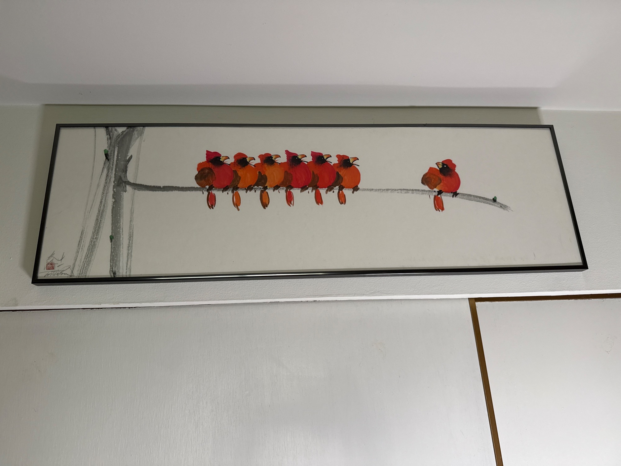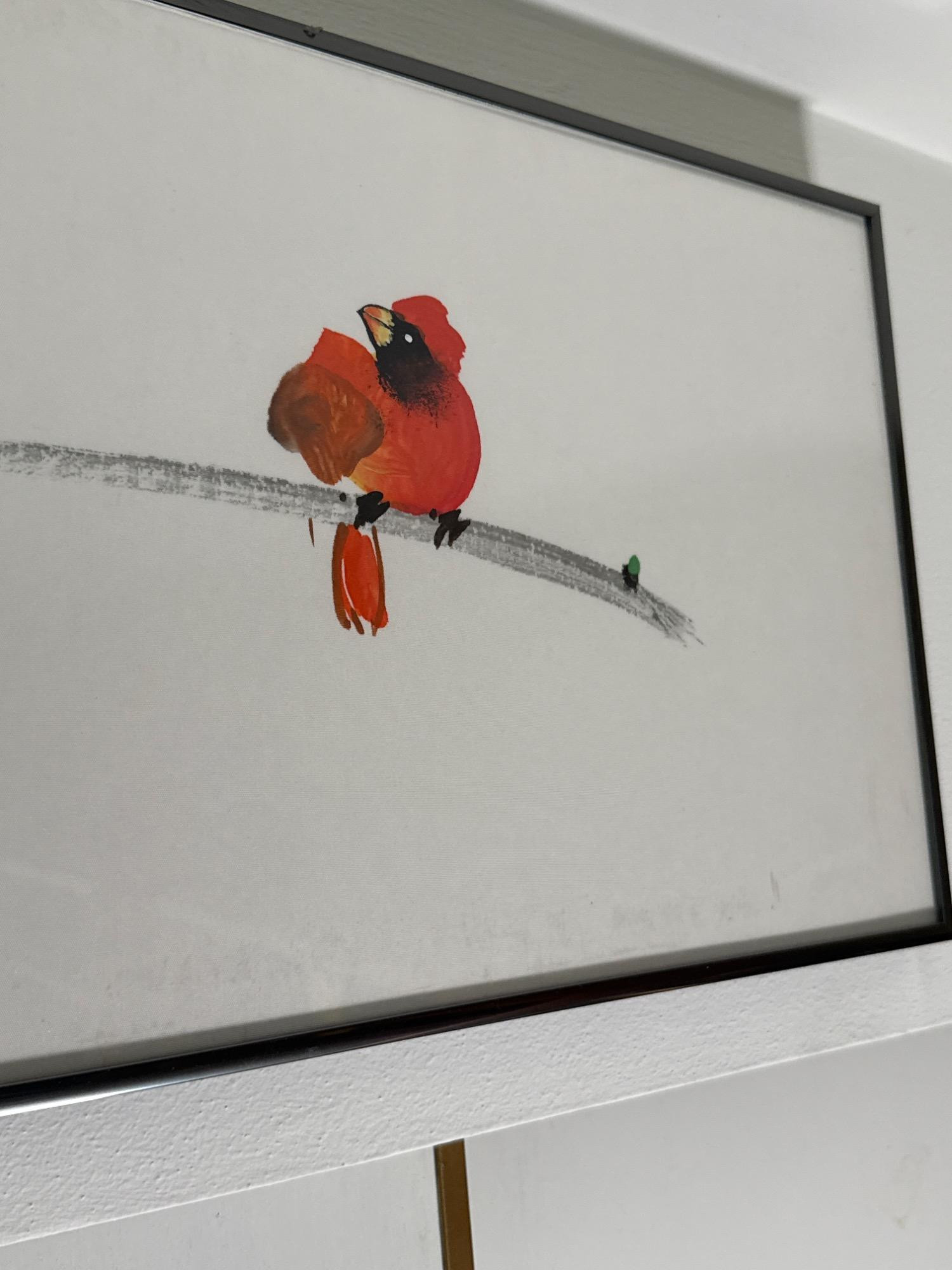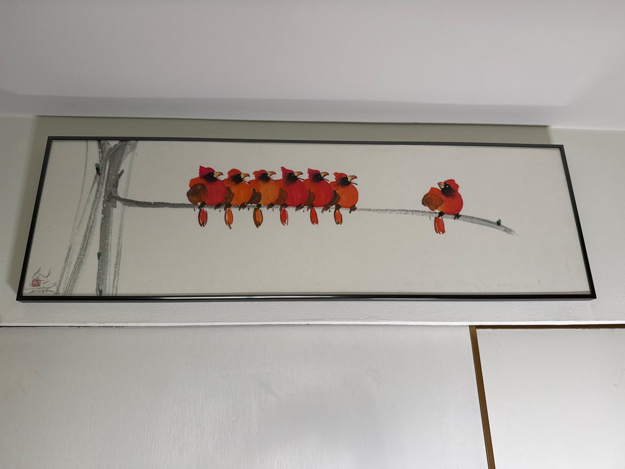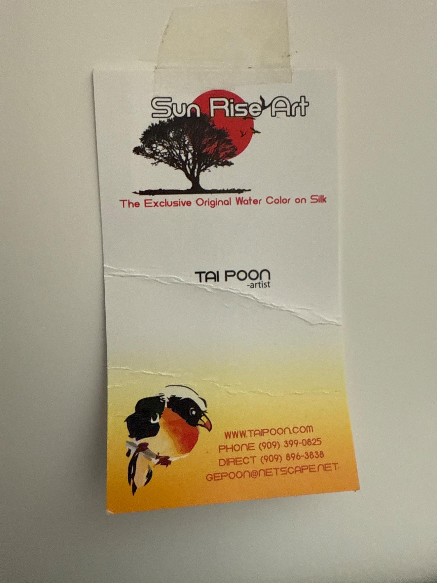 A charming and whimsical watercolor titled "Cardinal on a Branch" by artist Tai Poon (also known as Taiphoon), known for his delicate and expressive works on silk. This original artwork features a delightful row of red cardinals perched playfully on a branch, rendered in bold watercolor strokes that bring out the birds’ personality and vibrant plumage. Painted on silk, this exclusive piece showcases the artist’s signature brushwork and includes his red seal and handwritten signature in the lower left corner. It is professionally framed and ready to hang. Medium: Watercolor on silk Size: Approximately 11.2" T x 36" L Artist: Tai Poon (Taiphoon) Origin: From the Sun Rise Art collection Details: Includes artist’s original label with contact information and signature