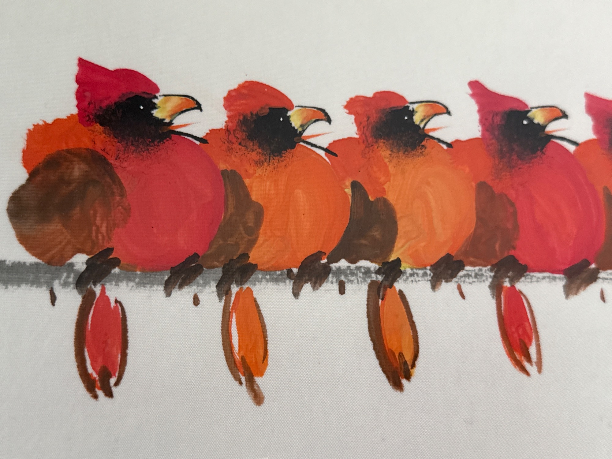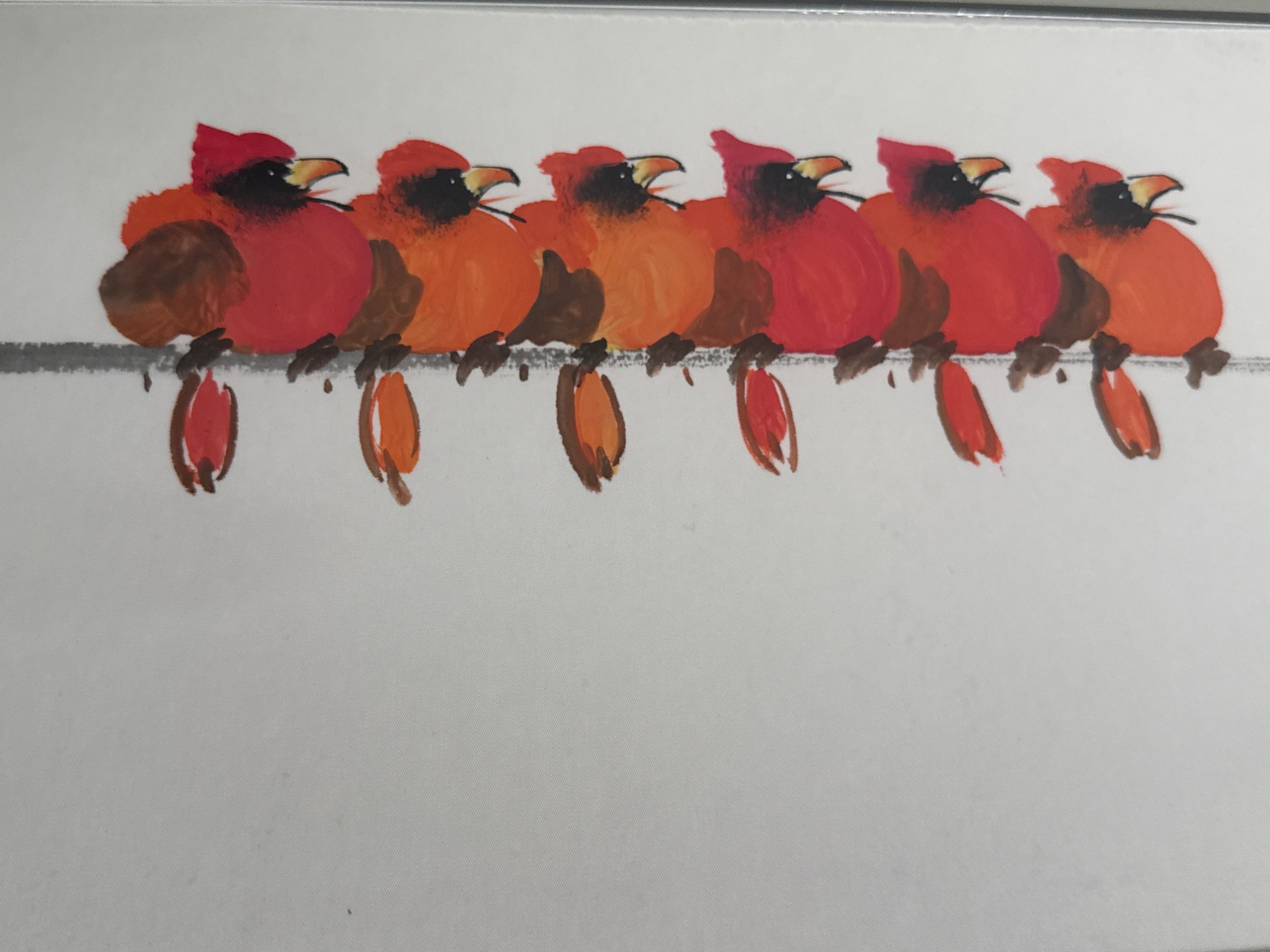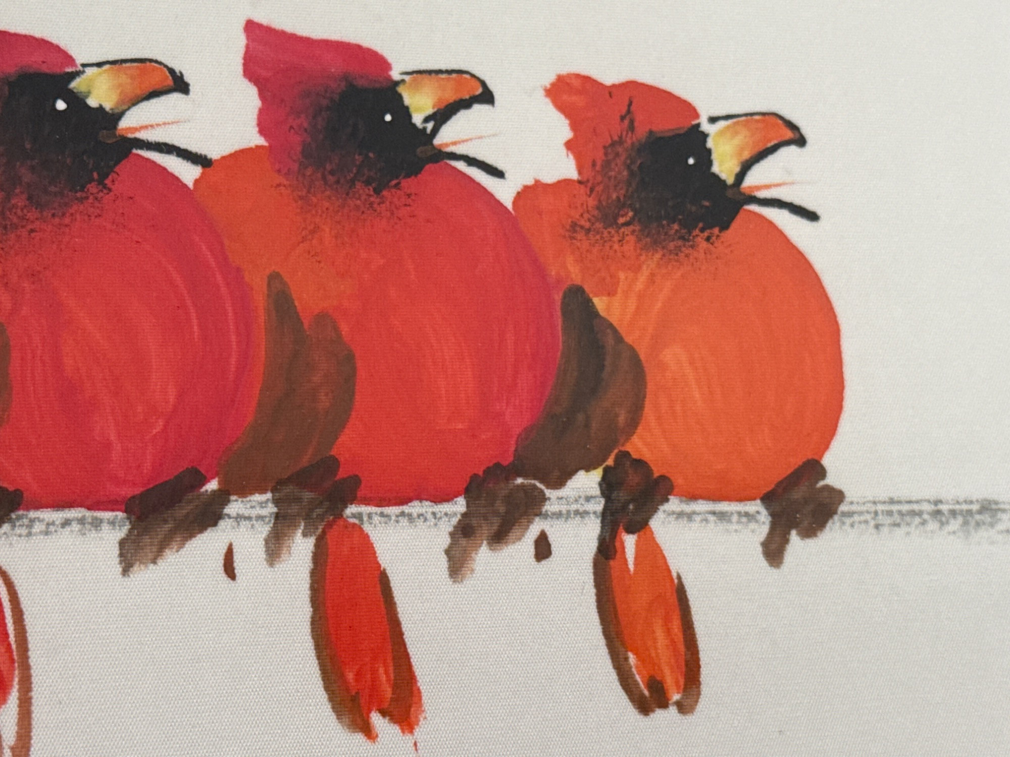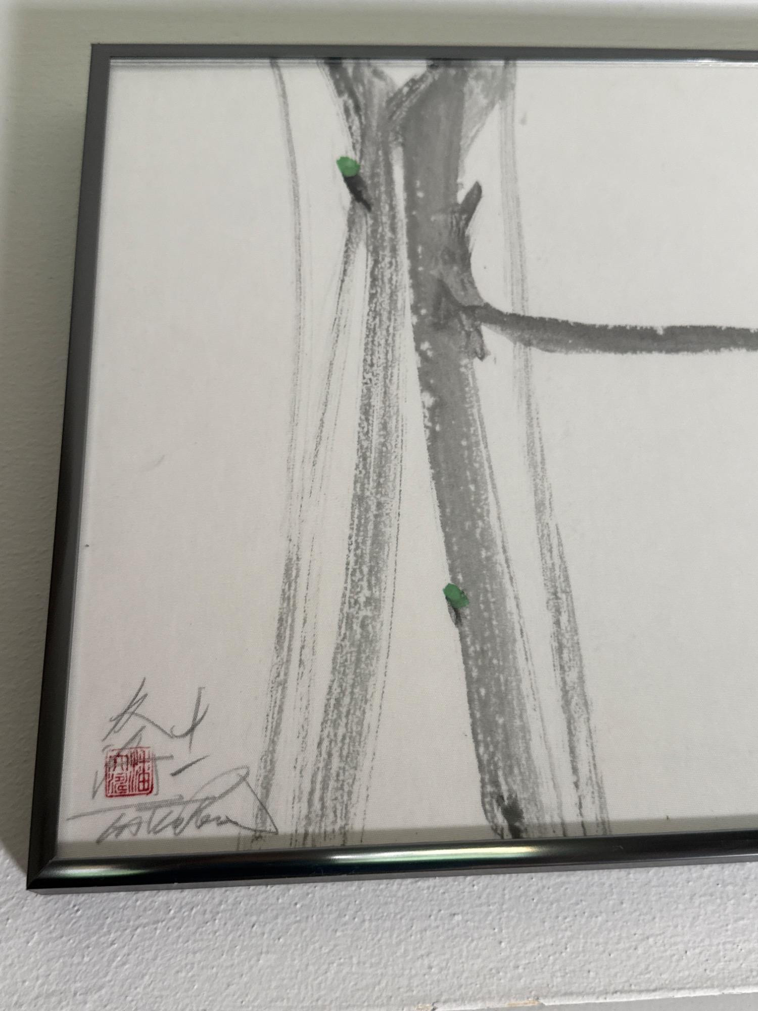 A charming and whimsical watercolor titled "Cardinal on a Branch" by artist Tai Poon (also known as Taiphoon), known for his delicate and expressive works on silk. This original artwork features a delightful row of red cardinals perched playfully on a branch, rendered in bold watercolor strokes that bring out the birds’ personality and vibrant plumage. Painted on silk, this exclusive piece showcases the artist’s signature brushwork and includes his red seal and handwritten signature in the lower left corner. It is professionally framed and ready to hang. Medium: Watercolor on silk Size: Approximately 11.2" T x 36" L Artist: Tai Poon (Taiphoon) Origin: From the Sun Rise Art collection Details: Includes artist’s original label with contact information and signature
