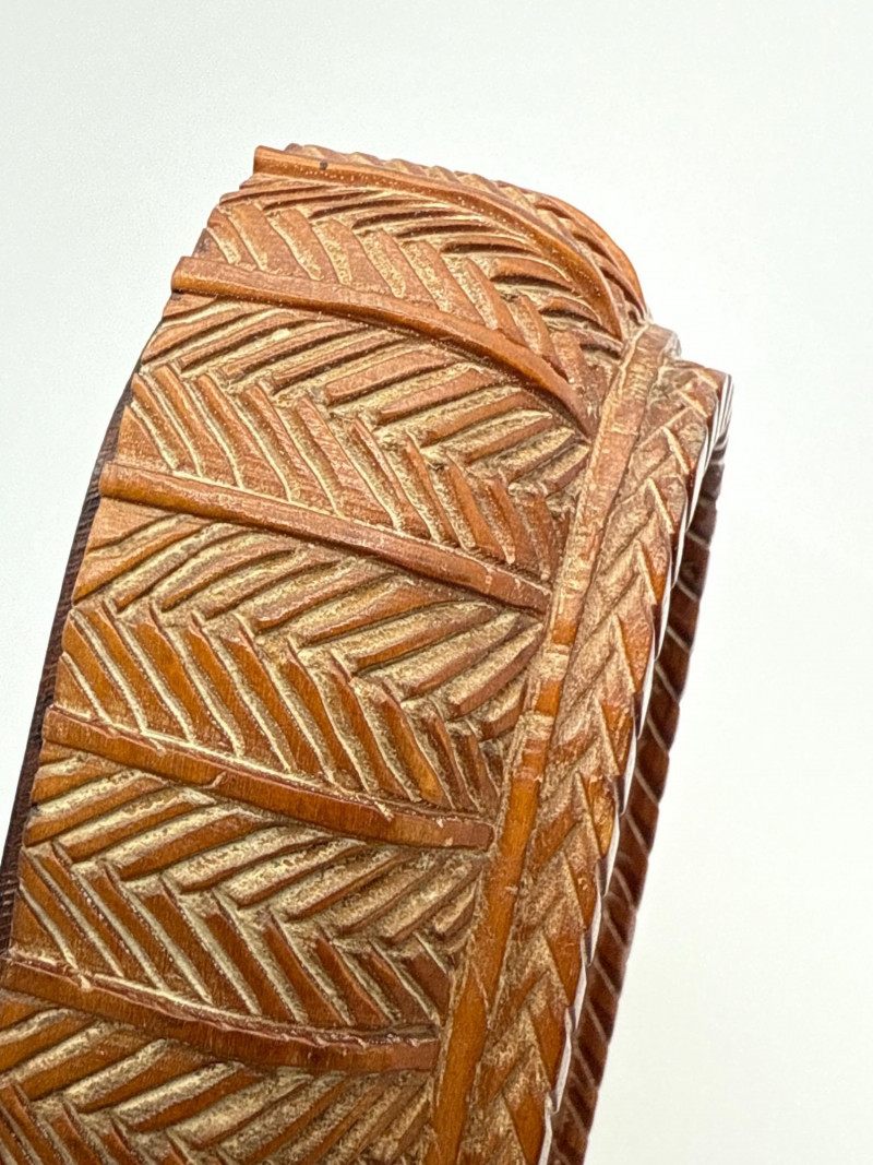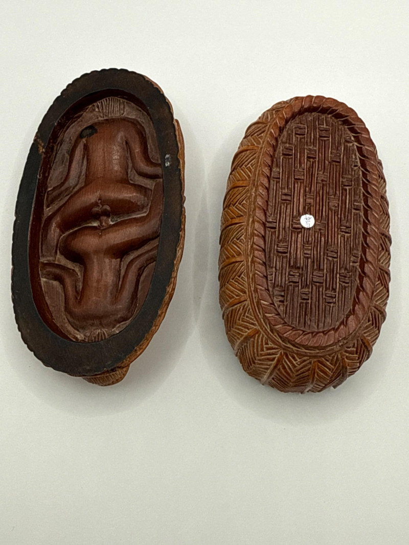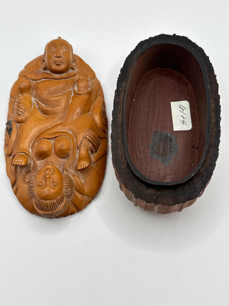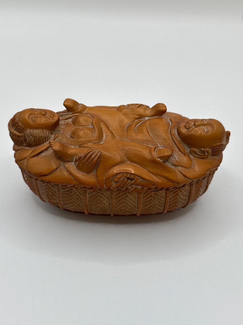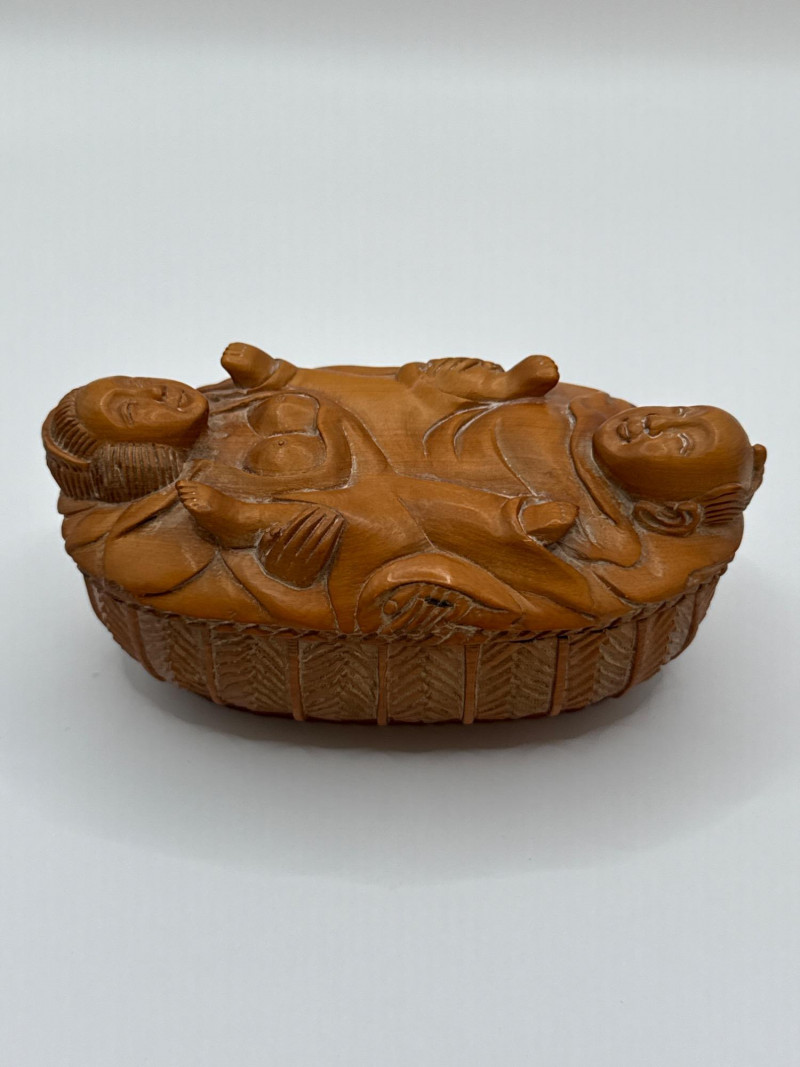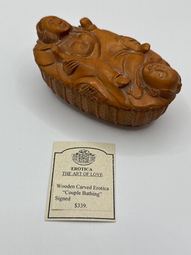 An intricately hand-carved wooden box depicting an intimate bathing scene of a couple, part of the "Erotica: The Art of Love" collection. This collectible is signed on the underside and crafted with remarkable detail, capturing expressive forms and decorative texture all around the piece. The top lifts off to reveal a hollow interior, adding function to its artistic appeal. Material: Carved wood Theme: Erotic Couple in Bathing Scene Signature: Present on base Dimensions: Approx. 4.5"L x 2”T x 2.75"W Original Price Tag: $339