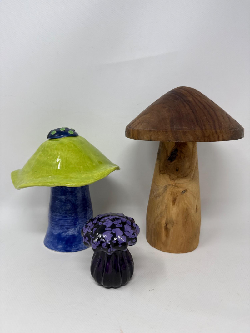 Bring a touch of whimsy to your space with this unique 3-piece mushroom decor set. Each mushroom is handcrafted from a different material, showcasing a blend of artistic craftsmanship and playful design. Set Includes: Glass Mushroom Size: 3.5” tall x 2.5” wide Color: Deep purple with light lavender accents Glossy finish, vibrant and eye-catching Original price tag: $50 Wood Mushroom Size: 9.5” tall x 6” wide Material: Solid wood with natural grain Rustic charm and smooth craftsmanship Ceramic Mushroom by Catherine Size: 7.5” tall x 7” wide Hand-painted in vibrant blue and green Signed by artist: "Creations by Catherine C" Marked “Outdoor Safe” on the base