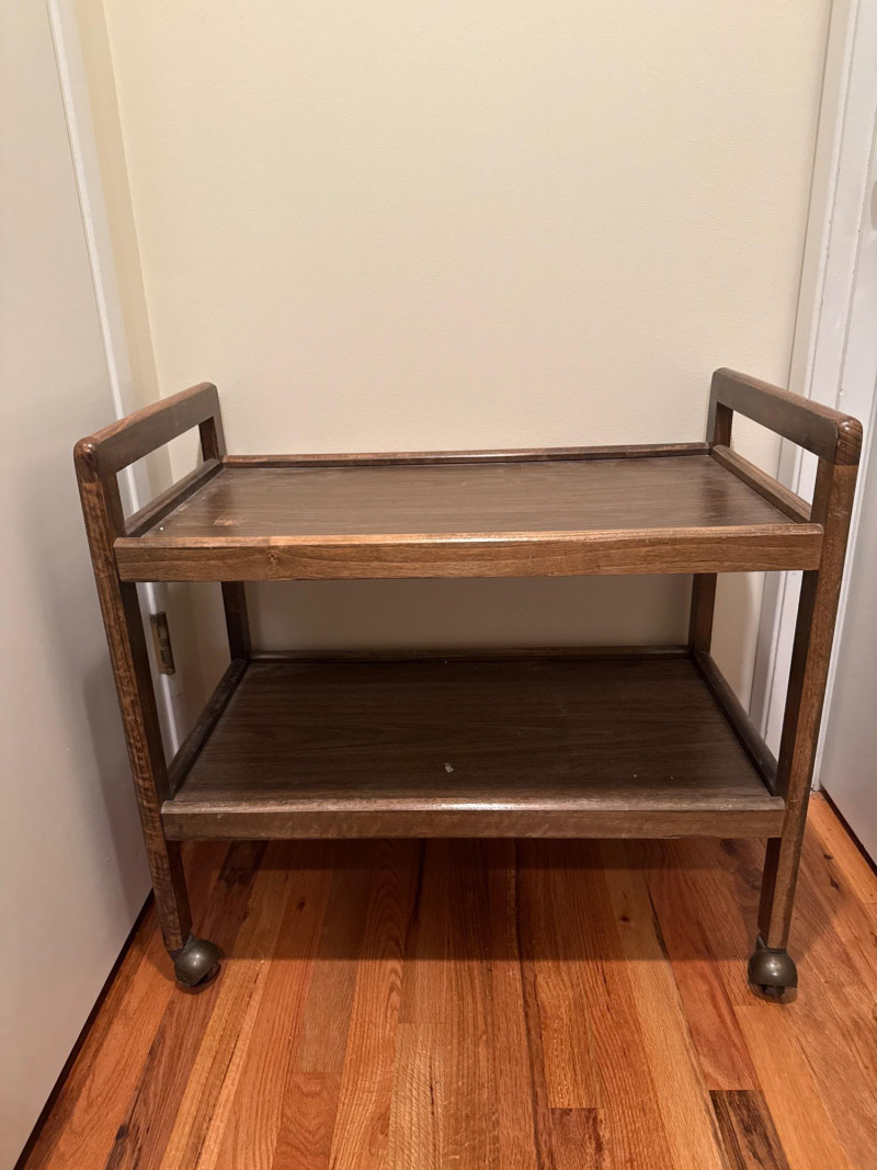 Nicely crafted vintage bar cart. Walnut colored wood construction. Capable of holding a variety of items. Dimensions are 30 inches long, 17.5 inches wide, 27 inches tall. Rolls easily, one wheel has a tendency to drop when cart is lifted. Some minor wear consistent with age.