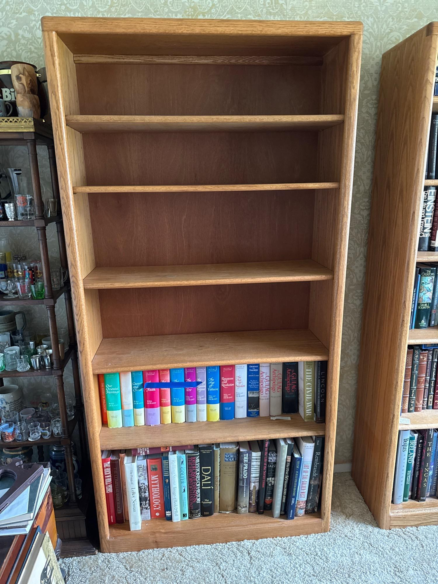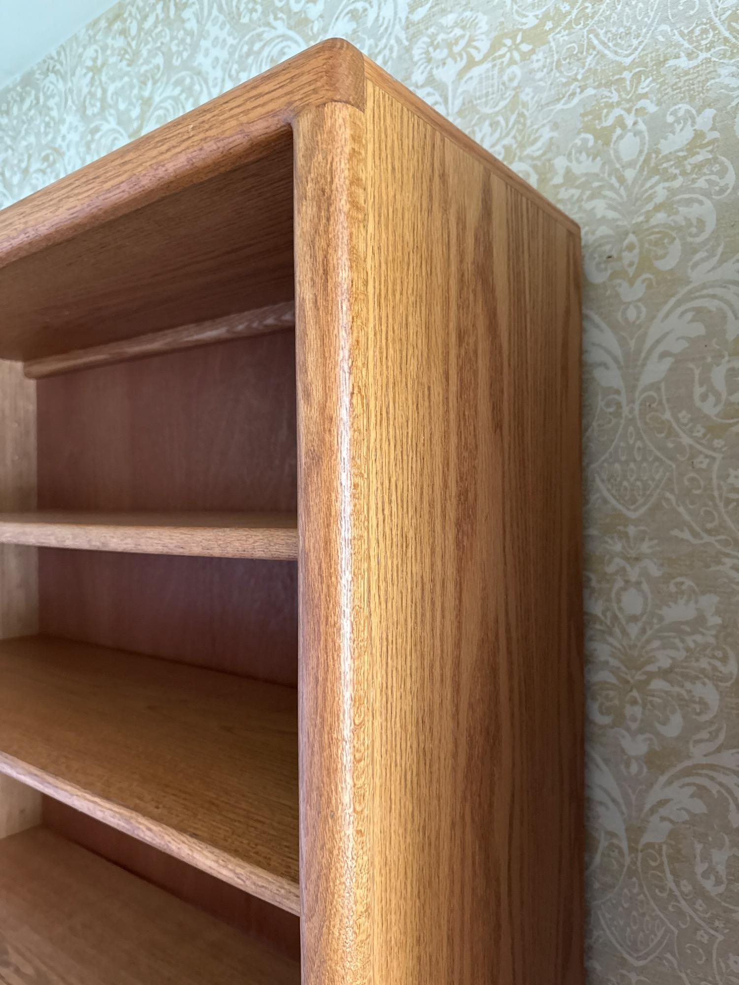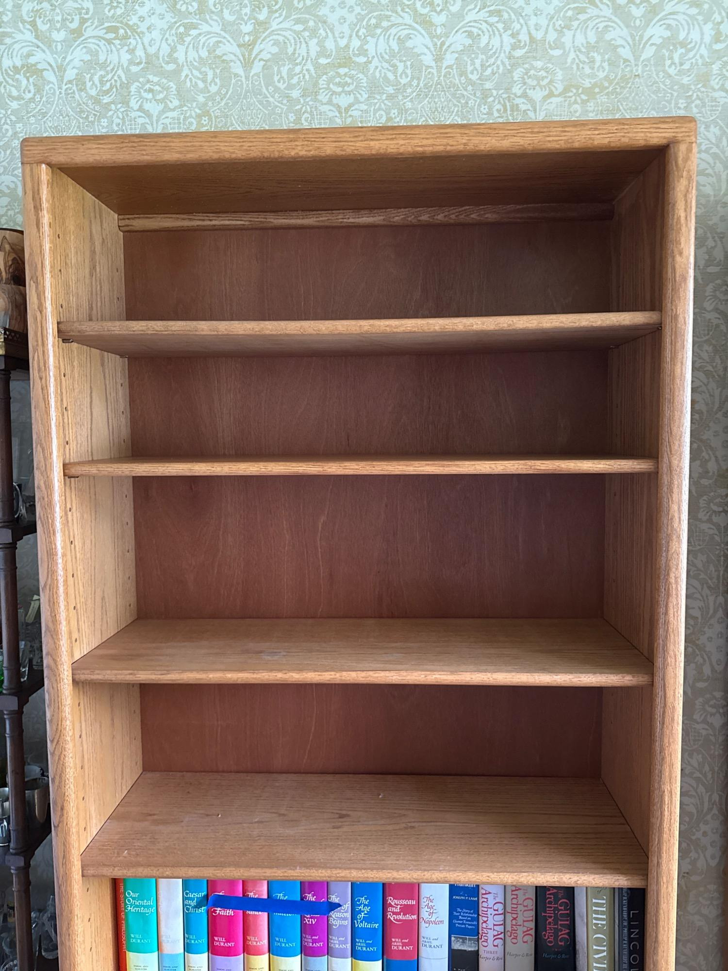 Crafted from solid oak and oak veneer, this tall and sturdy bookcase offers a timeless design and ample storage. With five spacious shelves—which are adjustable—it provides flexibility for displaying books, collectibles, or décor. The warm oak grain adds a classic touch that complements both traditional and contemporary spaces. Dimensions: 36"L x 13"W x 72"T **Books NOT included**