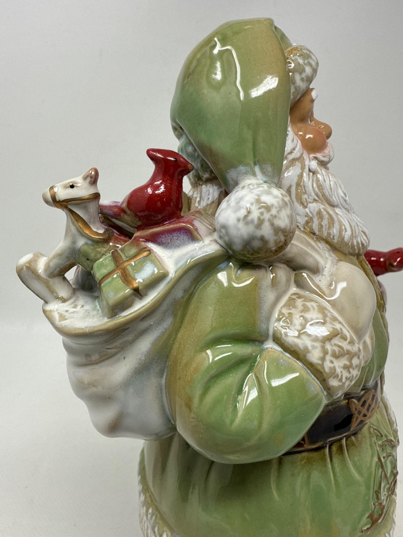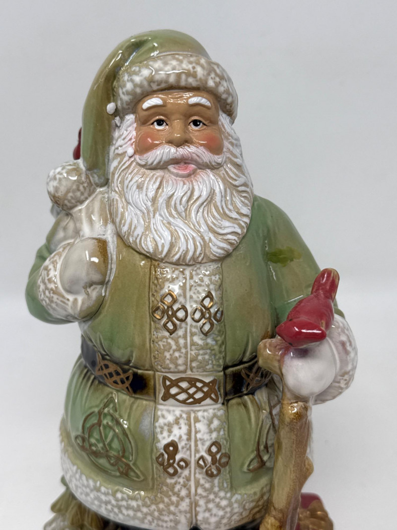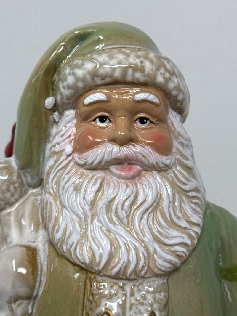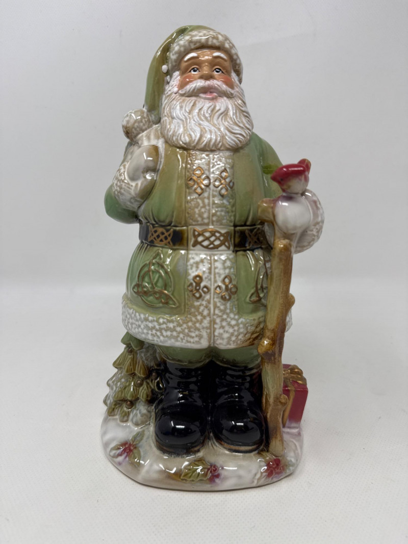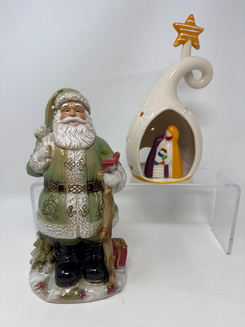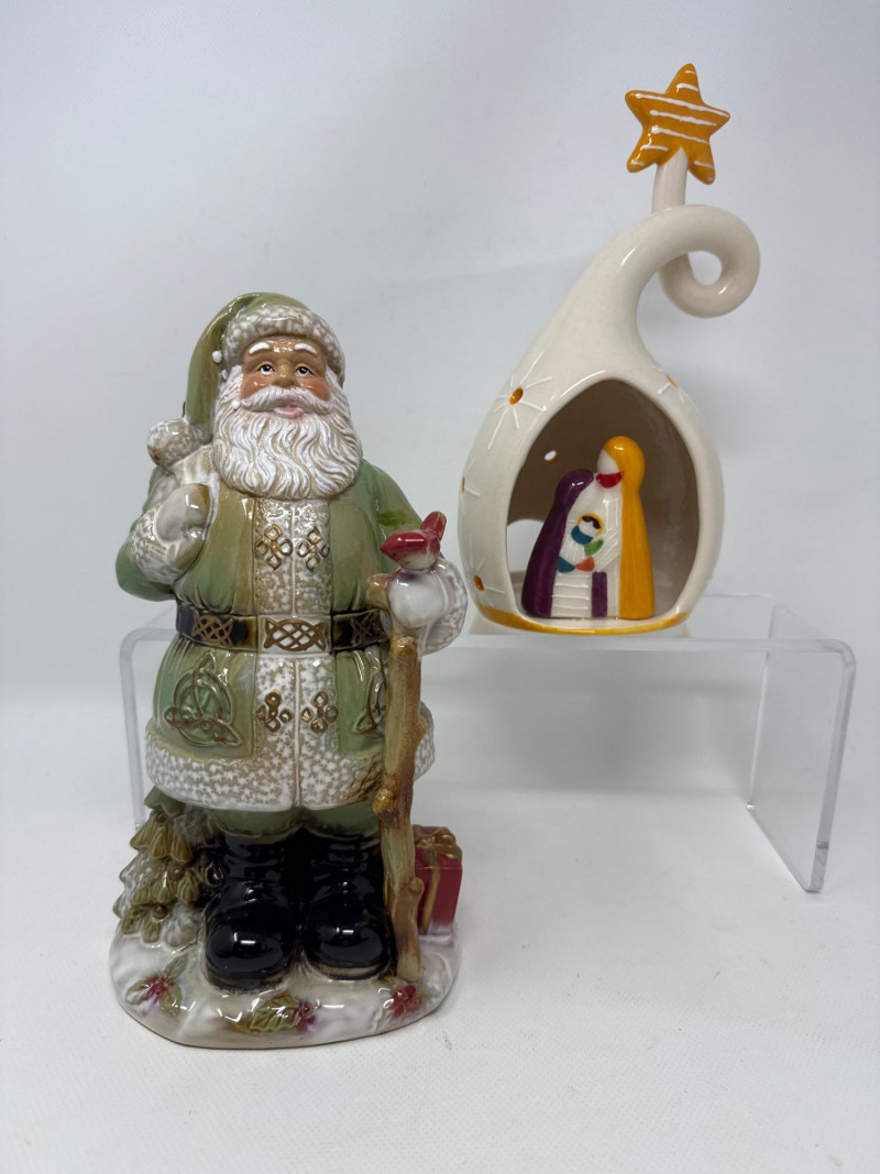 Celebrate the season with this charming duo of collectible holiday figurines: Terre di Scirocco Nativity Scene – This ceramic piece features a modern, stylized Holy Family beneath a tall, curling roof topped with a gold star. Handcrafted with signature Italian artistry, it’s signed “Terre di Scirocco” on the base. Measures 9.5” tall, 4.5” deep, and 4” wide. Abbey Press Santa Figurine – A beautifully detailed Santa dressed in green with Celtic-inspired accents, holding a staff and red bird, with a gift sack at his feet. Made of ceramic or resin. Marked “Abbey Press – 50400 – Made in China” on the bottom. Measures 10.5” tall and 5” wide.