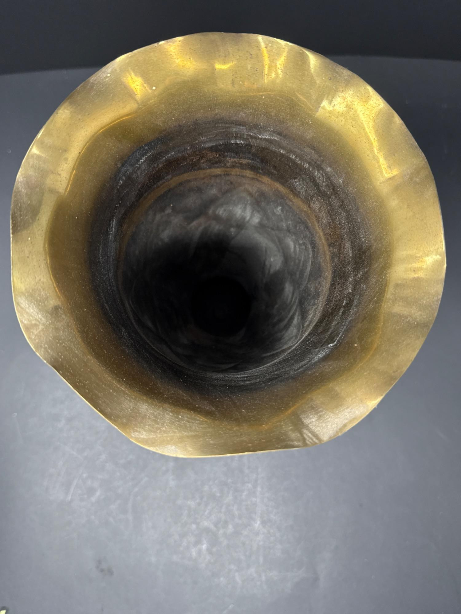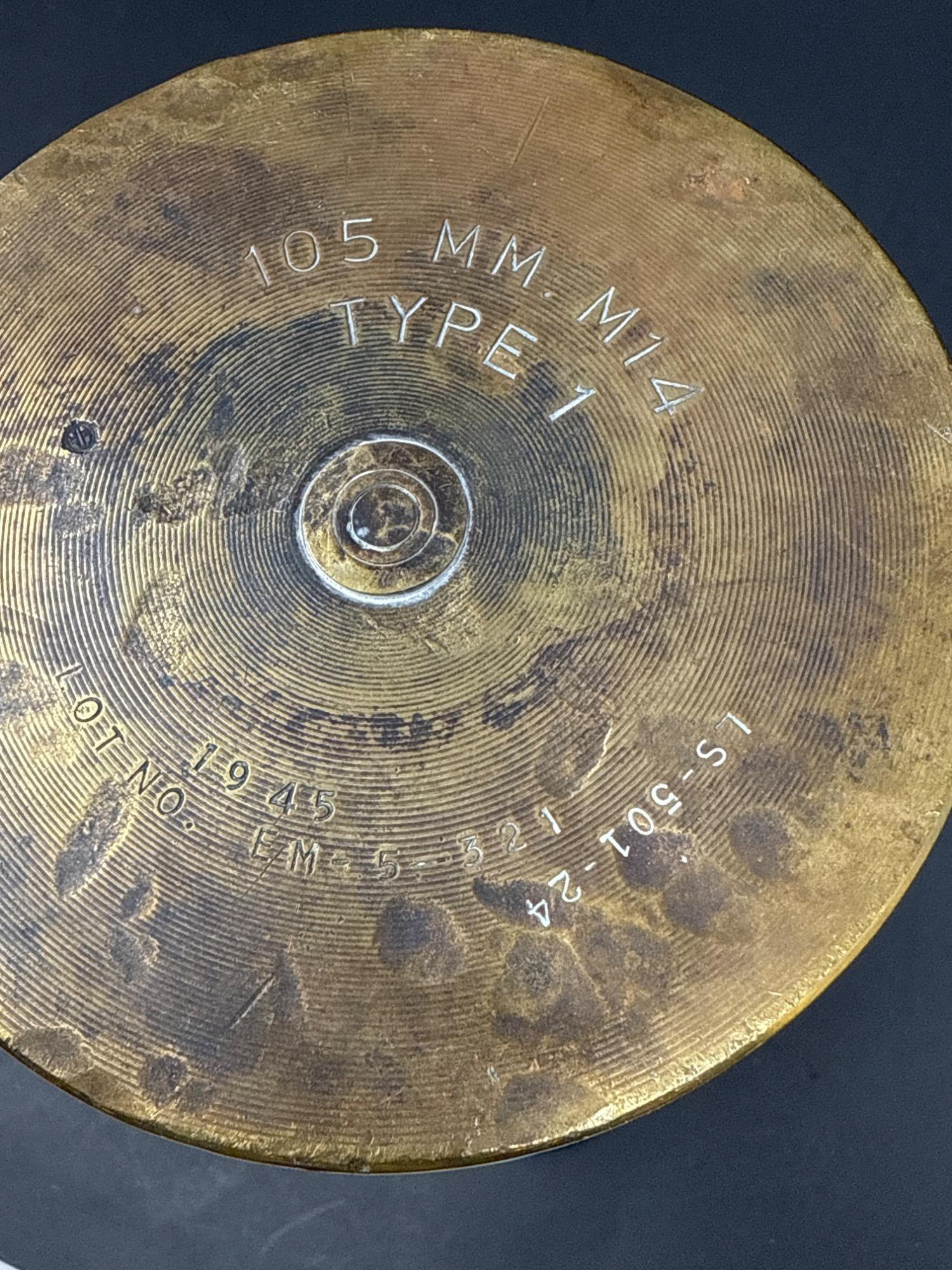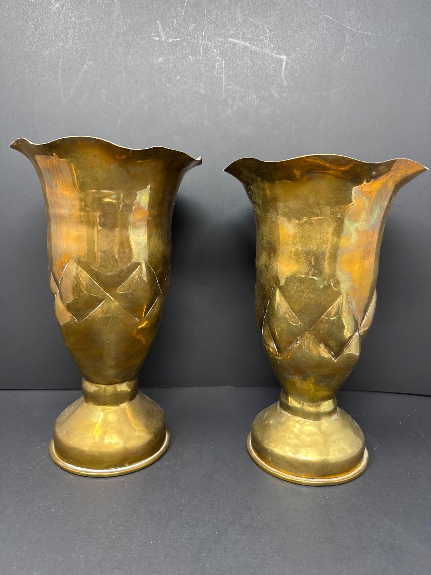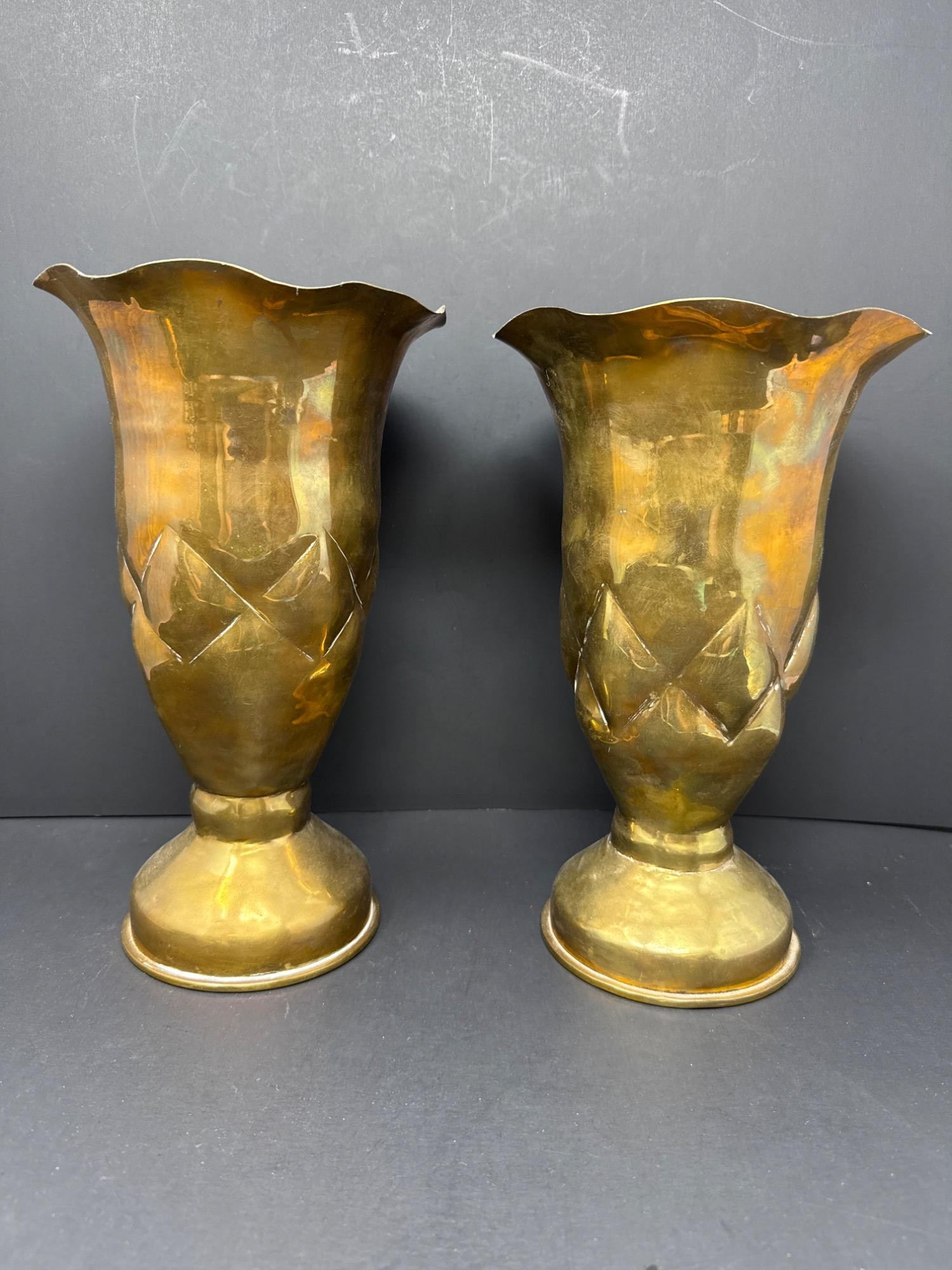 A striking and unusual pair of trench art vases handcrafted from brass 105mm artillery shell casings. Each vase has been skillfully repurposed and sculpted into a decorative form, showcasing the creativity and resilience of wartime artistry. One shell is dated 1945, from the World War II era The other is dated 1968, from the Vietnam War era Casings are marked 105 MM M14 TYPE 1 Dimensions: 11.25" tall, 6.25" wide