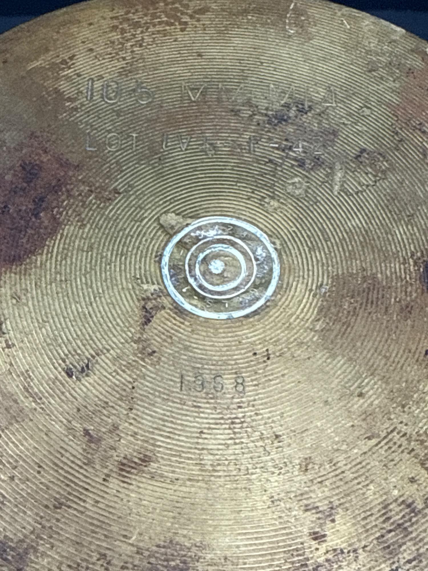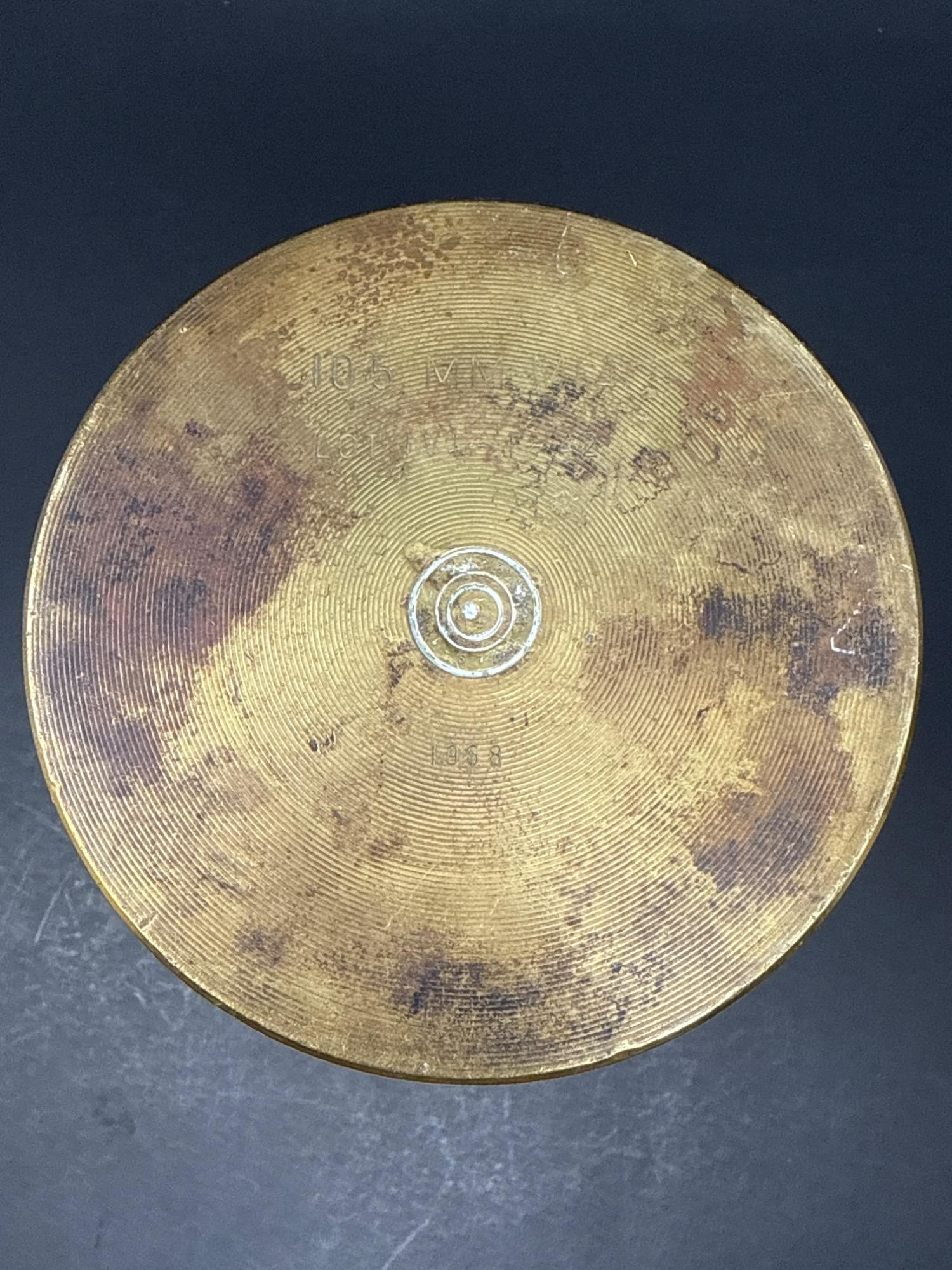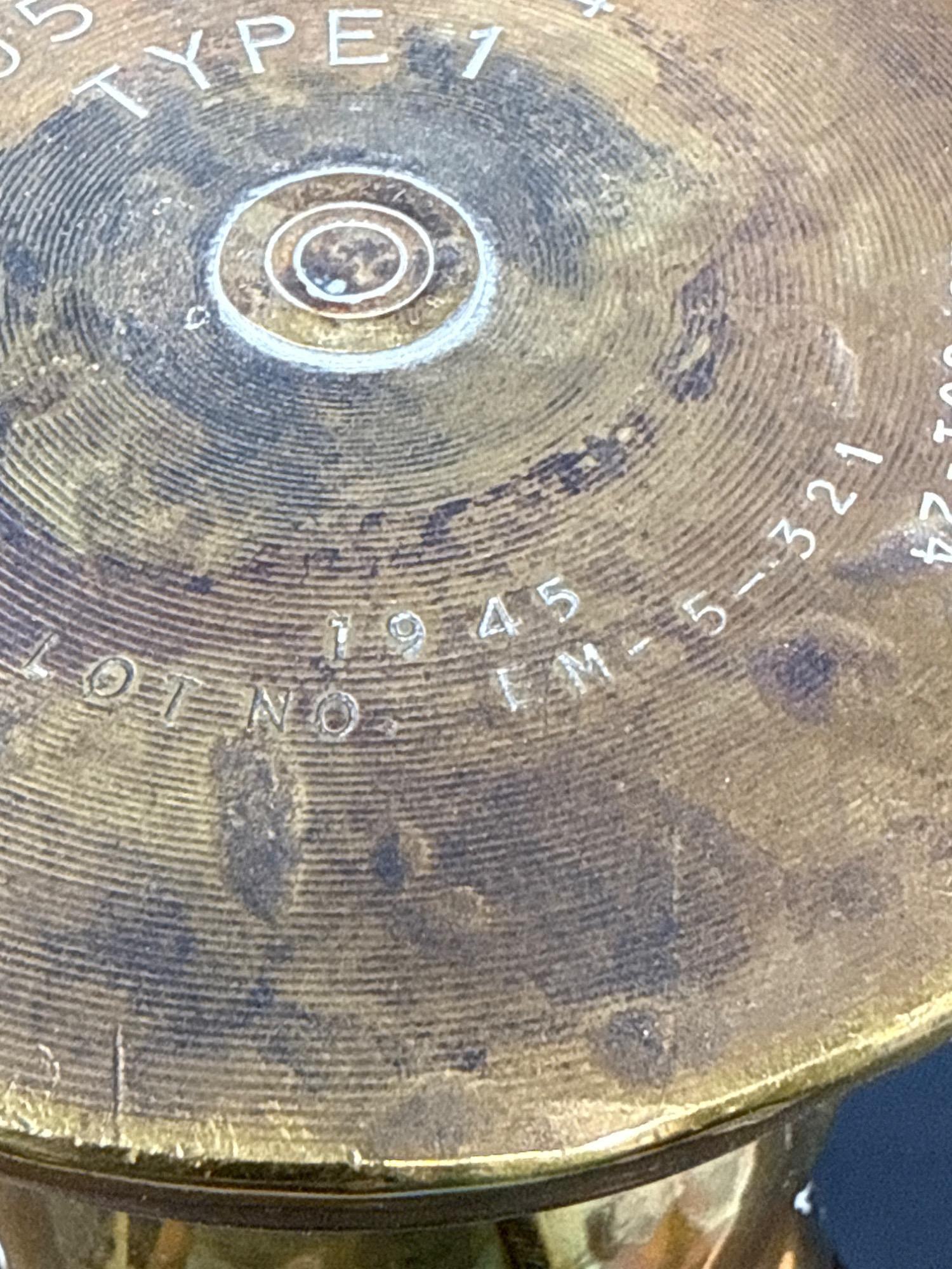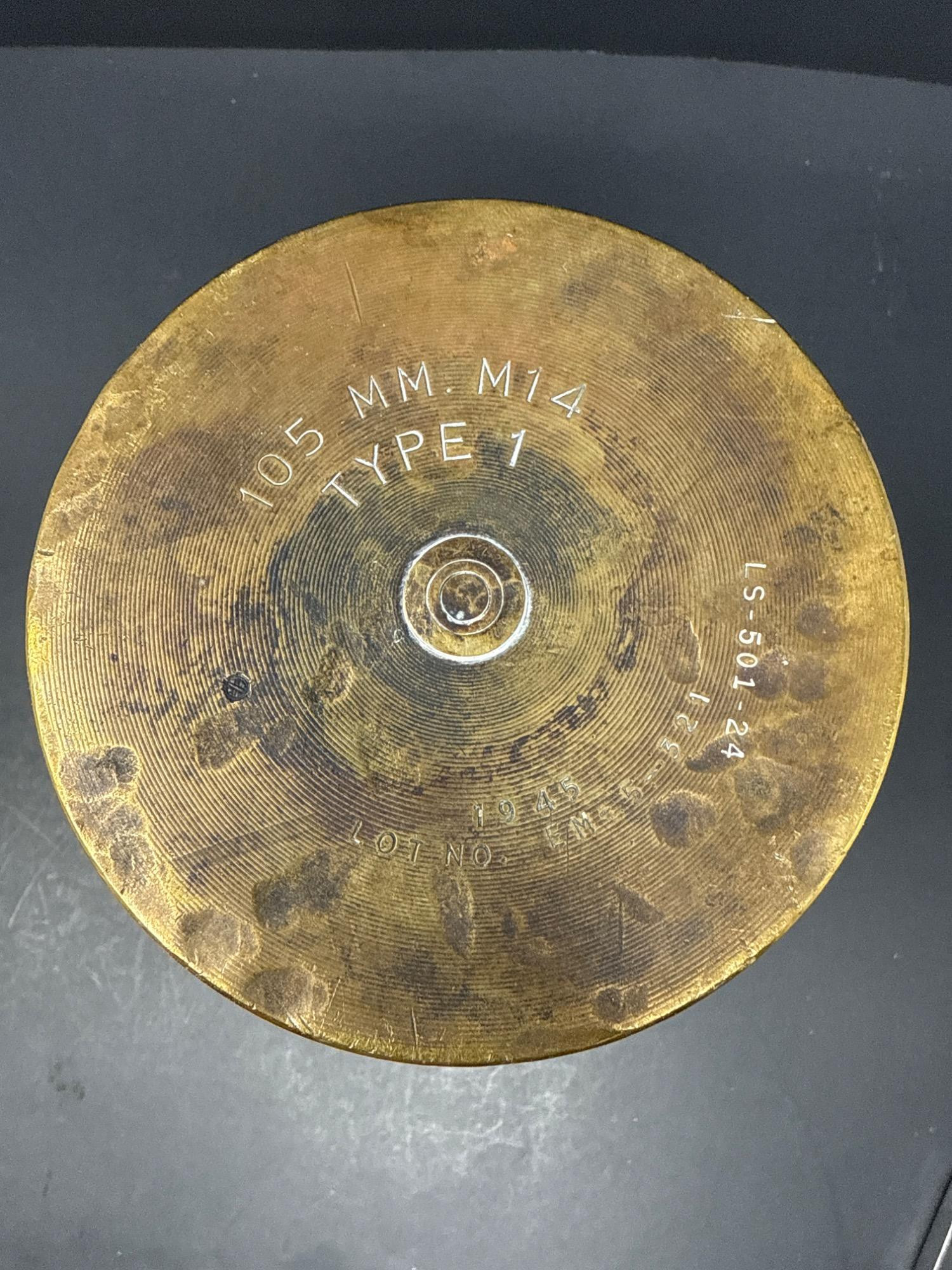 A striking and unusual pair of trench art vases handcrafted from brass 105mm artillery shell casings. Each vase has been skillfully repurposed and sculpted into a decorative form, showcasing the creativity and resilience of wartime artistry. One shell is dated 1945, from the World War II era The other is dated 1968, from the Vietnam War era Casings are marked 105 MM M14 TYPE 1 Dimensions: 11.25" tall, 6.25" wide