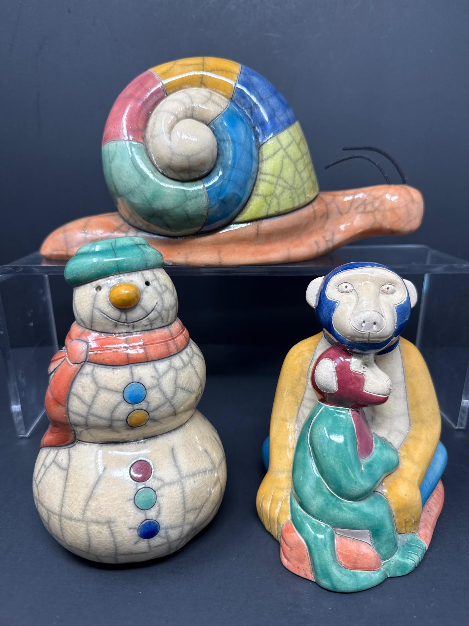 Bring whimsical charm to your collection with this delightful trio of hand-crafted ceramics, showcasing vibrant colors and fine artistry. This lot includes: Raku Snowman – Approx. 6.5" tall x 3.5" wide Hungarian Ceramic Monkey – Approx. 5.5" tall x 5.5" wide Hungarian Ceramic Snail – Approx. 5.5" tall x 10" long x 4.5" wide