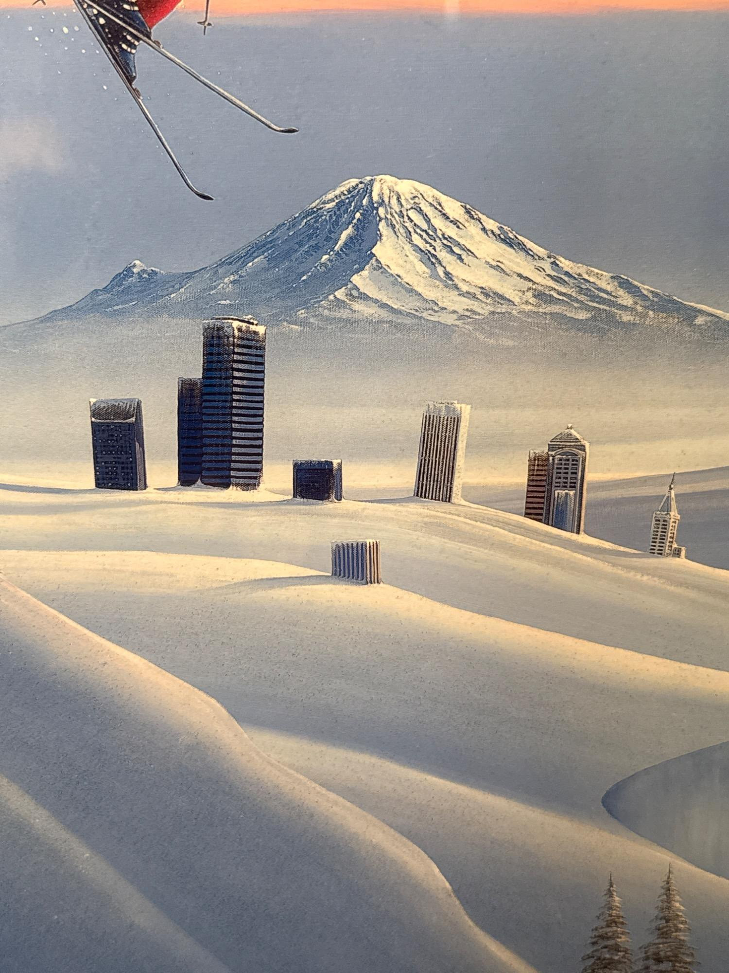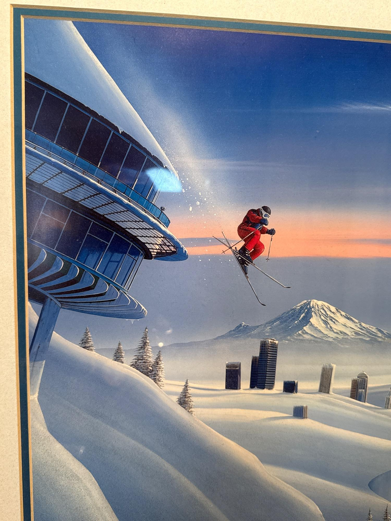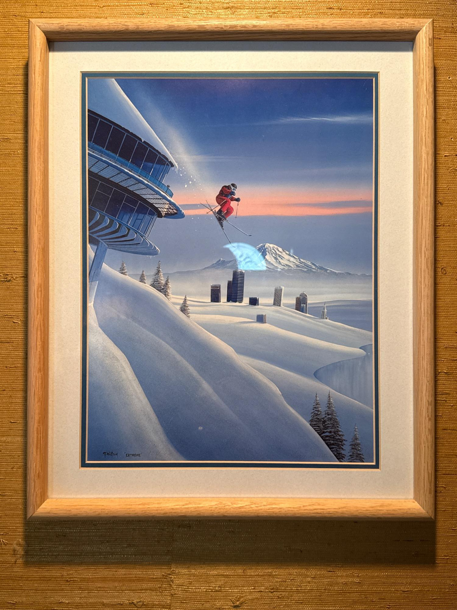 Experience the thrill of alpine adventure through this visually striking piece by T. Wistrom. "Extreme" captures a surreal winter sports moment as a skier launches off a dramatic slope beside the Seattle Space Needle, set against a majestic Mount Rainier backdrop. Artwork Details: Title: Extreme Artist: T. Wistrom Edition: Limited Edition Print, Hand-Signed & Numbered (#175 of 500) Signature: Signed front and back by the artist Dimensions (framed): 17" W x 21" T Medium: Print on paper (framed under glass) Style: Surreal / Futuristic Ski Landscape