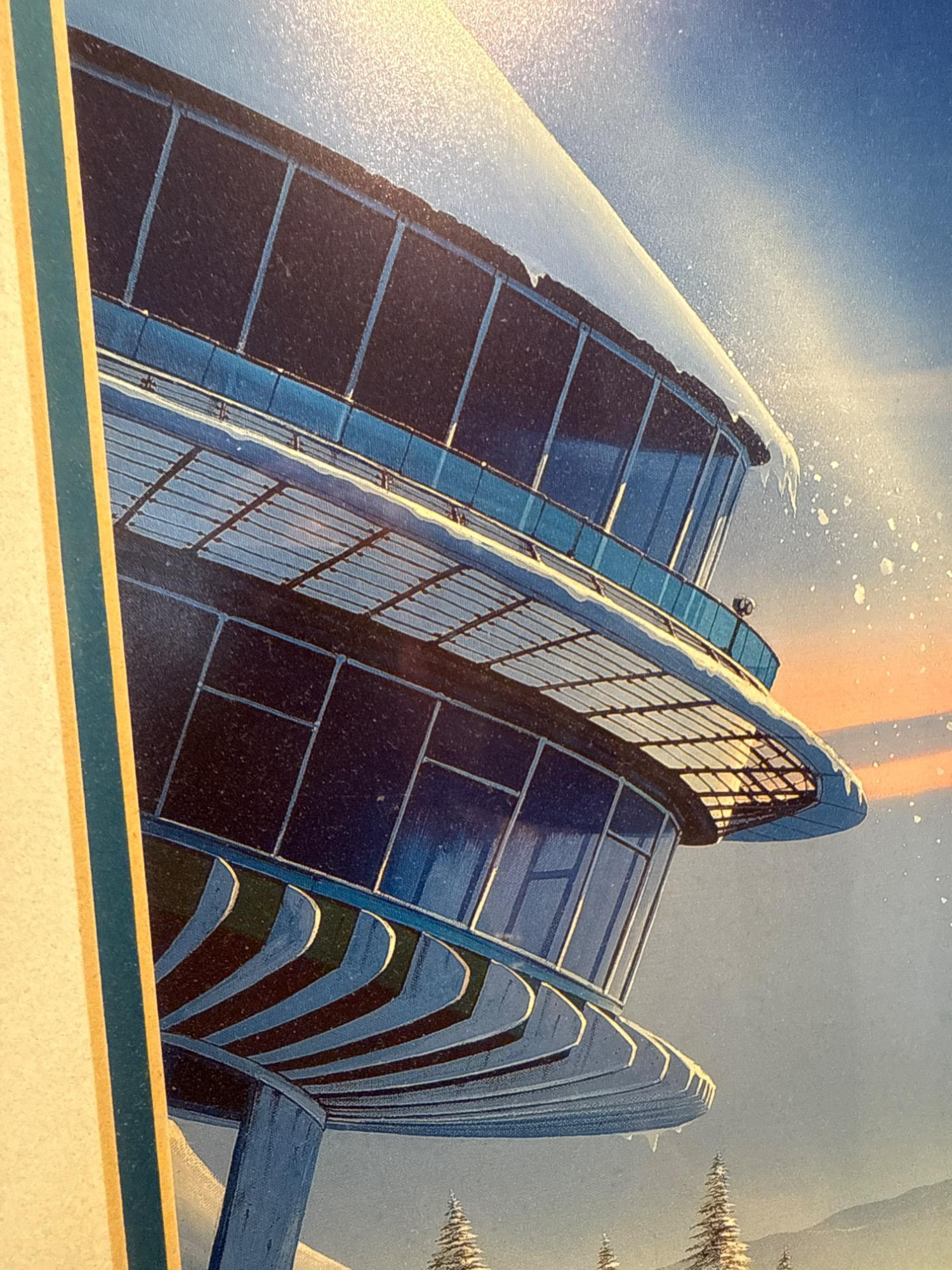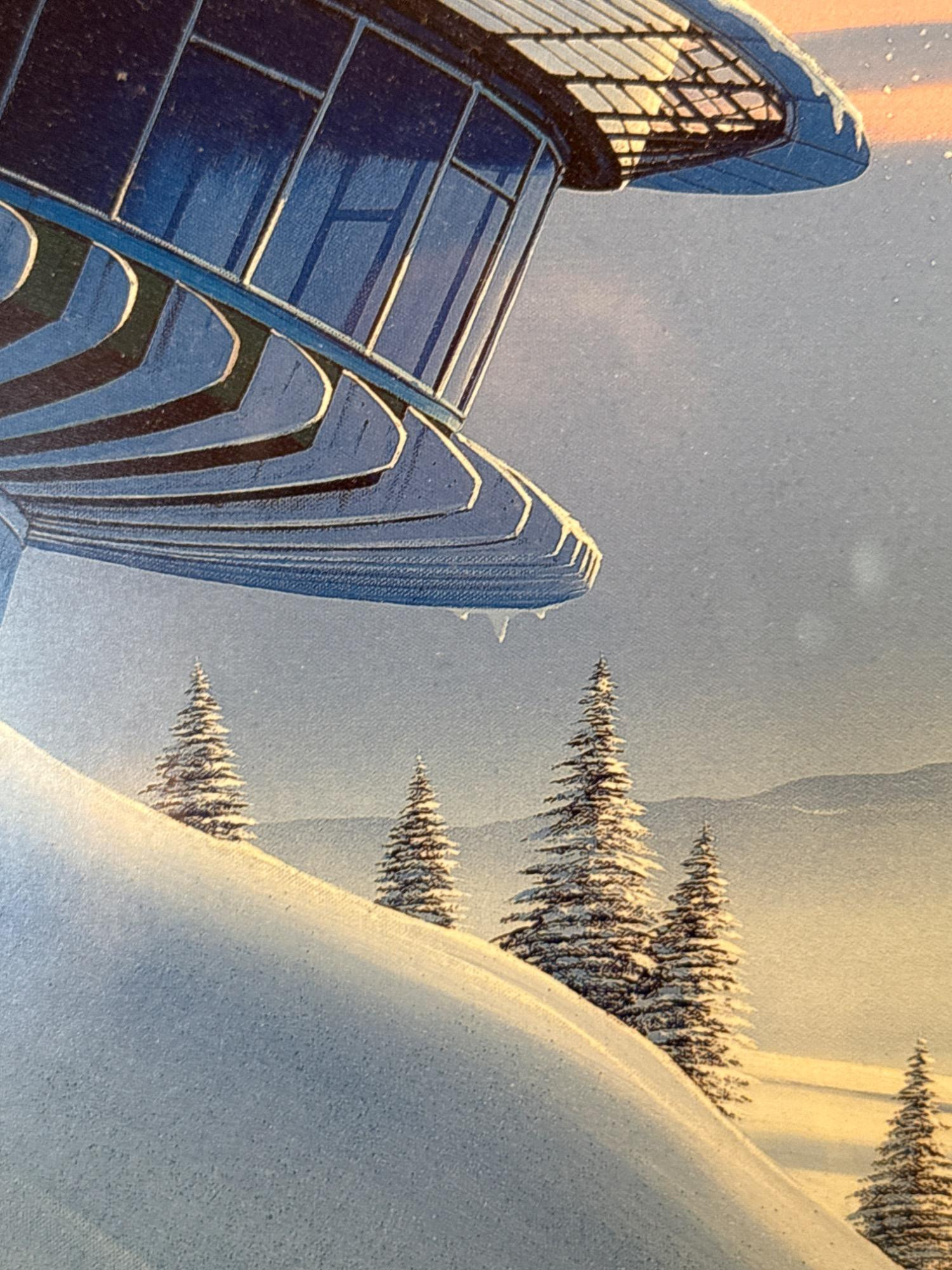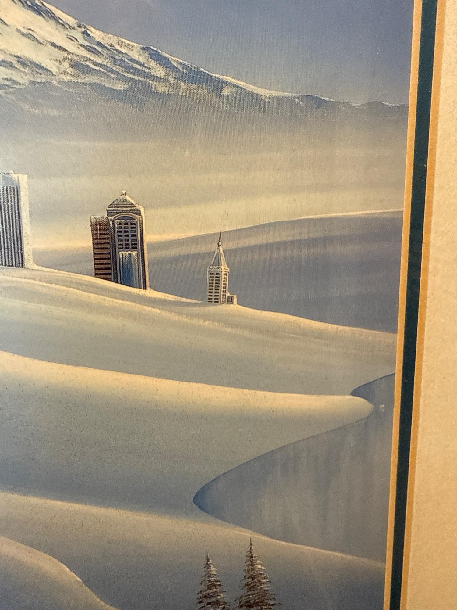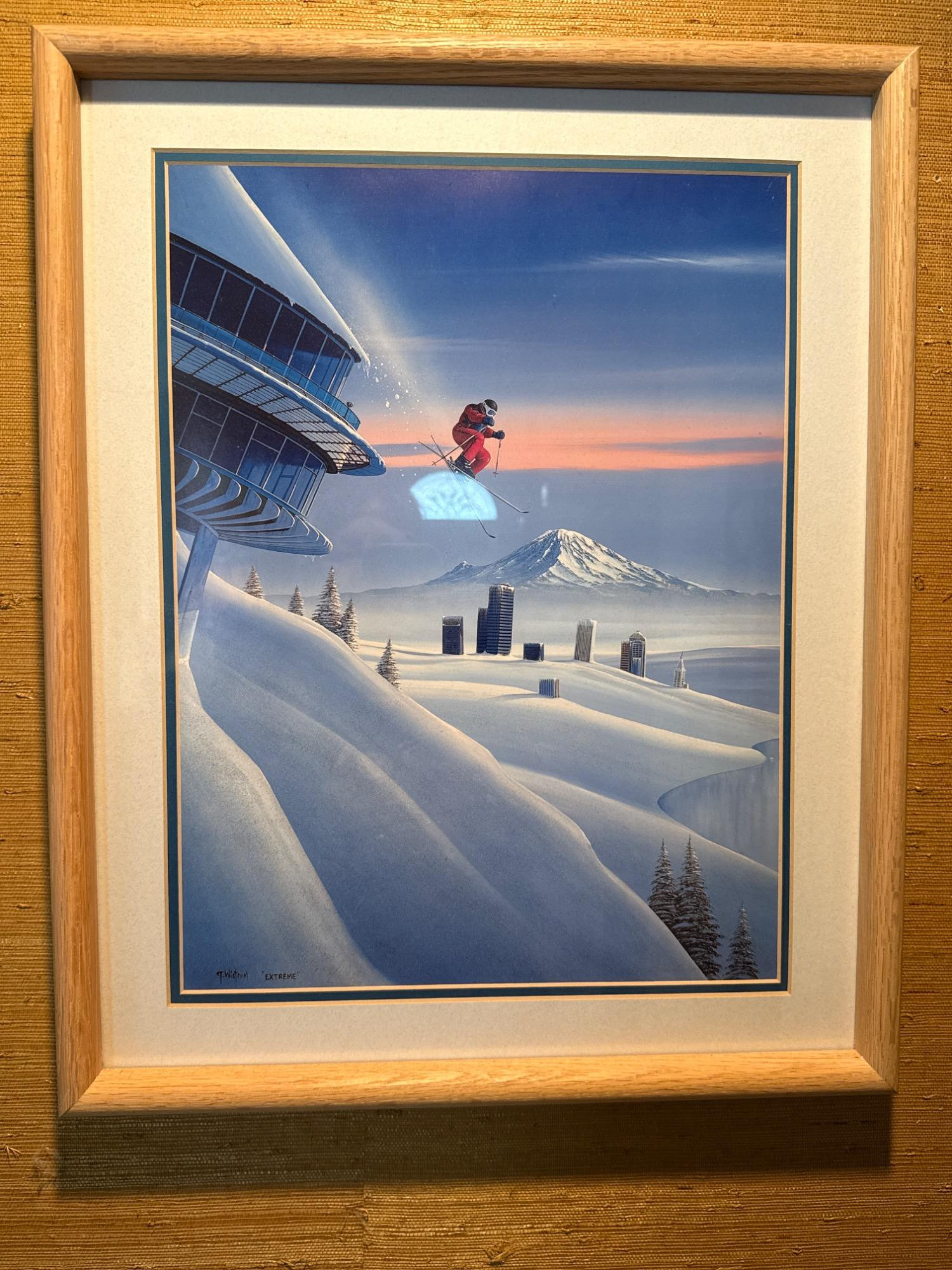 Experience the thrill of alpine adventure through this visually striking piece by T. Wistrom. "Extreme" captures a surreal winter sports moment as a skier launches off a dramatic slope beside the Seattle Space Needle, set against a majestic Mount Rainier backdrop. Artwork Details: Title: Extreme Artist: T. Wistrom Edition: Limited Edition Print, Hand-Signed & Numbered (#175 of 500) Signature: Signed front and back by the artist Dimensions (framed): 17" W x 21" T Medium: Print on paper (framed under glass) Style: Surreal / Futuristic Ski Landscape