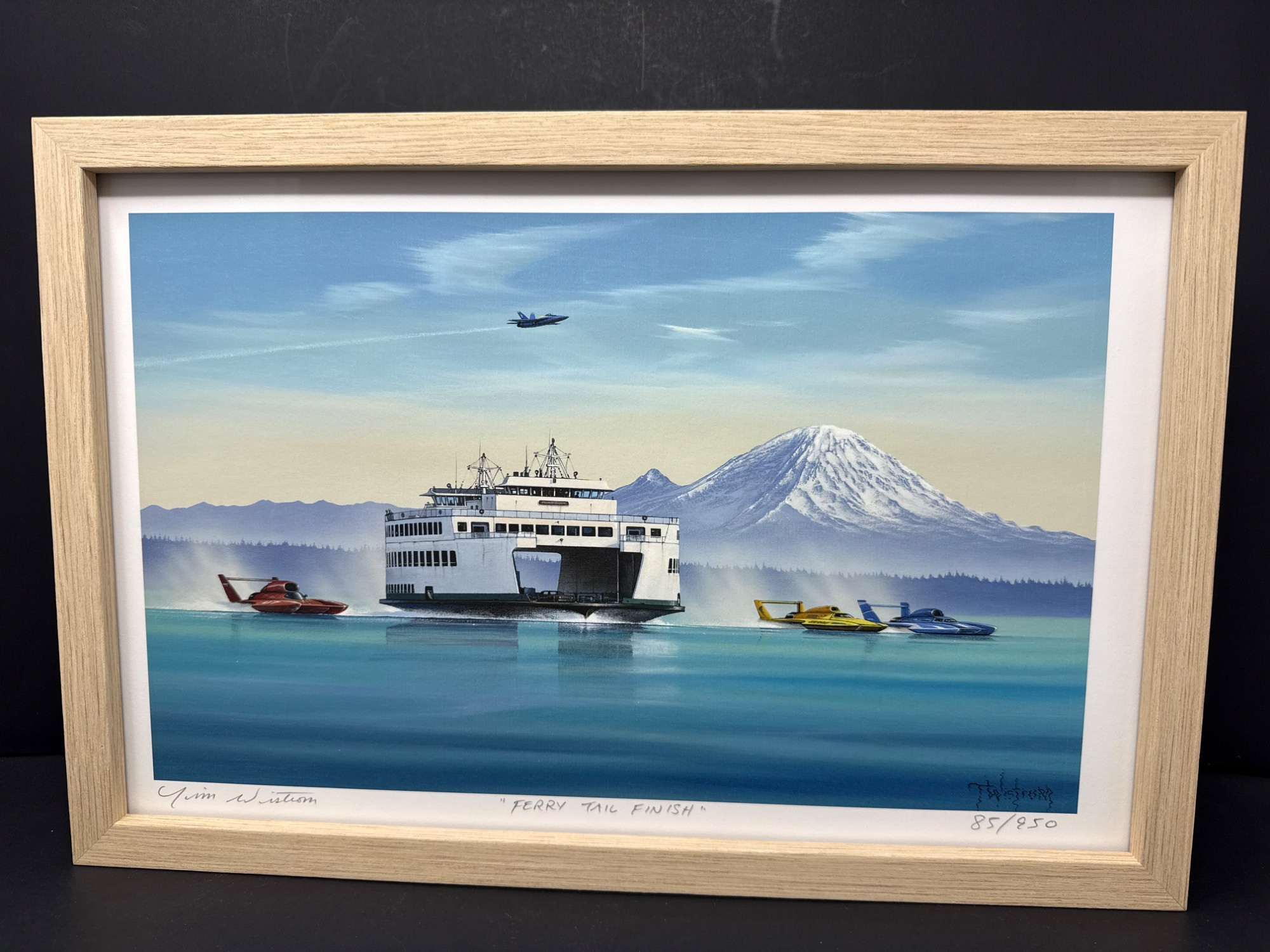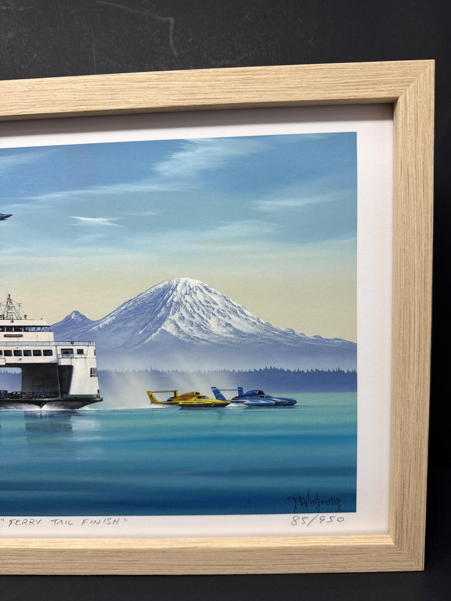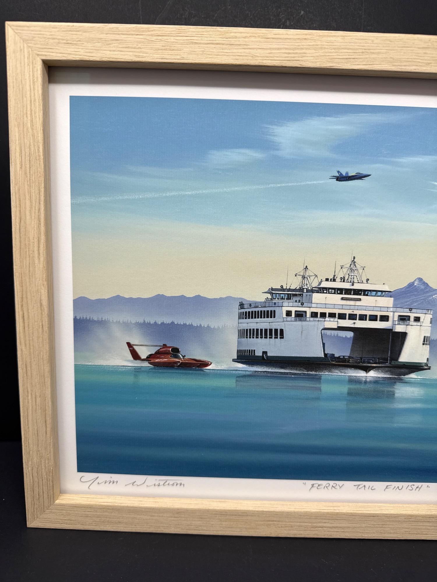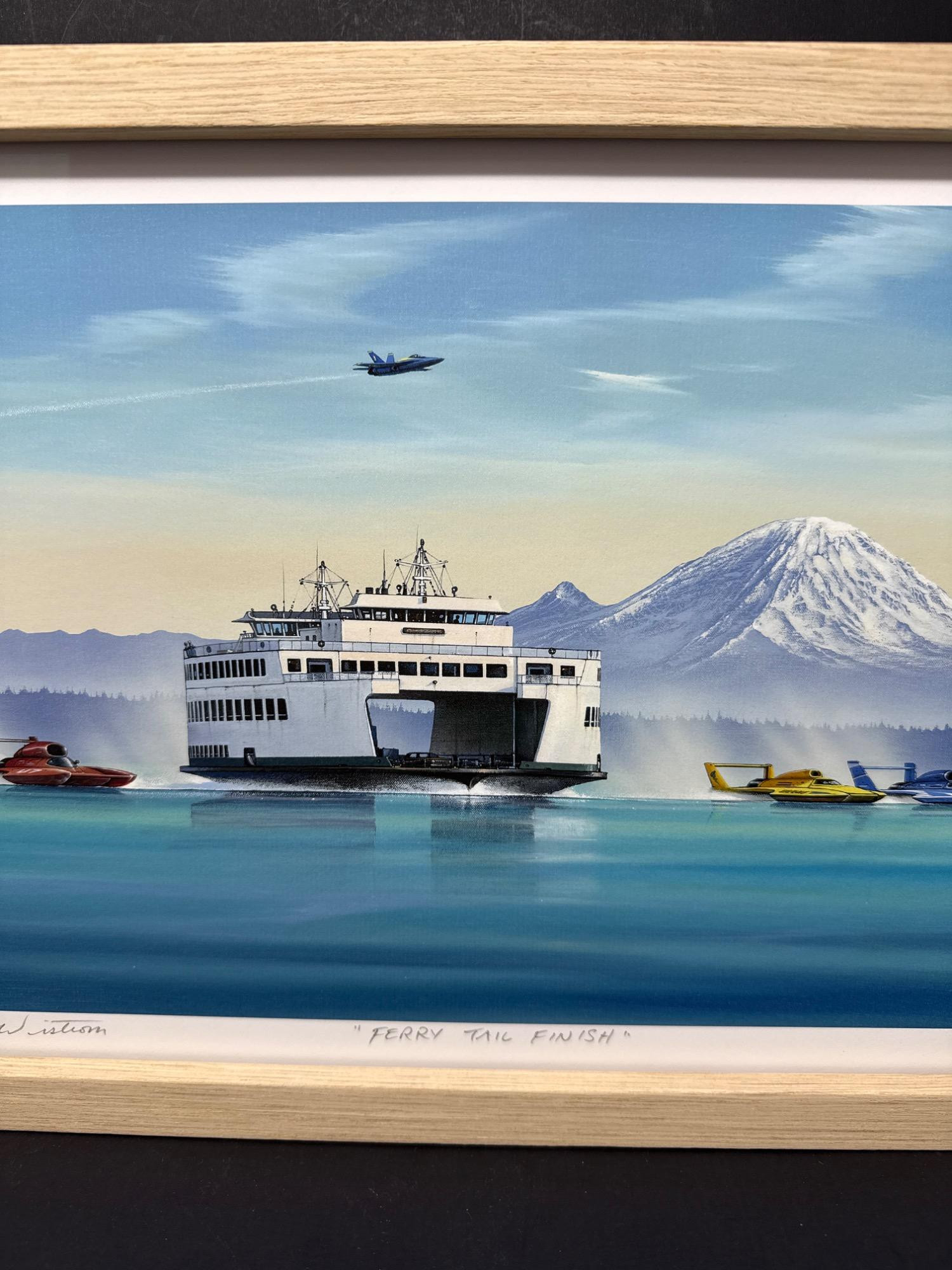Add a touch of whimsy and Pacific Northwest charm to your collection with this stunning limited edition print by renowned surrealist artist Tim Wistrom. Titled "Ferry Tail Finish", this piece blends realistic maritime scenery with imaginative twists—featuring a Washington State ferry accompanied by colorful hydroplanes and Mount Rainier in the background. Artist: Tim Wistrom Title: Ferry Tail Finish Edition: 85 of 950 Medium: Print on paper Signature: Hand-signed by the artist in pencil Condition: Professionally framed Size: 12.2” T x 18.2” L