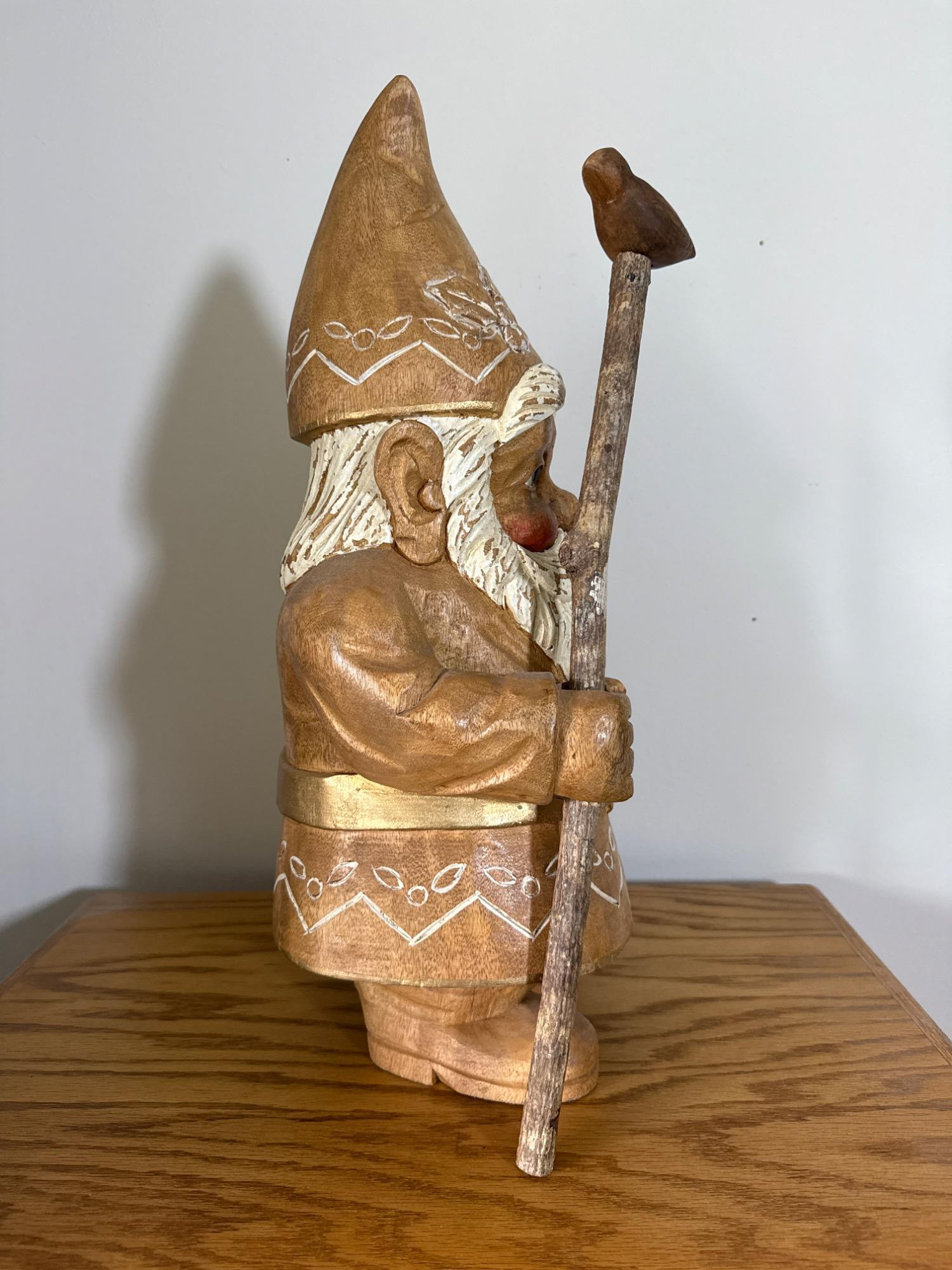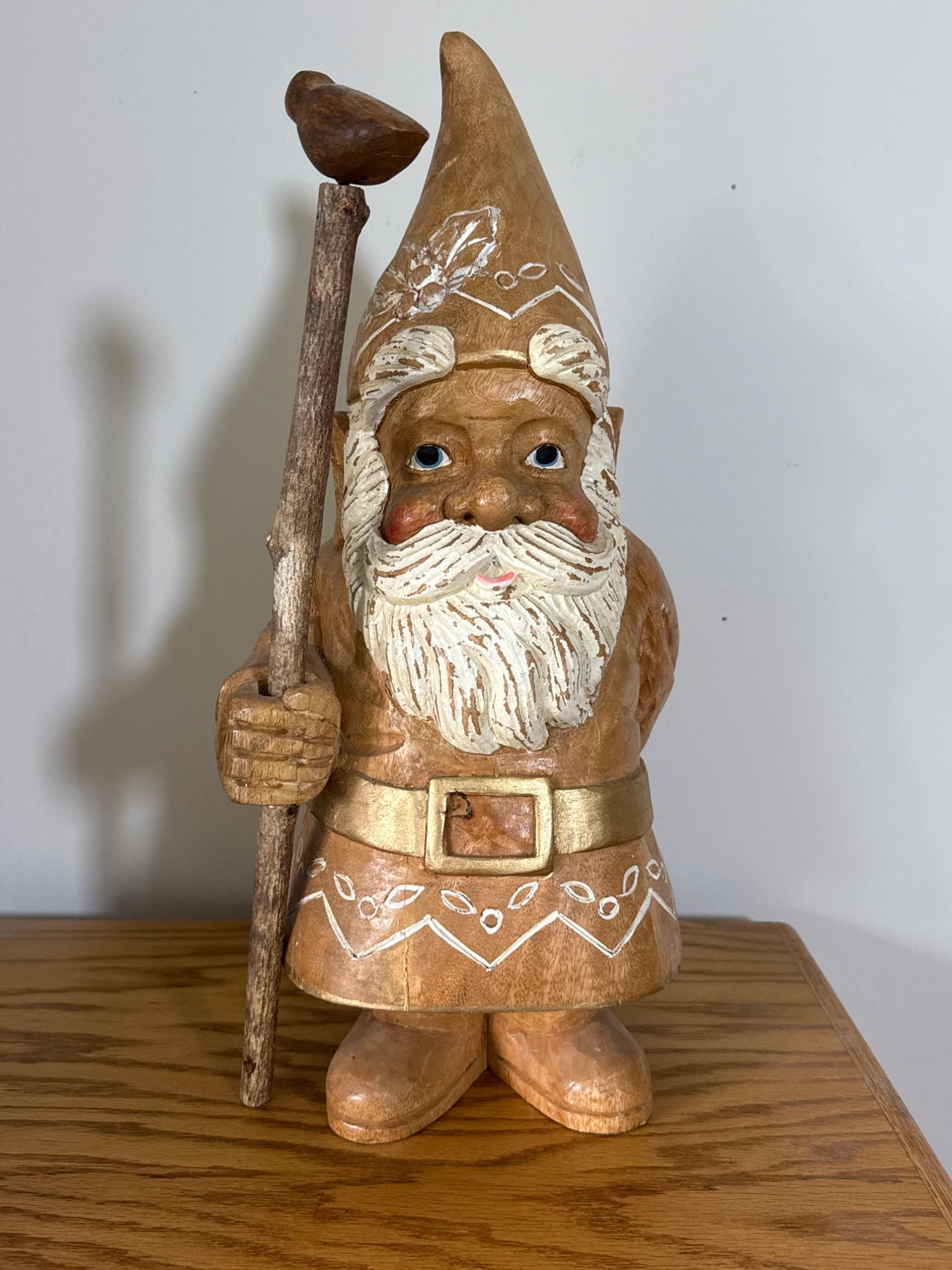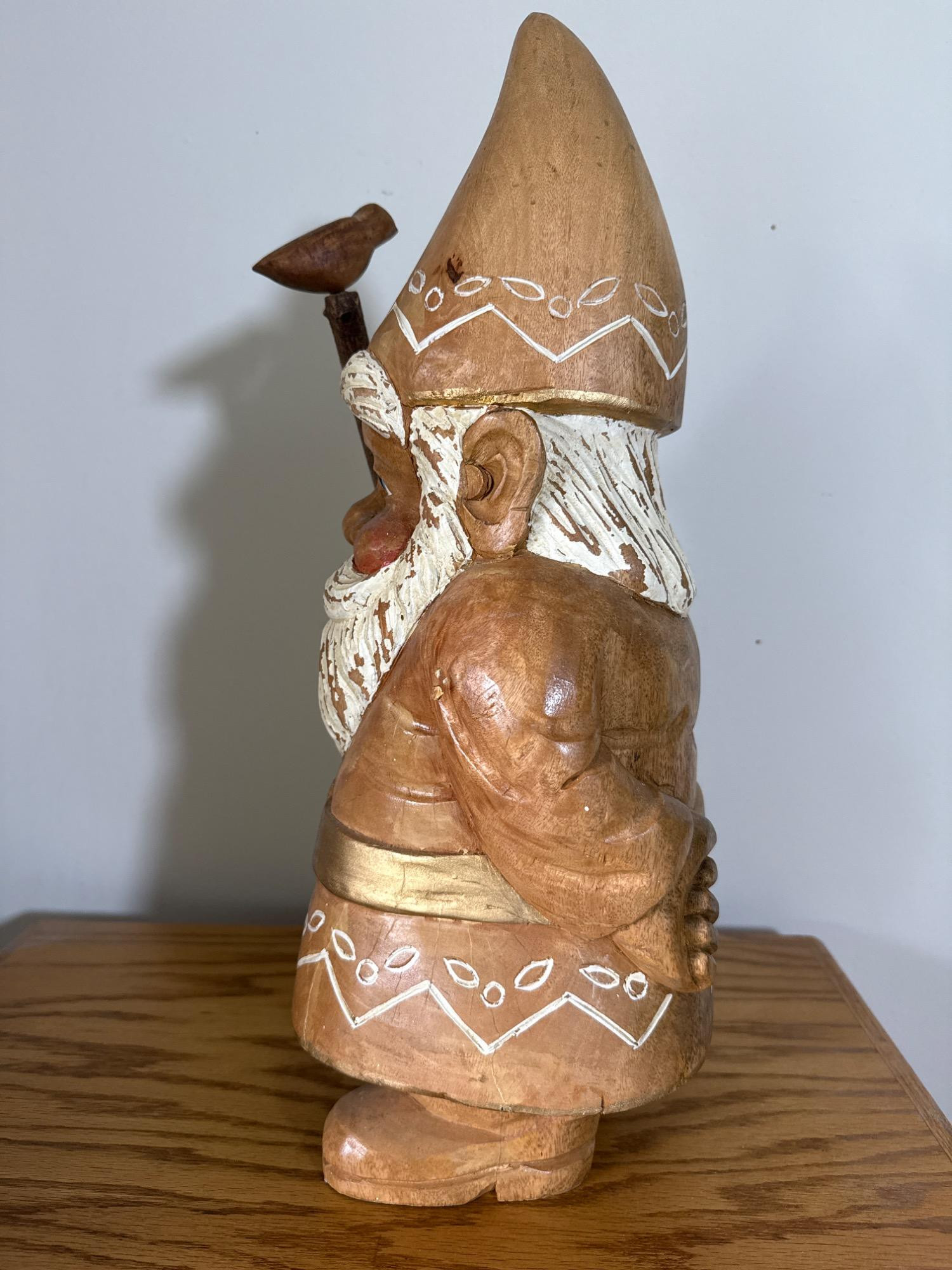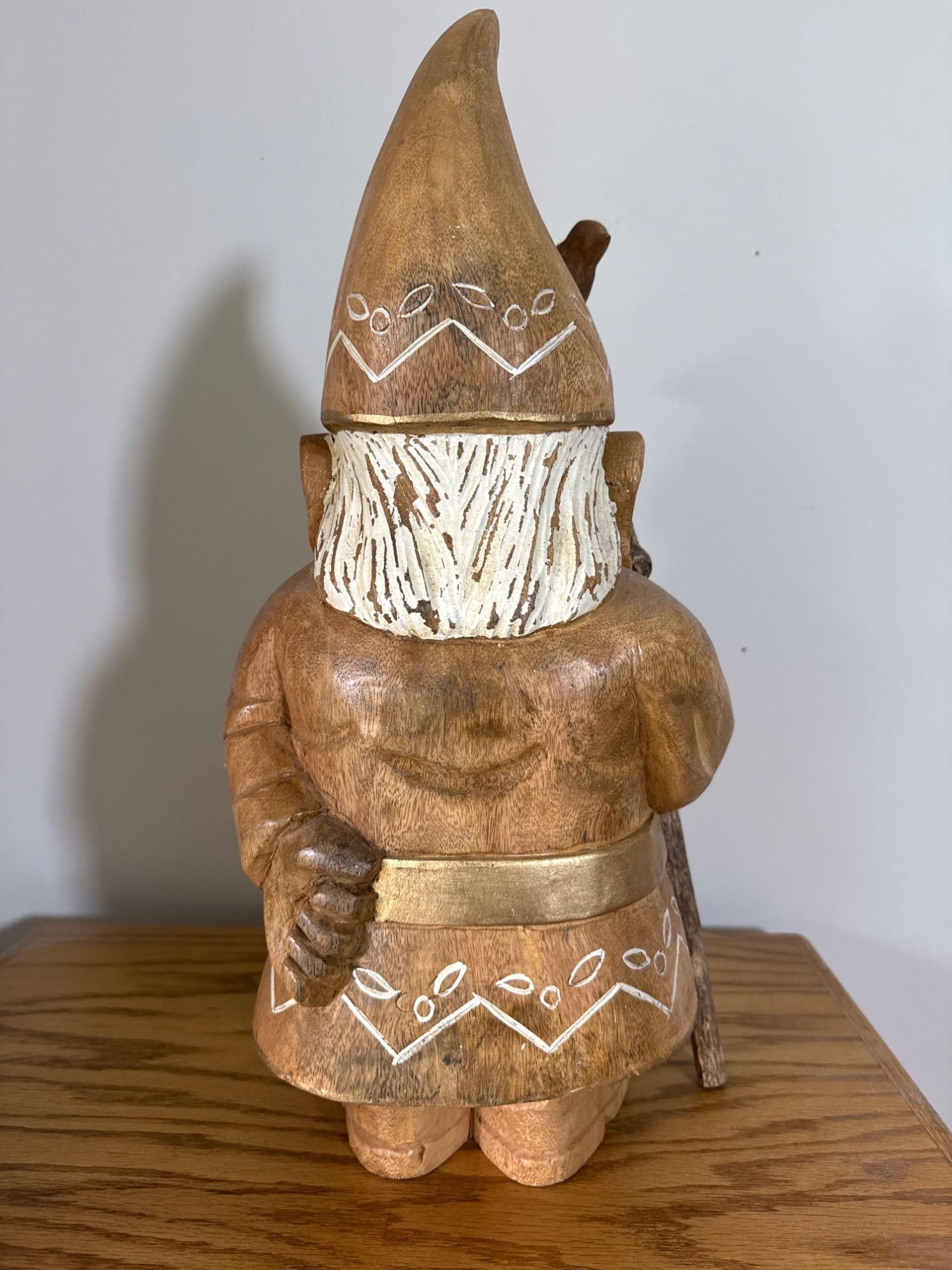 Add charm and character to your space with this beautifully crafted, large hand-carved wood gnome statue. Features: Material: Solid wood, hand-carved Dimensions: 22” H x 8” W x 9” L Design: Classic gnome figure with detailed facial features and flowing beard Pointed hat adorned with carved and painted white patterns Holds a tall staff topped with a small carved bird Decorative belt and folk-style carvings throughout
