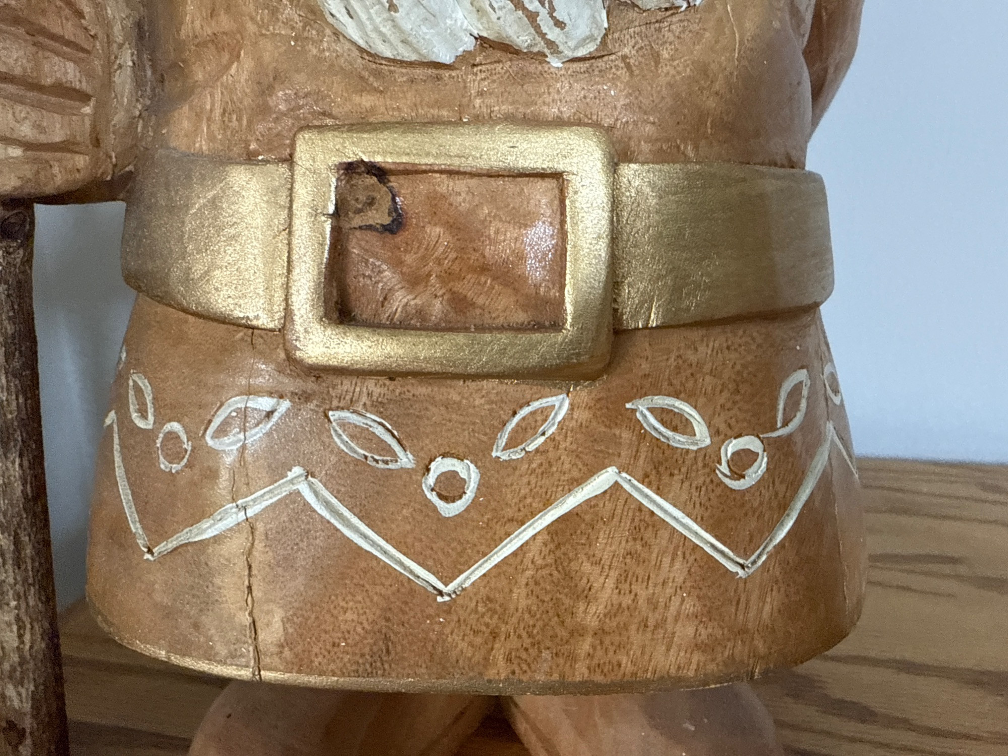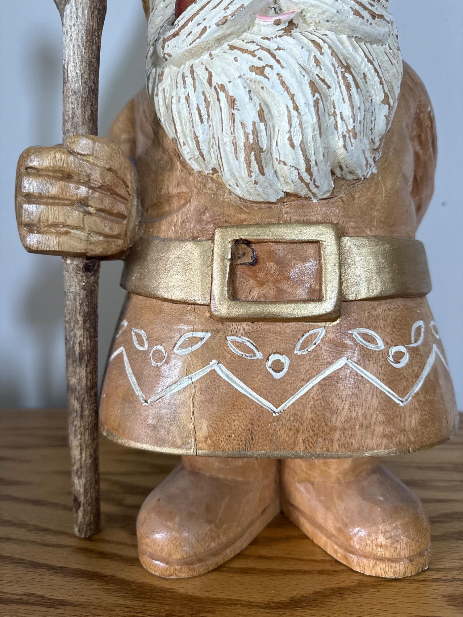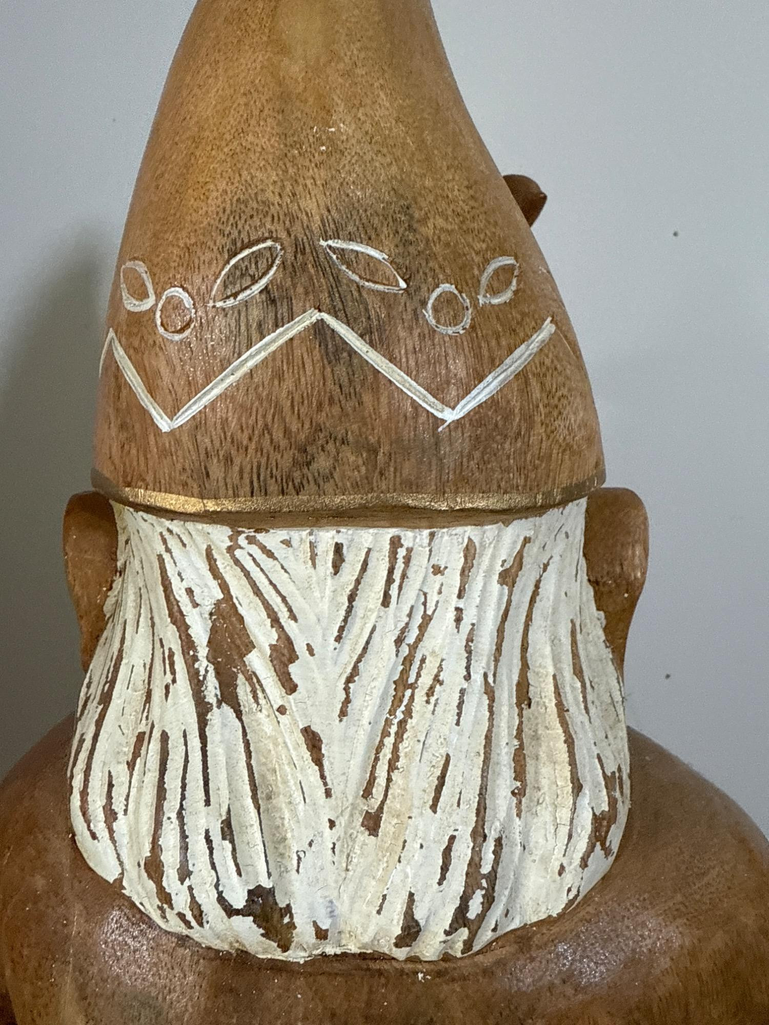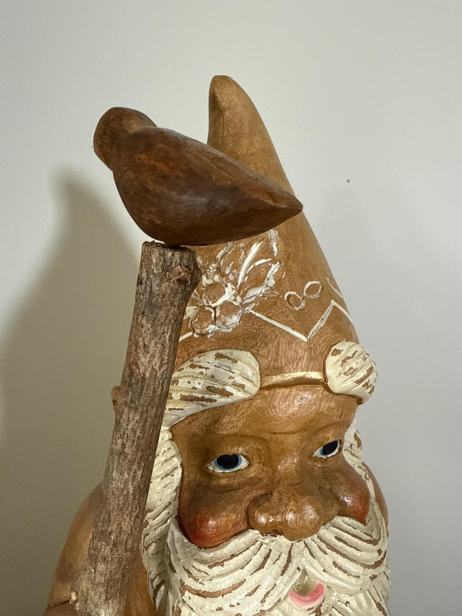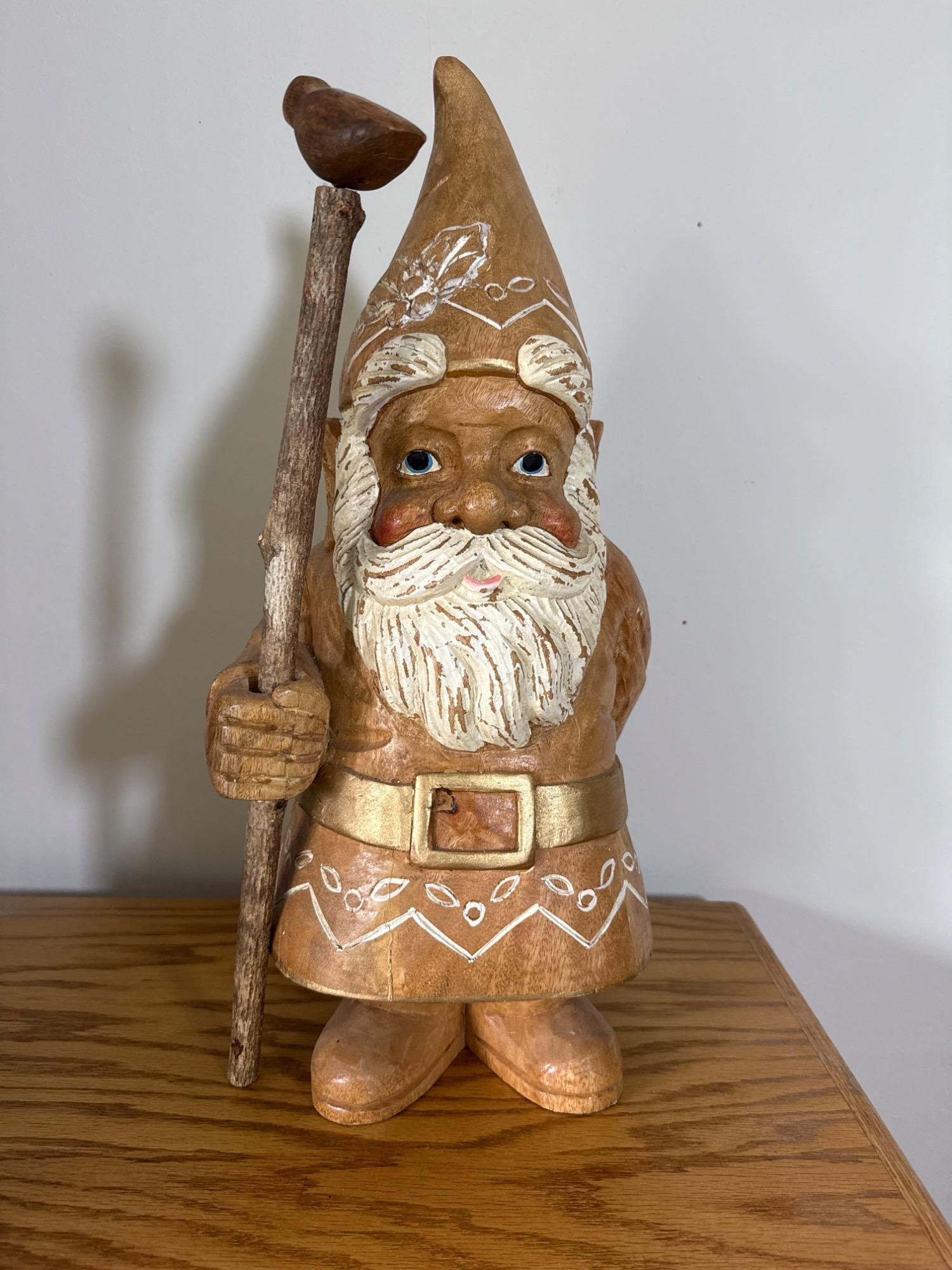 Add charm and character to your space with this beautifully crafted, large hand-carved wood gnome statue. Features: Material: Solid wood, hand-carved Dimensions: 22” H x 8” W x 9” L Design: Classic gnome figure with detailed facial features and flowing beard Pointed hat adorned with carved and painted white patterns Holds a tall staff topped with a small carved bird Decorative belt and folk-style carvings throughout
