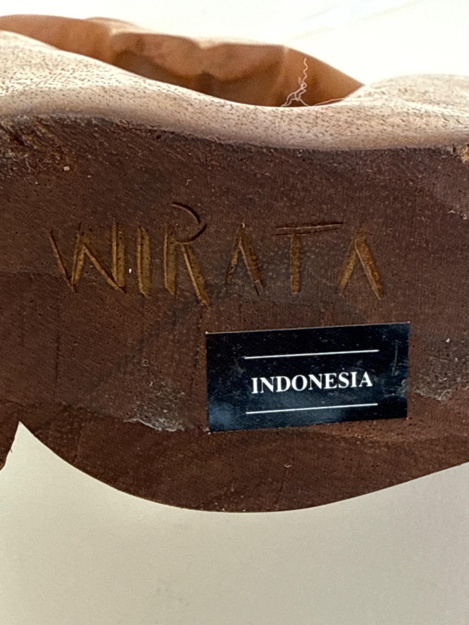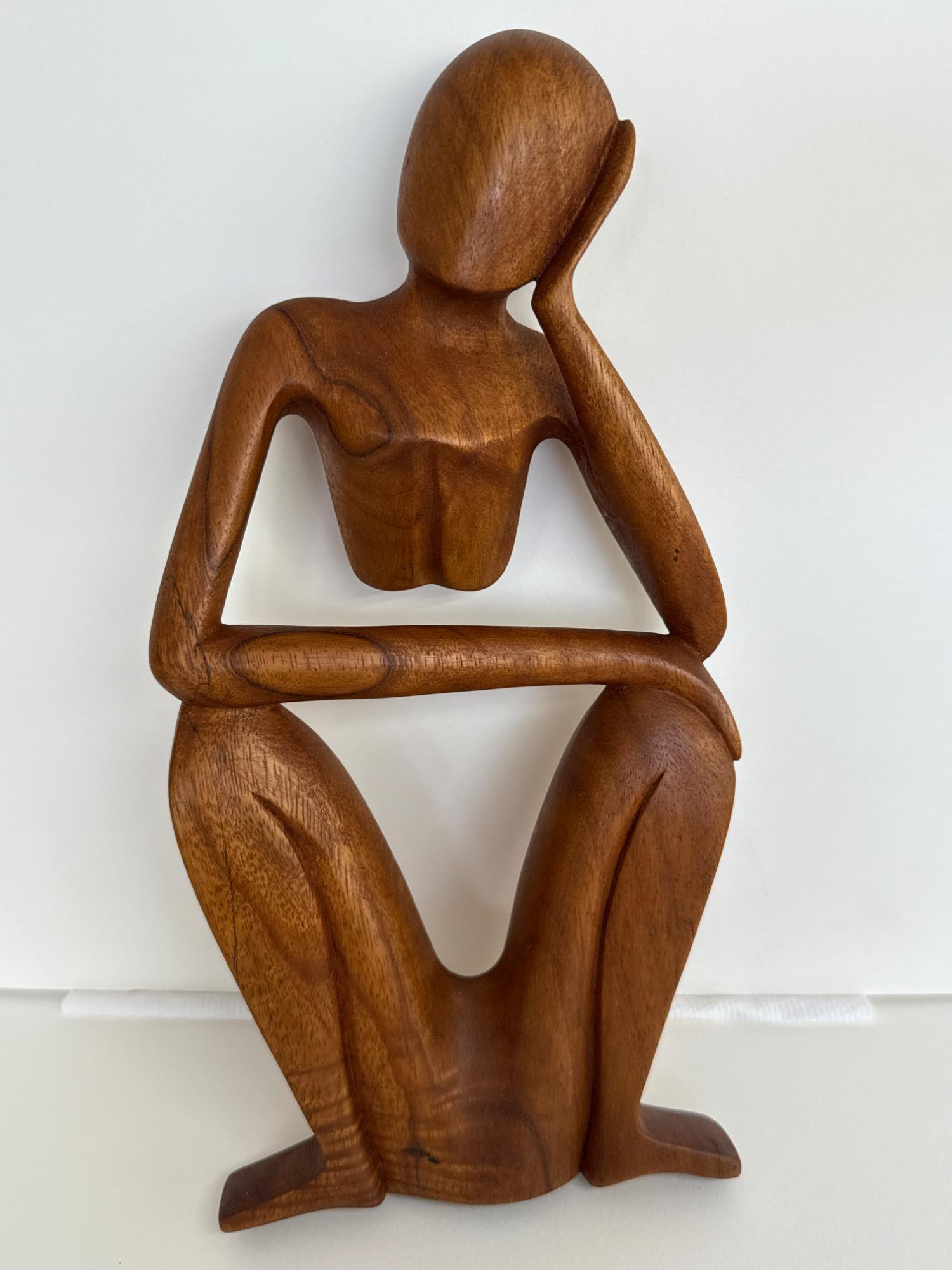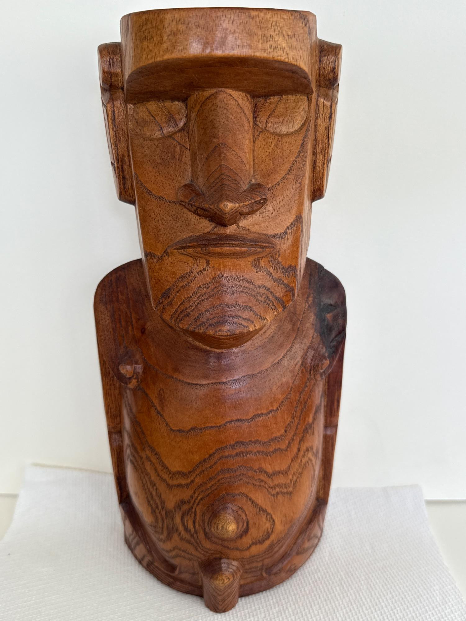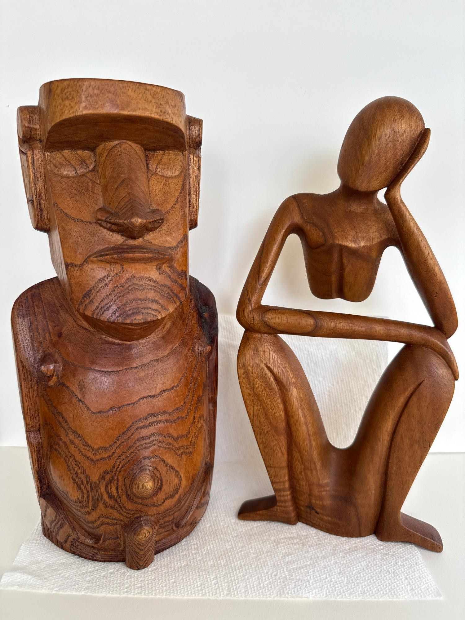 This stunning set features two hand-carved wooden sculptures, each rich in character and craftsmanship. Together, they offer a powerful blend of cultural depth and emotional expression. The first piece is a Maori-style Tiki statue, bold and detailed with traditional carvings and symbolic imagery on the reverse. This vintage carving may represent spiritual protection or ancestral wisdom. The base is marked with “50Q DOLLIR,” suggesting an earlier artisan price or identifier. The second is the serene “Thinking of You” sculpture, handcrafted by artist Wirata for Novica, in association with National Geographic. With clean, elegant lines, this figure captures a moment of contemplation and calm. It’s signed by the artist and labeled “INDONESIA” underneath. Dimensions: Maori statue: 12 inches tall × 5.5 inches long × 3 inches wide Novica "Thinking of You" sculpture: 12.2 inches tall × 6.2 inches wide