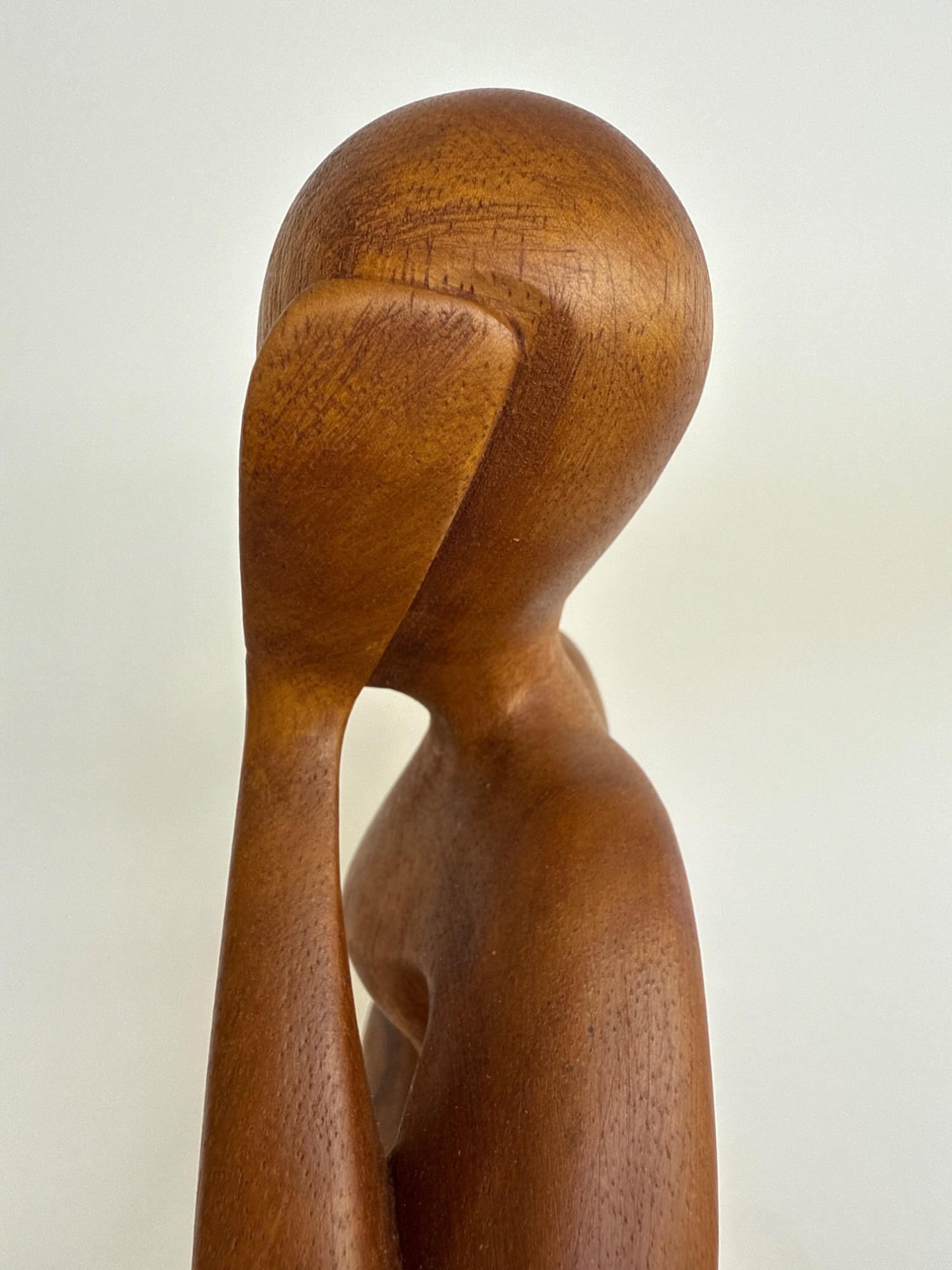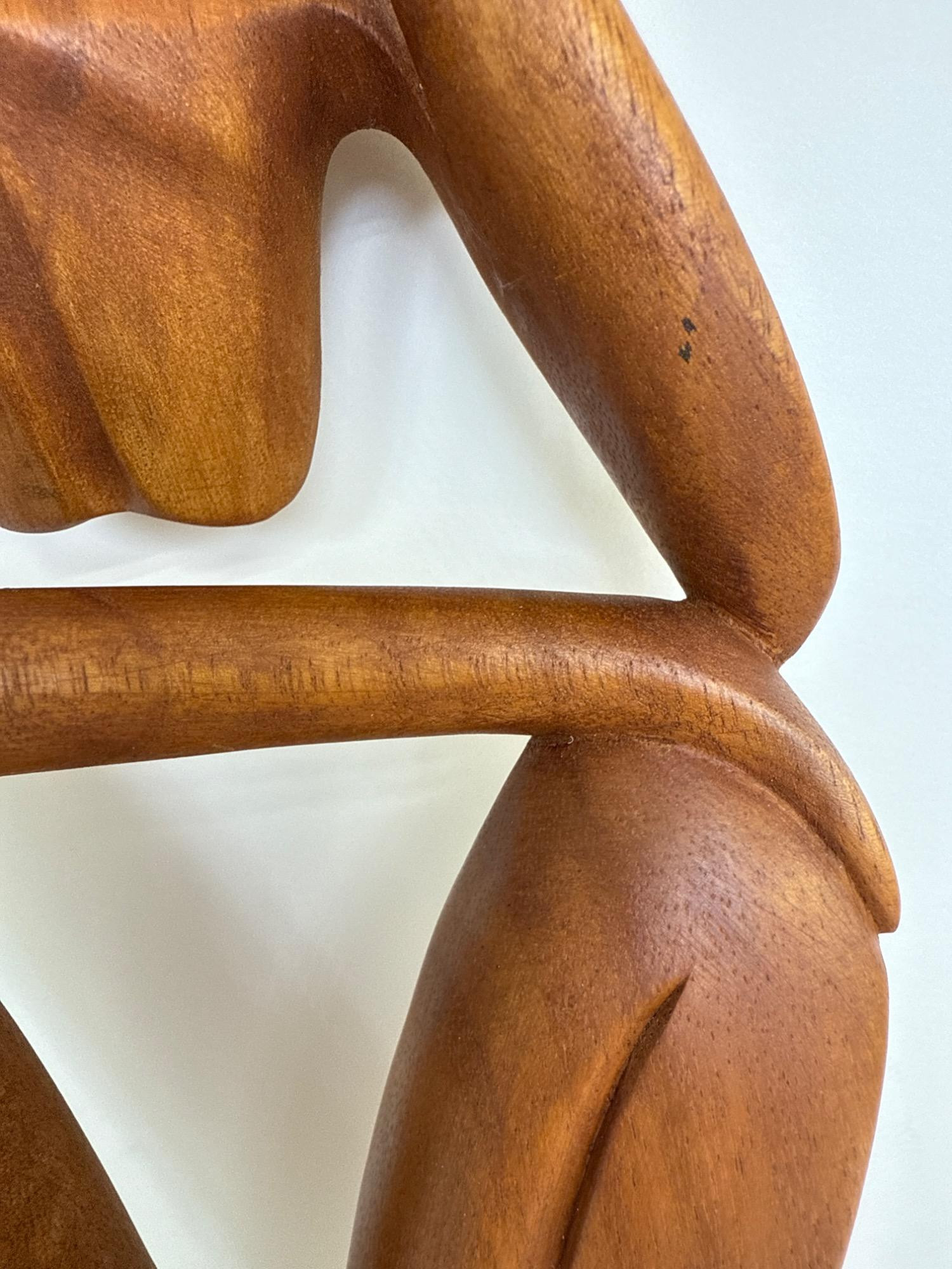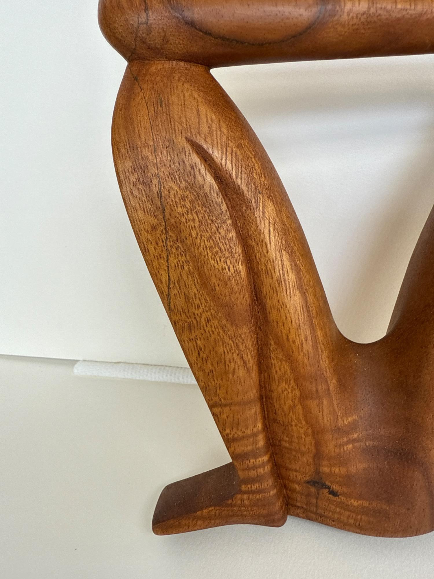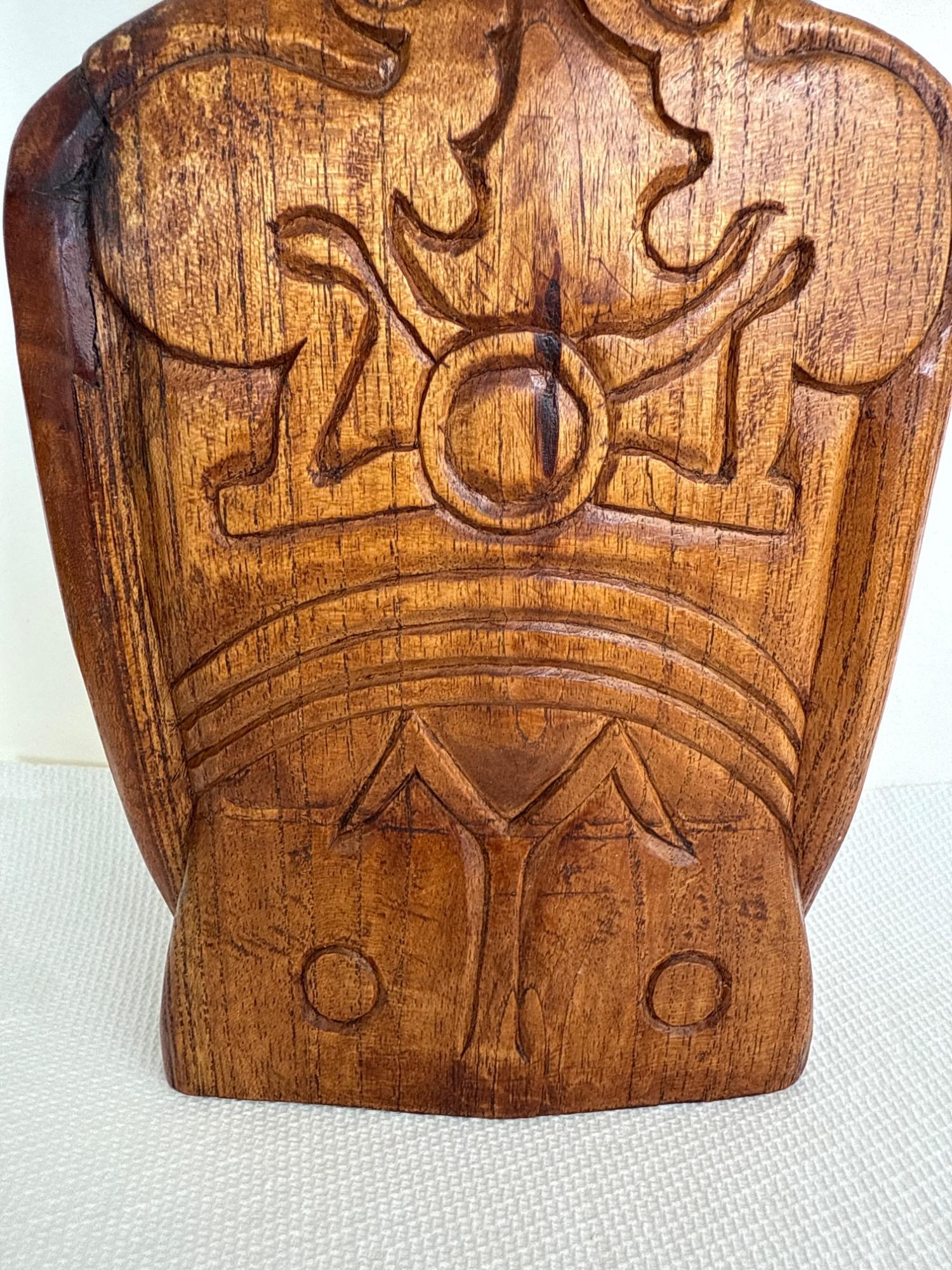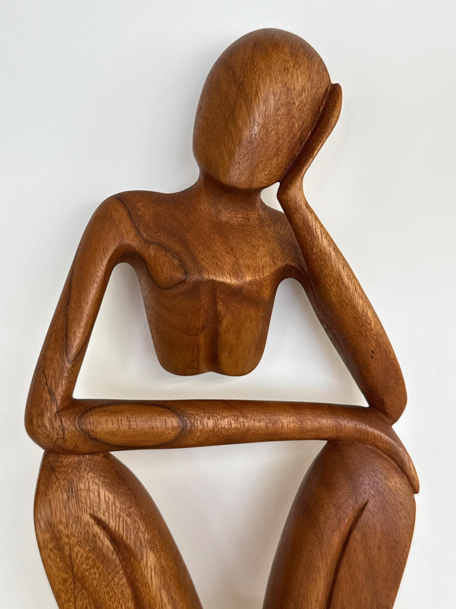This stunning set features two hand-carved wooden sculptures, each rich in character and craftsmanship. Together, they offer a powerful blend of cultural depth and emotional expression. The first piece is a Maori-style Tiki statue, bold and detailed with traditional carvings and symbolic imagery on the reverse. This vintage carving may represent spiritual protection or ancestral wisdom. The base is marked with “50Q DOLLIR,” suggesting an earlier artisan price or identifier. The second is the serene “Thinking of You” sculpture, handcrafted by artist Wirata for Novica, in association with National Geographic. With clean, elegant lines, this figure captures a moment of contemplation and calm. It’s signed by the artist and labeled “INDONESIA” underneath. Dimensions: Maori statue: 12 inches tall × 5.5 inches long × 3 inches wide Novica "Thinking of You" sculpture: 12.2 inches tall × 6.2 inches wide