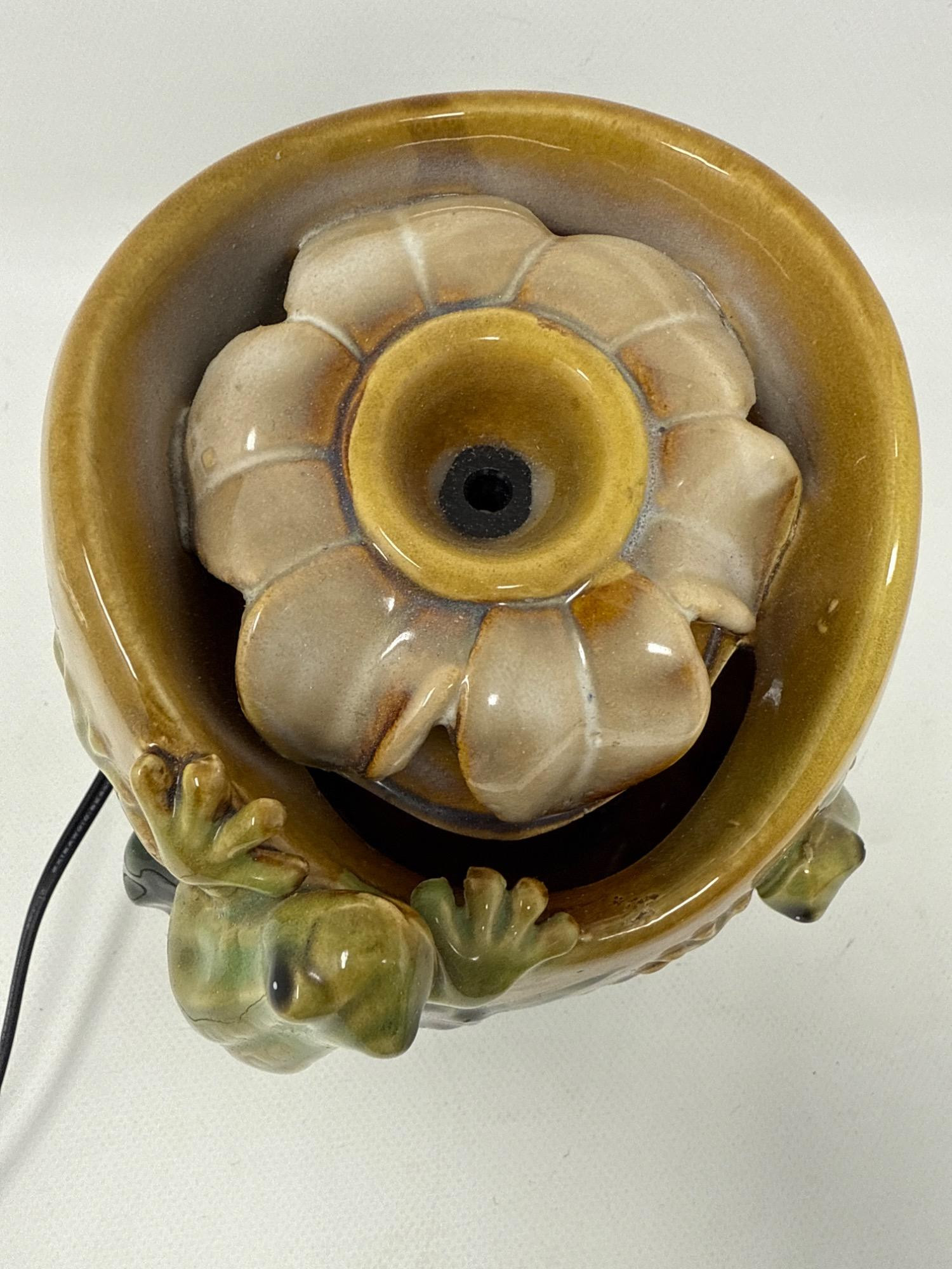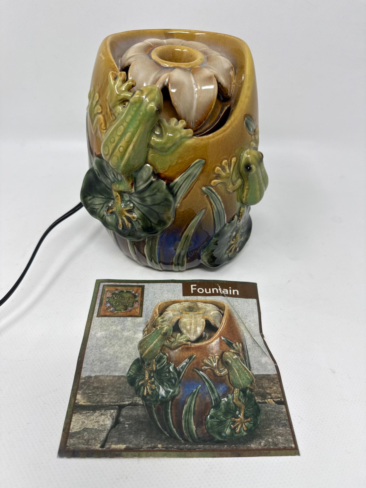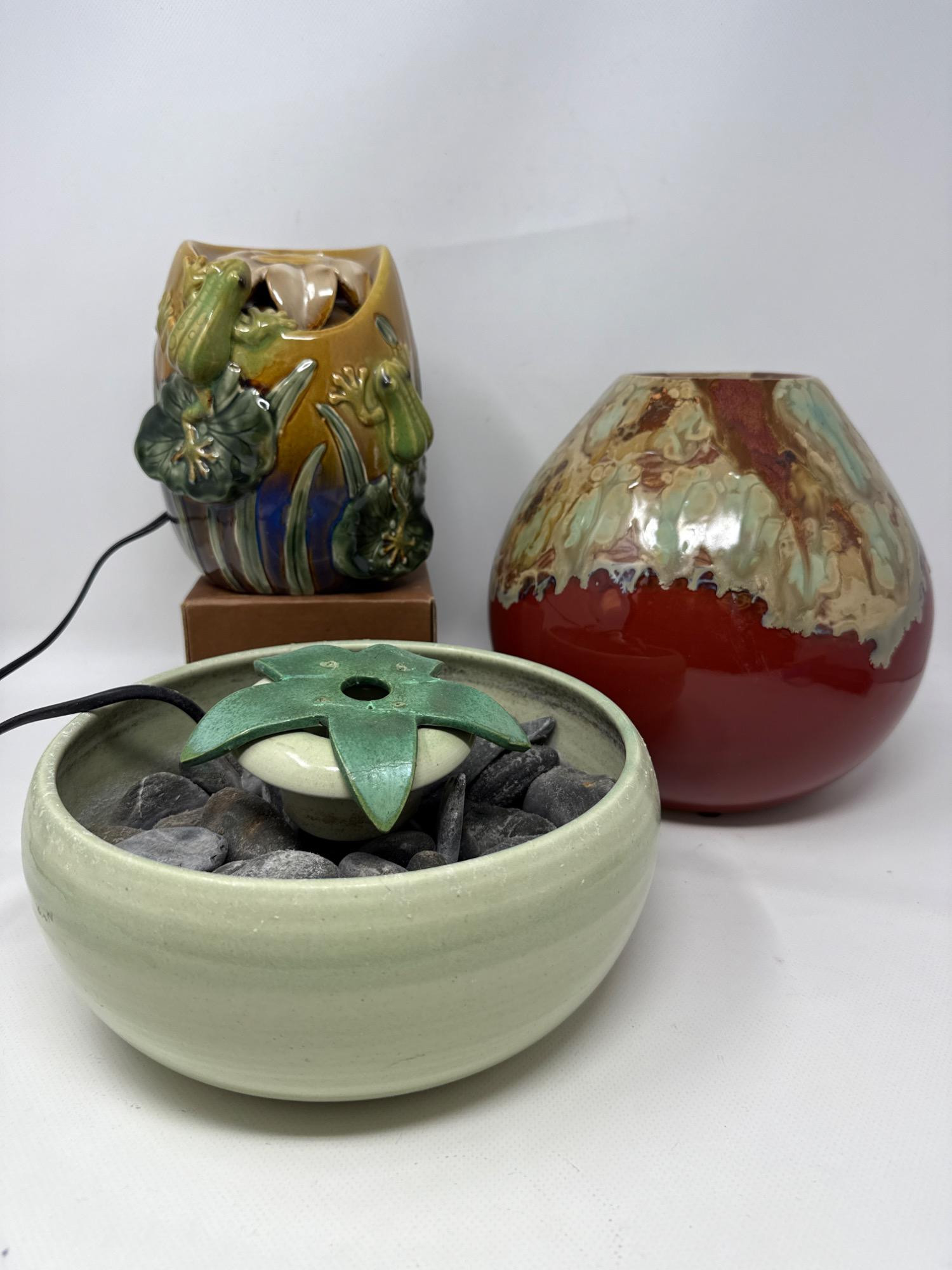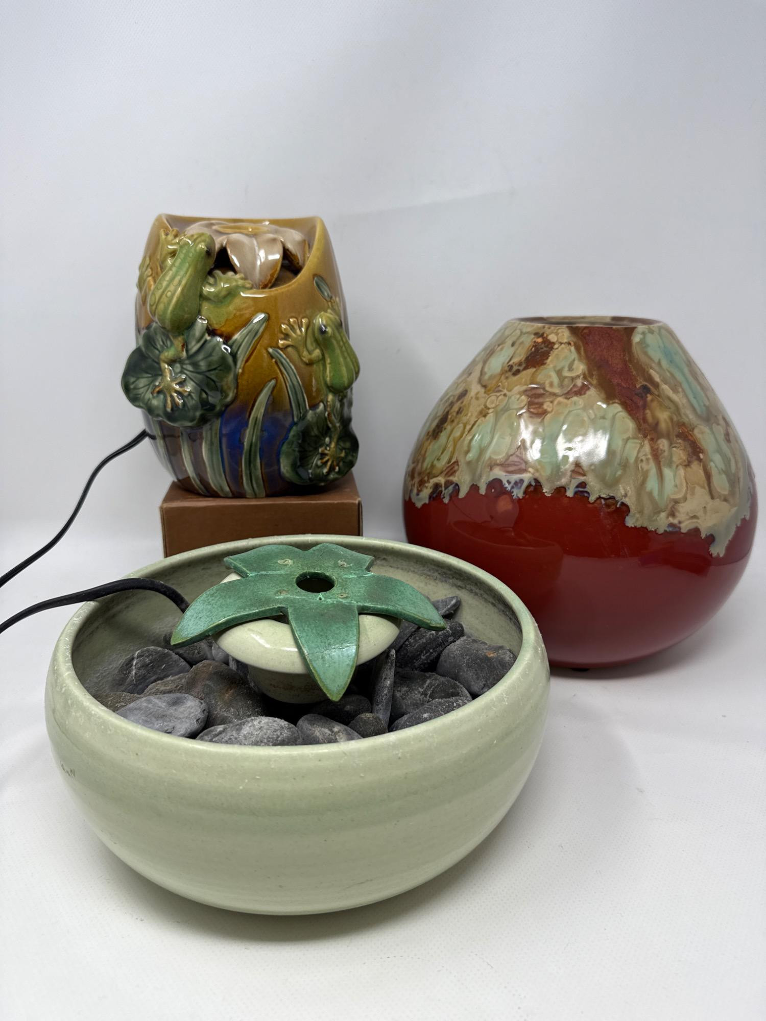 This charming trio includes two powered tabletop water fountains and one decorative fire pot. Green Leaf Fountain Dimensions: 4" T x 8.5" W Features: Green glazed ceramic bowl with black river rocks and a leaf-shaped spout. Powered up Frog Fountain (Nature’s Garden) Dimensions: 7" T x 5.5" W Features: Sculpted ceramic frogs and floral detailing. Includes original product card. Plug was unusual, not tested Drip Glaze Fire Pot Dimensions: 9" T x 8" W Features: Glossy red and multicolor drip glaze with brass