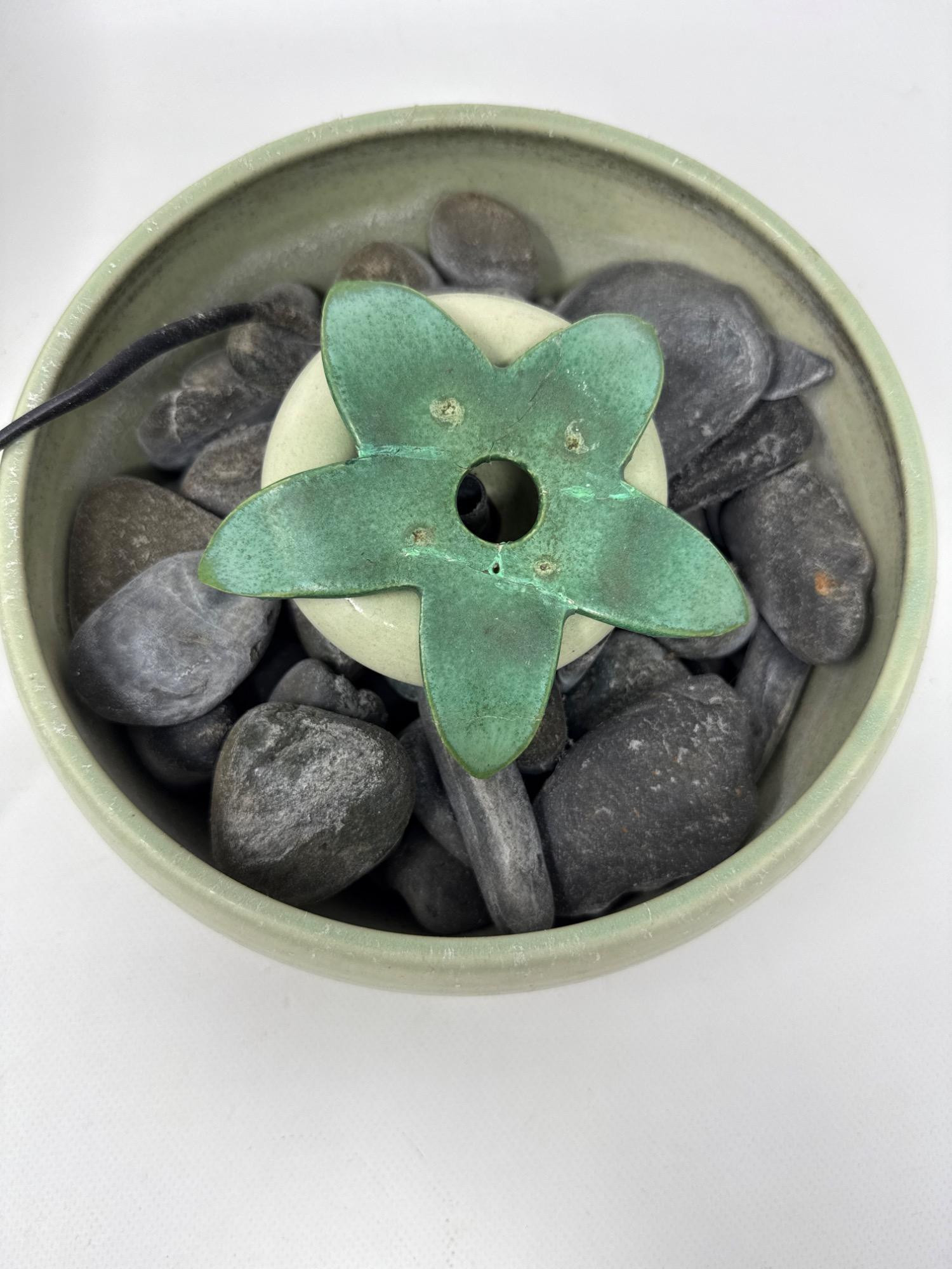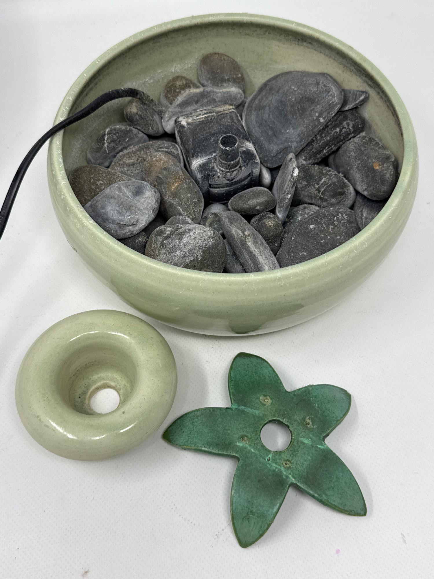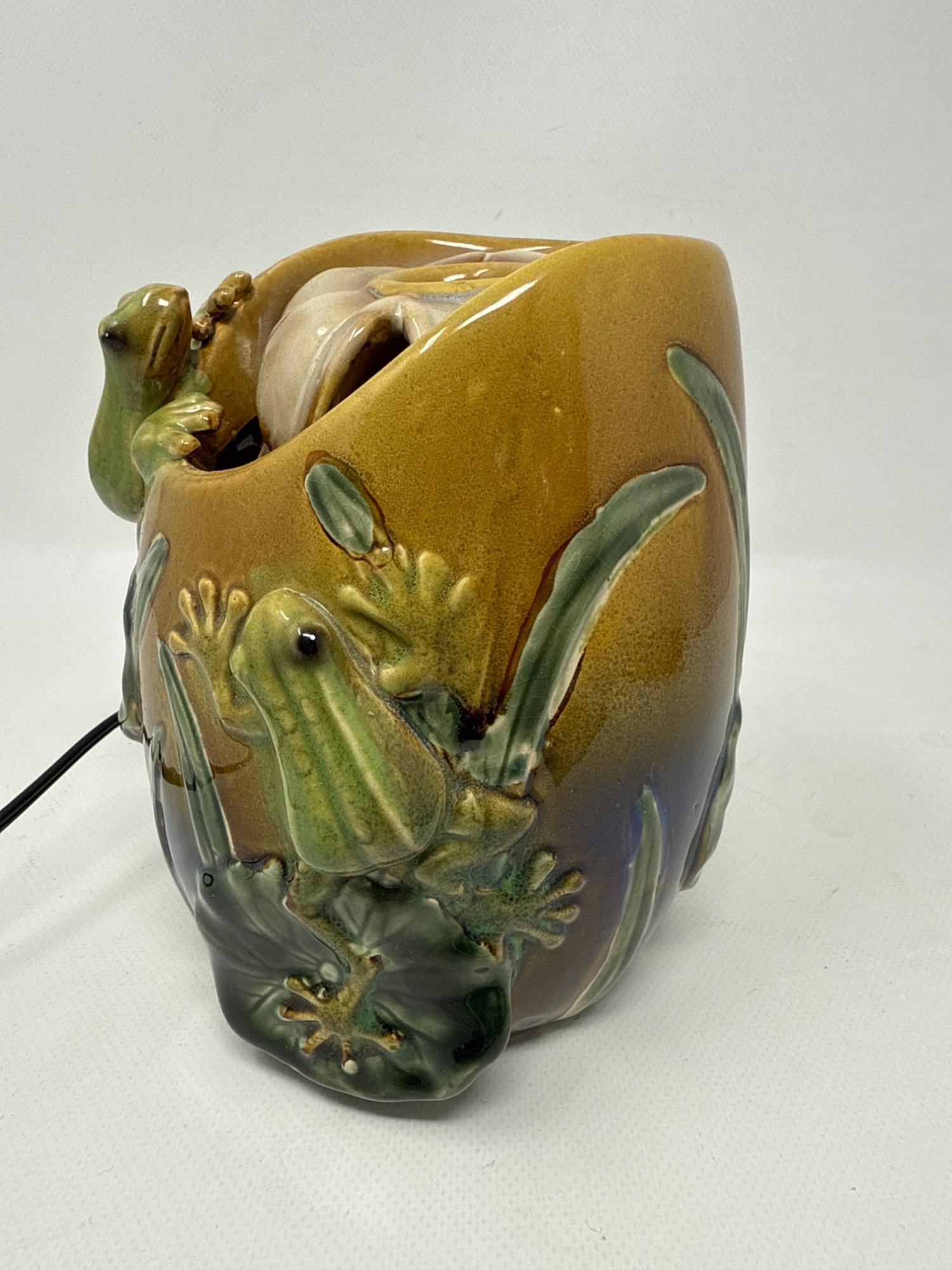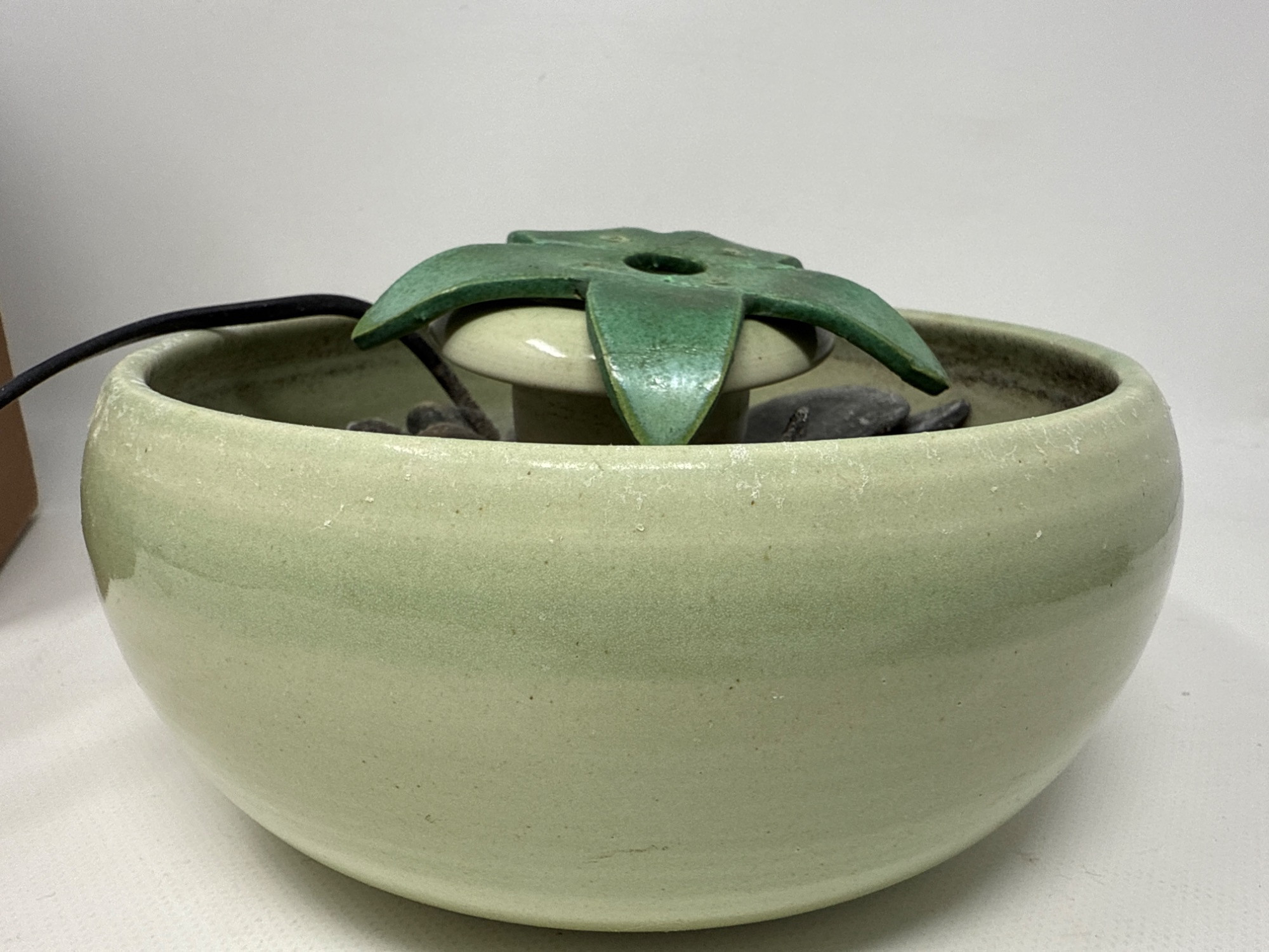 This charming trio includes two powered tabletop water fountains and one decorative fire pot. Green Leaf Fountain Dimensions: 4" T x 8.5" W Features: Green glazed ceramic bowl with black river rocks and a leaf-shaped spout. Powered up Frog Fountain (Nature’s Garden) Dimensions: 7" T x 5.5" W Features: Sculpted ceramic frogs and floral detailing. Includes original product card. Plug was unusual, not tested Drip Glaze Fire Pot Dimensions: 9" T x 8" W Features: Glossy red and multicolor drip glaze with brass