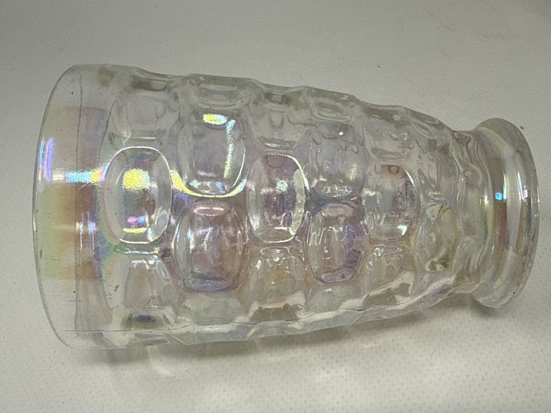 Bring timeless elegance to your glassware collection with this beautiful set of 2 vintage Federal Glass tumblers. Featuring the iconic Colonial pattern, these glasses boast a dazzling iridescent finish that reflects a rainbow of hues under the light. Made in the mid-20th century by the renowned Federal Glass Company, these pieces are a charming nod to vintage Americana. The textured honeycomb-like pattern adds both grip and vintage appeal. Highlights: Authentic mid-century Federal Glass Colonial pattern with vibrant iridescent sheen Unique texture and luster Size: 4.5" tall x 3.25" wide