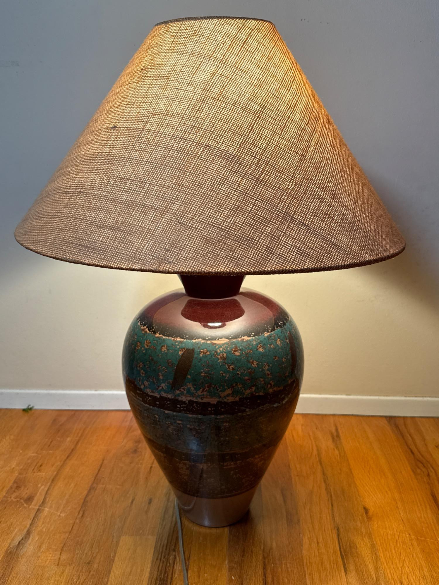 Bring bold style and artisan character into your space with this stunning large ceramic lamp. The base features a rich, high-gloss glaze in deep crimson and turquoise with earthy, speckled undertones and subtle banding—offering a beautifully organic, textured look. Topped with a wide woven natural-fiber shade that adds warmth and a soft ambient glow, this piece makes a statement both lit and unlit. Dimensions: Approx. 30" tall with shade, 19" without shade Base Diameter: Approx. 9.5" Condition: Excellent – No chips or cracks Shade: Included, great condition Style: Mid-century modern / boho / eclectic