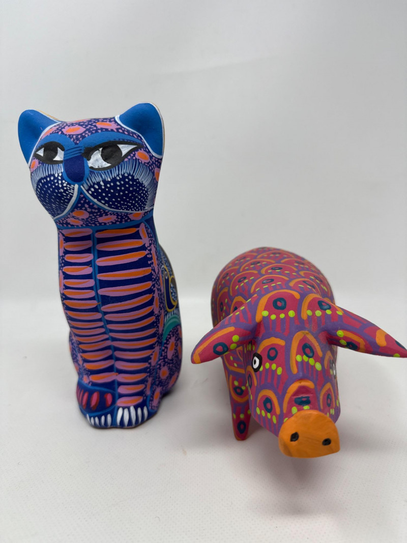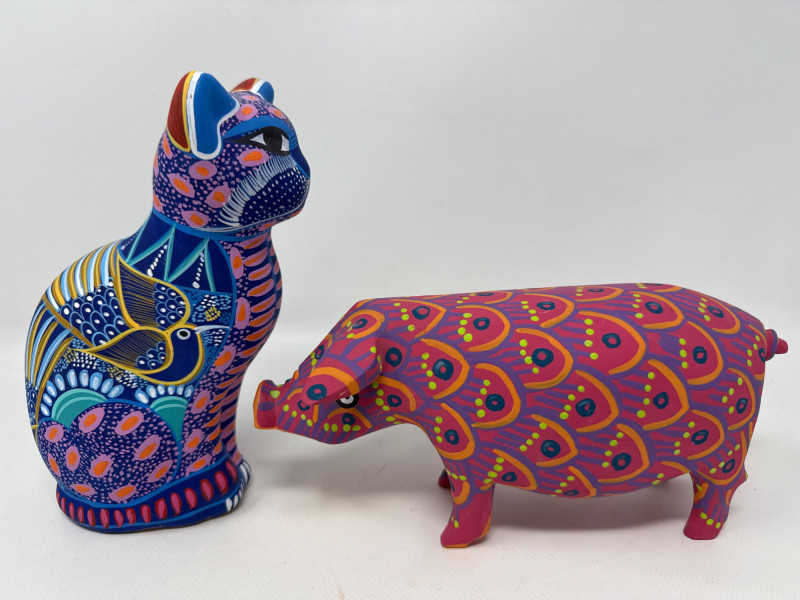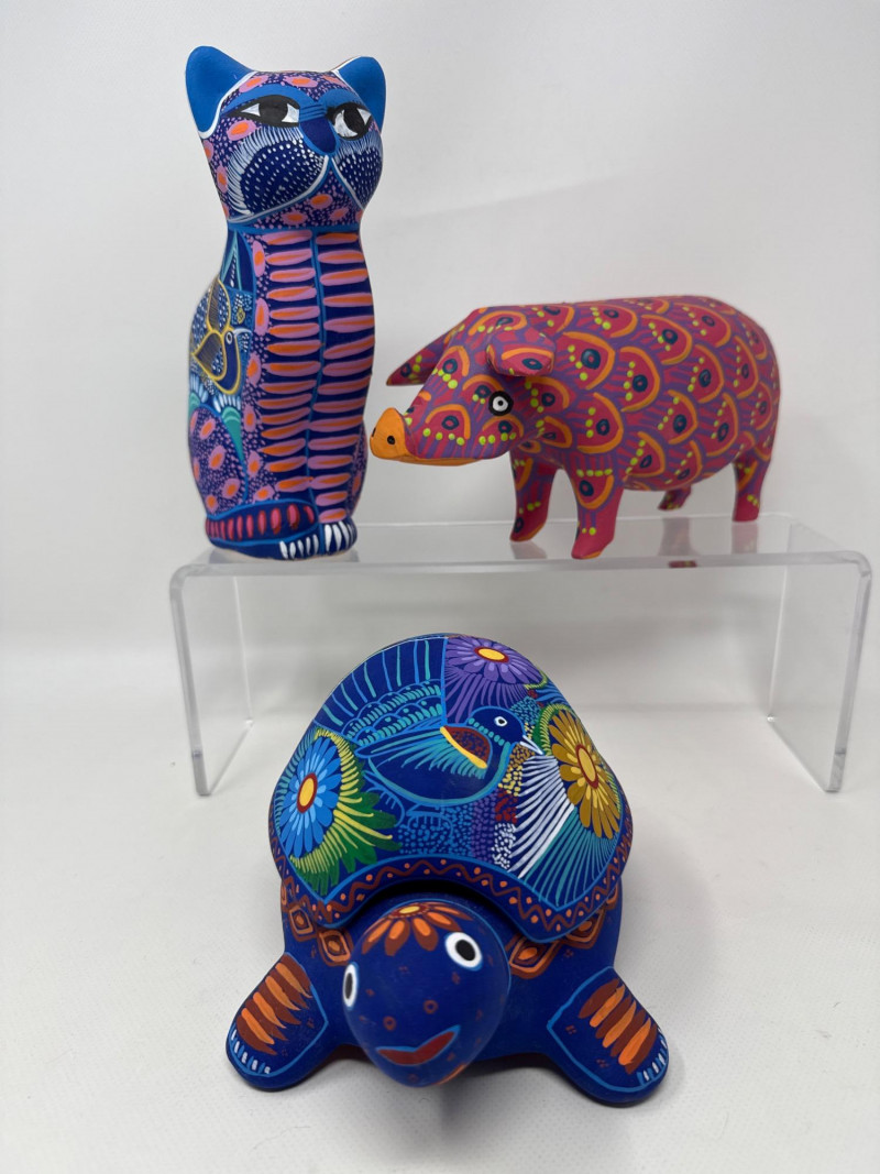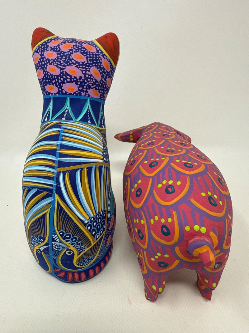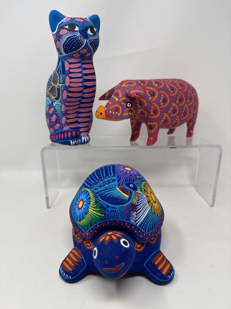 Add a burst of color and culture to your space with this vibrant trio of hand-painted clay animals. These delightful pieces hail from Mexico and Zimbabwe and feature intricate patterns and bold color palettes that showcase each region's artistic flair. Turtle – Handcrafted in Mexico, signed “Rufina” with “Hecho en Mexico” inscribed on the base. Measures approximately 5" tall x 8" long. Decorated with birds and flowers in a vivid, multicolor palette. Pig – Made in Zimbabwe. Measures approximately 4.5" tall x 9.5" long. Features bold peacock-feather inspired patterns in pink, orange, and green. Cat – Also from Zimbabwe. Measures approximately 8" tall x 4.5" wide. Painted in cool blues and warm pinks with detailed striping and patterns.