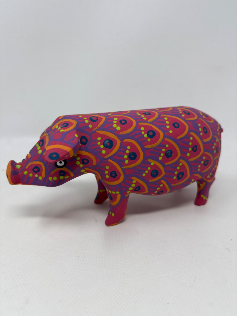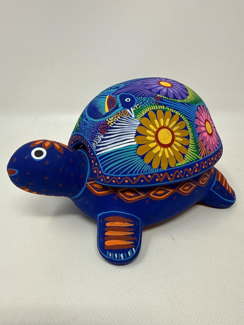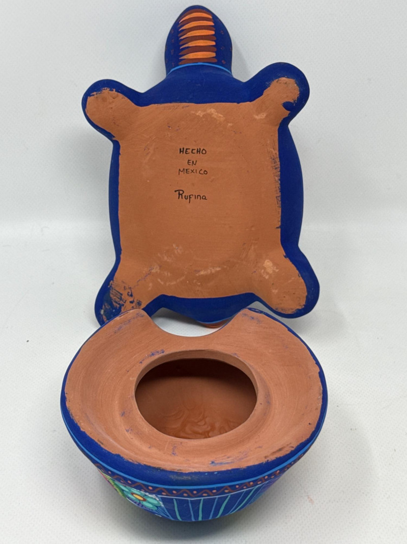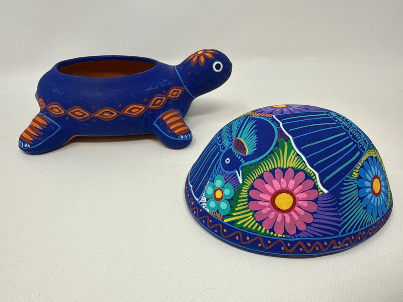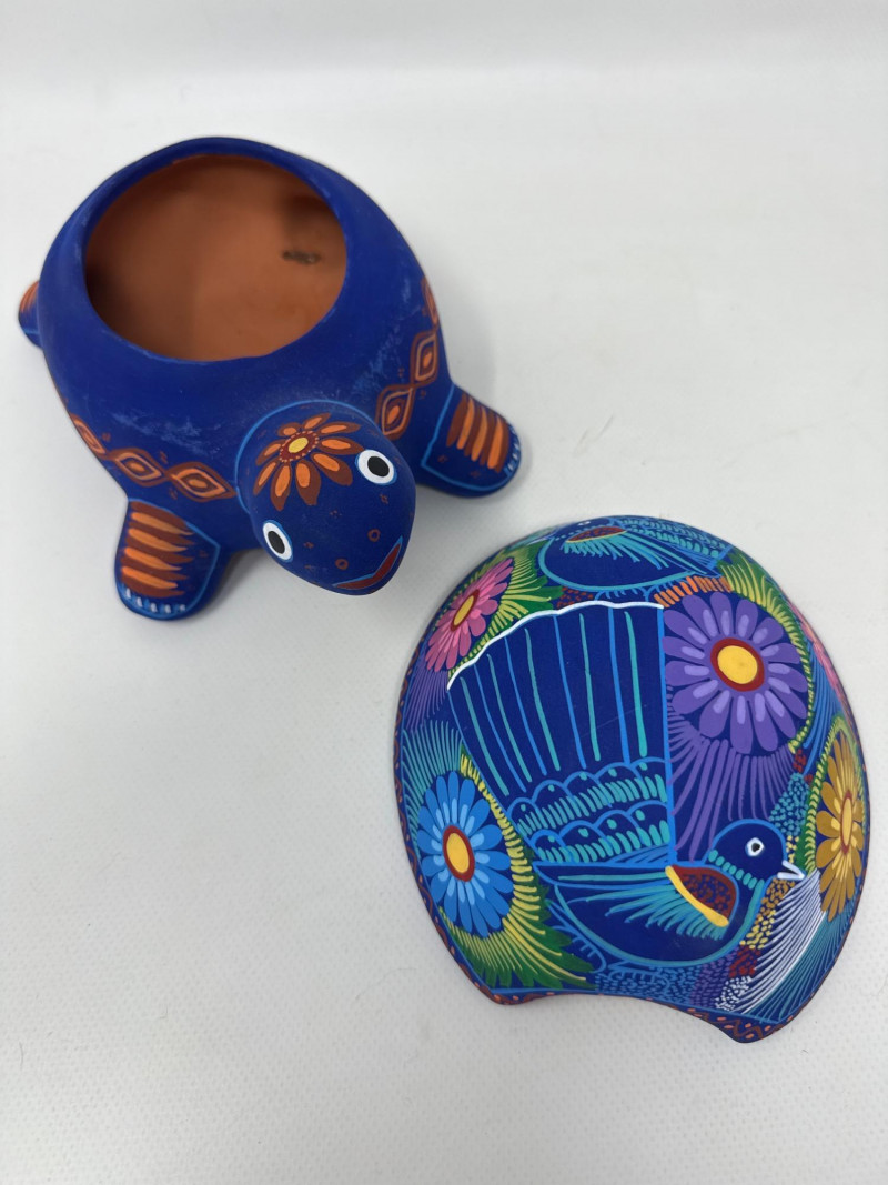 Add a burst of color and culture to your space with this vibrant trio of hand-painted clay animals. These delightful pieces hail from Mexico and Zimbabwe and feature intricate patterns and bold color palettes that showcase each region's artistic flair. Turtle – Handcrafted in Mexico, signed “Rufina” with “Hecho en Mexico” inscribed on the base. Measures approximately 5" tall x 8" long. Decorated with birds and flowers in a vivid, multicolor palette. Pig – Made in Zimbabwe. Measures approximately 4.5" tall x 9.5" long. Features bold peacock-feather inspired patterns in pink, orange, and green. Cat – Also from Zimbabwe. Measures approximately 8" tall x 4.5" wide. Painted in cool blues and warm pinks with detailed striping and patterns.