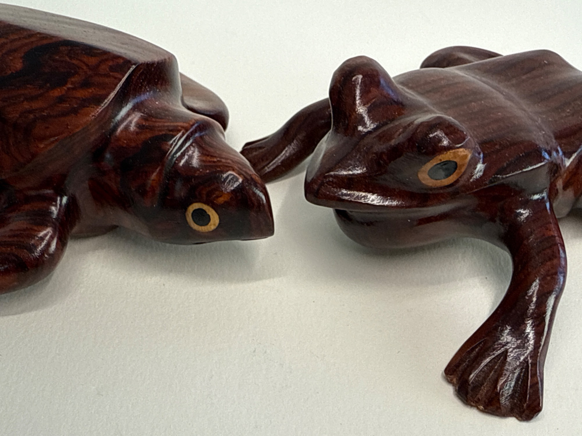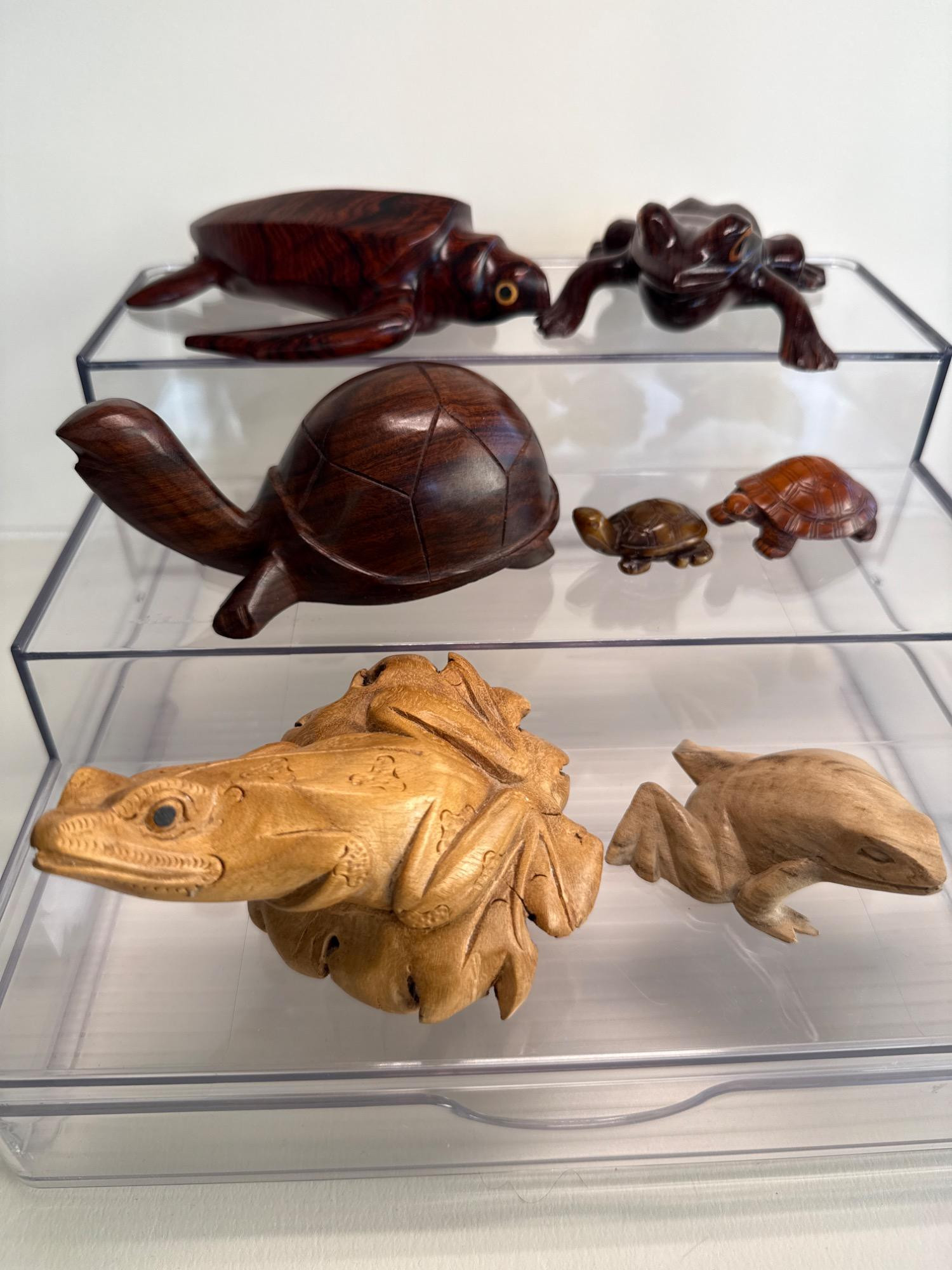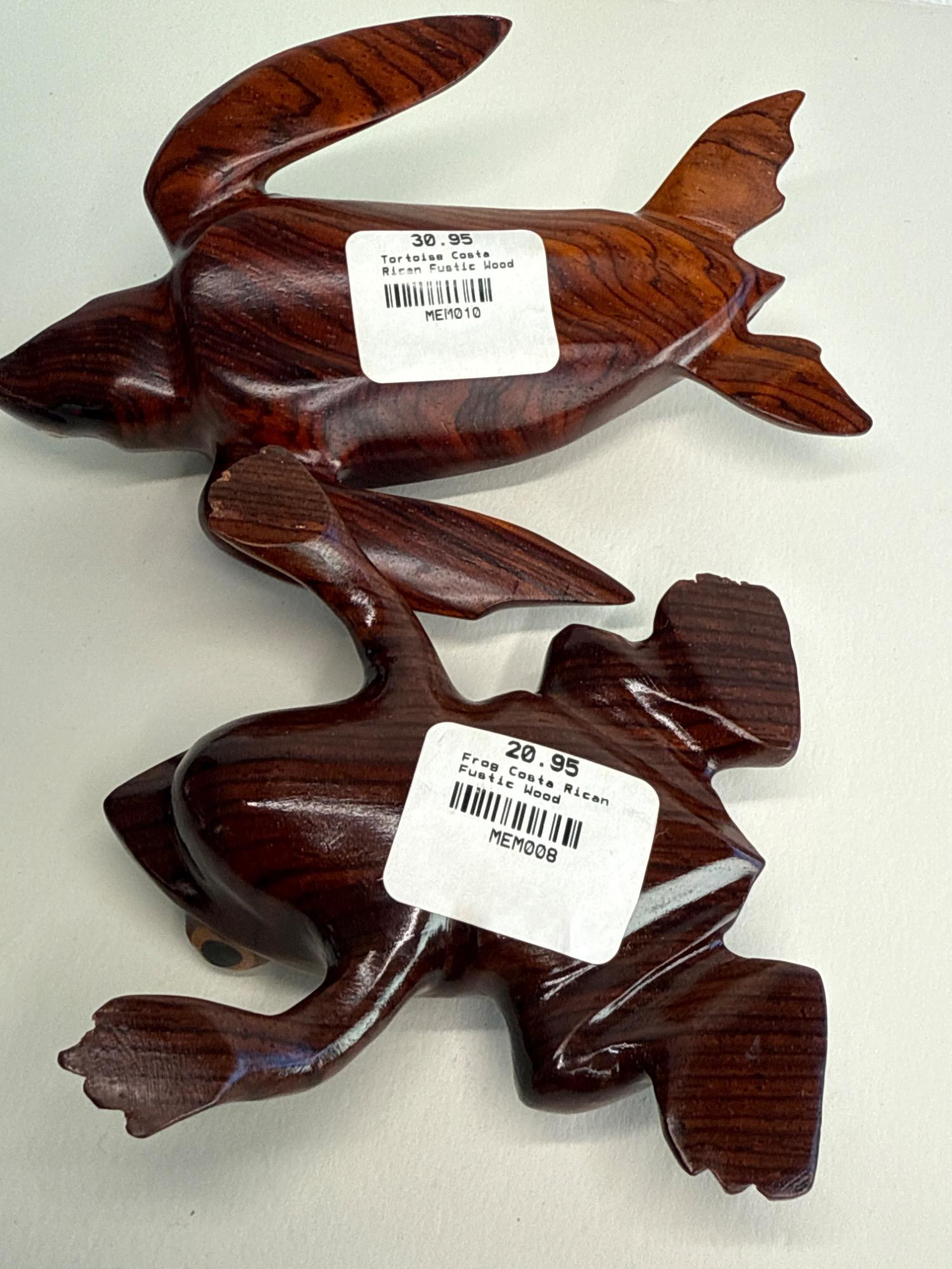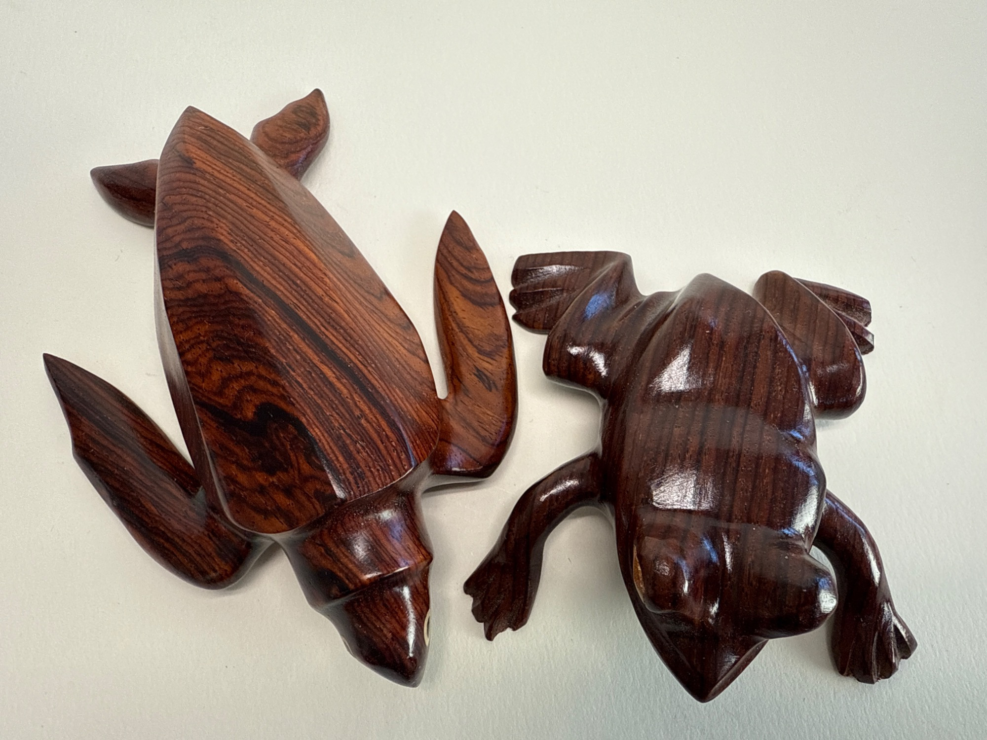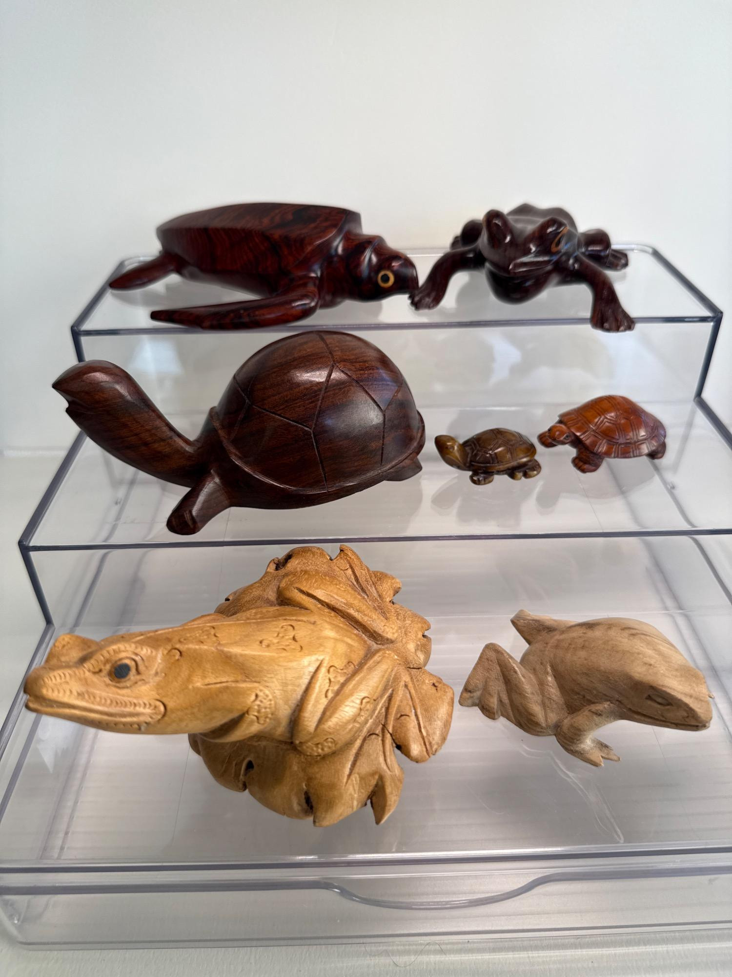 Materials: Exotic Woods, Costa Rican Fustic Wood, Burl Wood Included in the Set: 2 Carvings in Costa Rican Fustic Wood 1 Tortoise 1 Frog Rich, dark wood with natural grain patterns Price tags still attached ($30.95 & $20.95) 1 Frog Carved from Burl Wood Light in tone with a dramatic natural burl base Unique texture and organic feel 1 Light Wood Frog Smooth, simple finish Subtle grain pattern 3 Turtles in Various Finishes One large stylized turtle Two smaller turtles with shell detailing One signed on the bottom with drilled peg holes