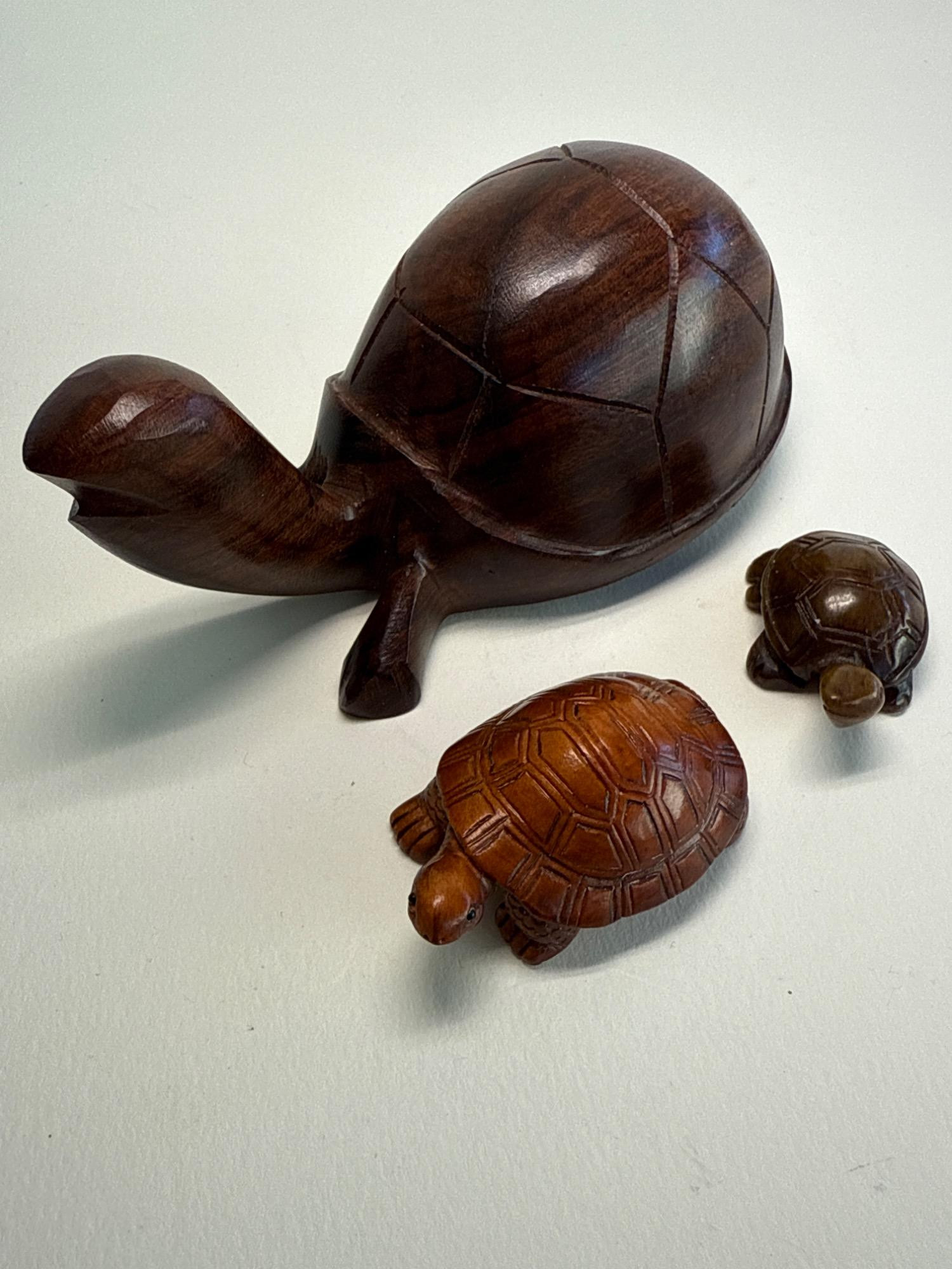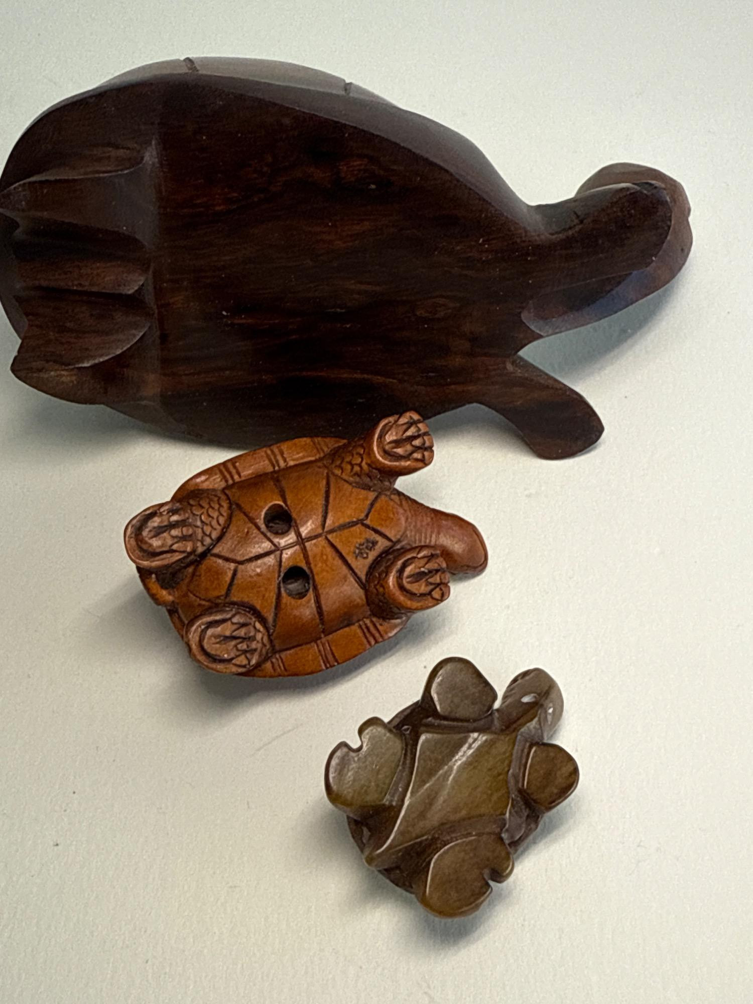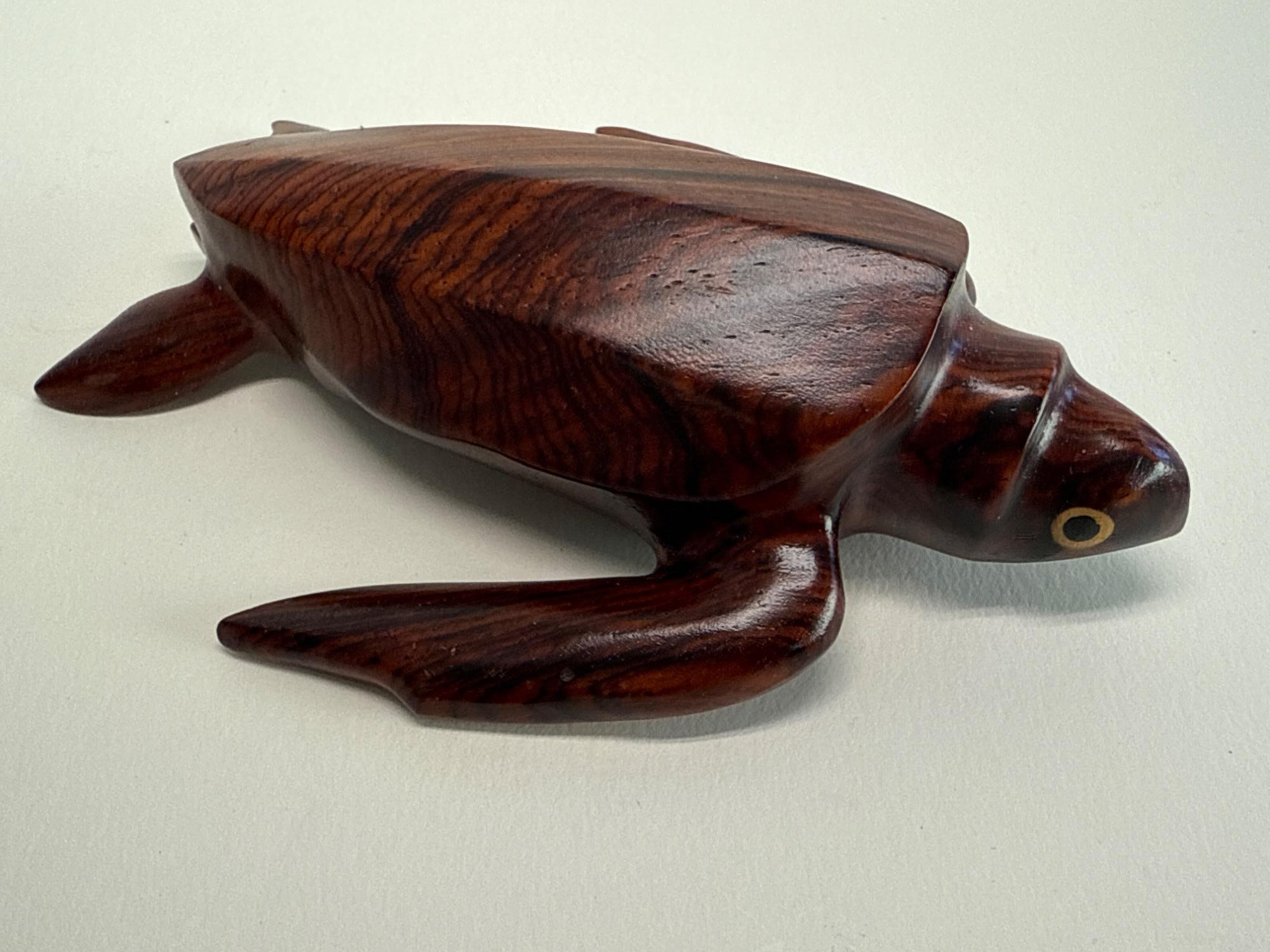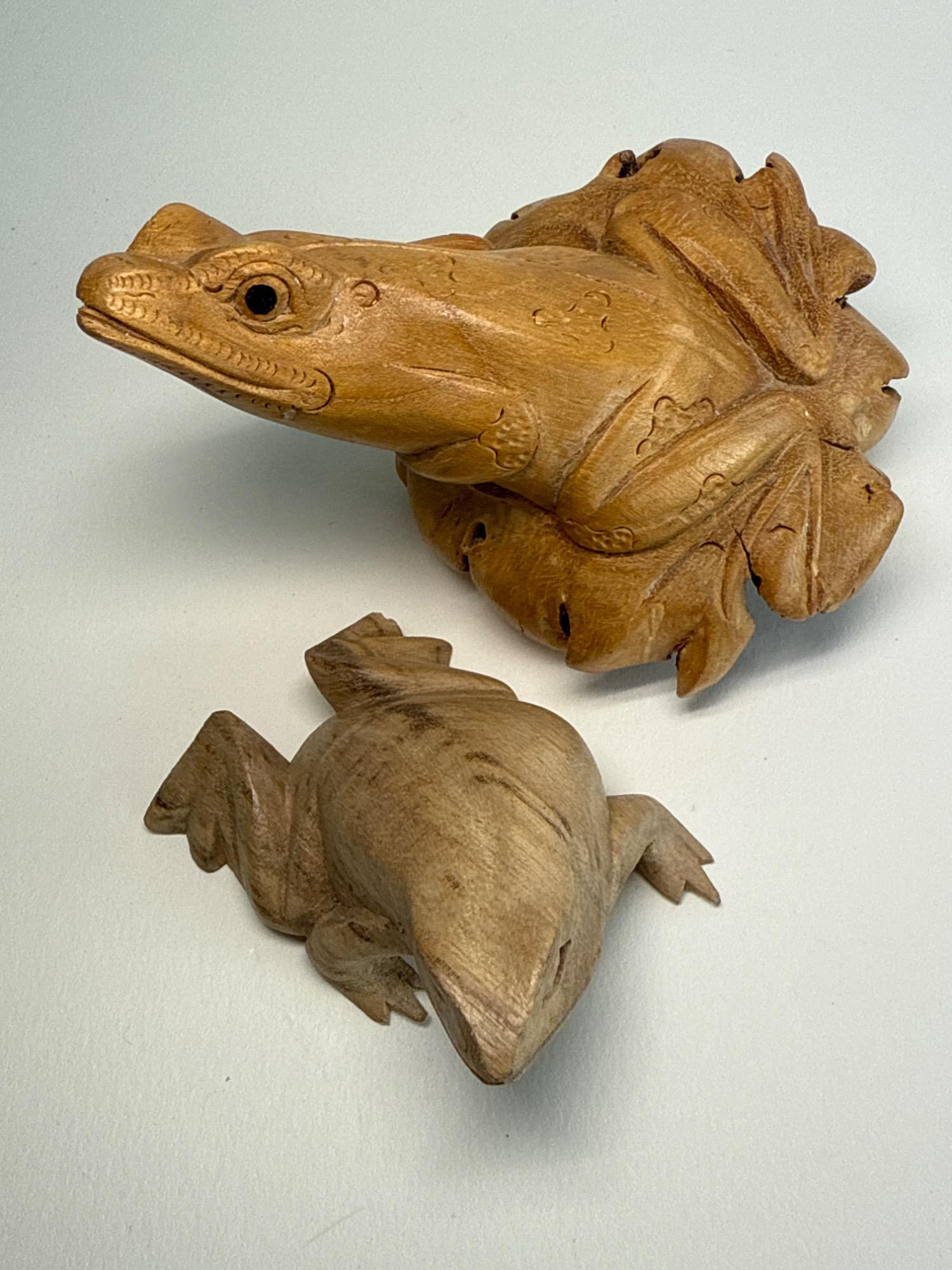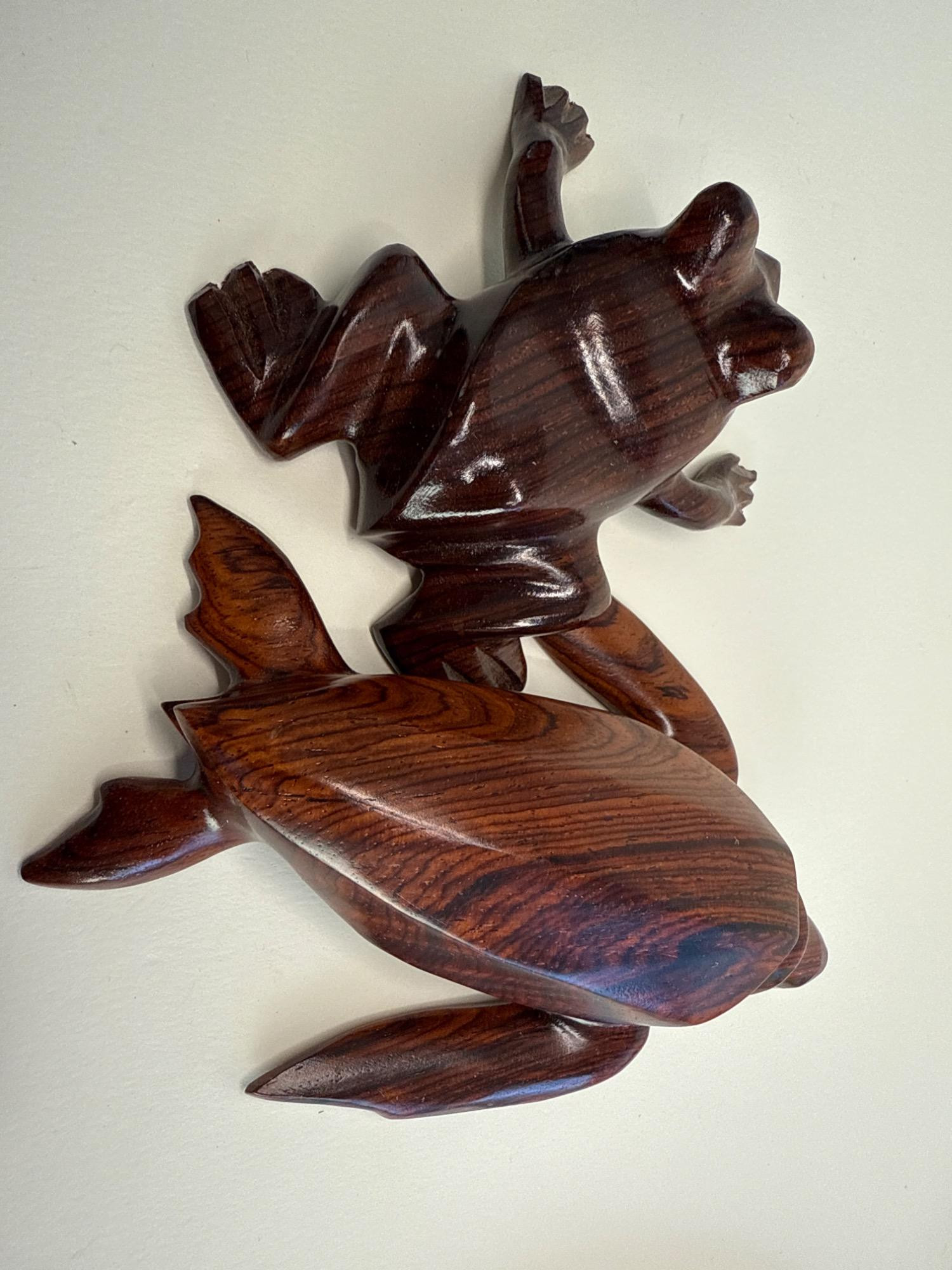 Materials: Exotic Woods, Costa Rican Fustic Wood, Burl Wood Included in the Set: 2 Carvings in Costa Rican Fustic Wood 1 Tortoise 1 Frog Rich, dark wood with natural grain patterns Price tags still attached ($30.95 & $20.95) 1 Frog Carved from Burl Wood Light in tone with a dramatic natural burl base Unique texture and organic feel 1 Light Wood Frog Smooth, simple finish Subtle grain pattern 3 Turtles in Various Finishes One large stylized turtle Two smaller turtles with shell detailing One signed on the bottom with drilled peg holes