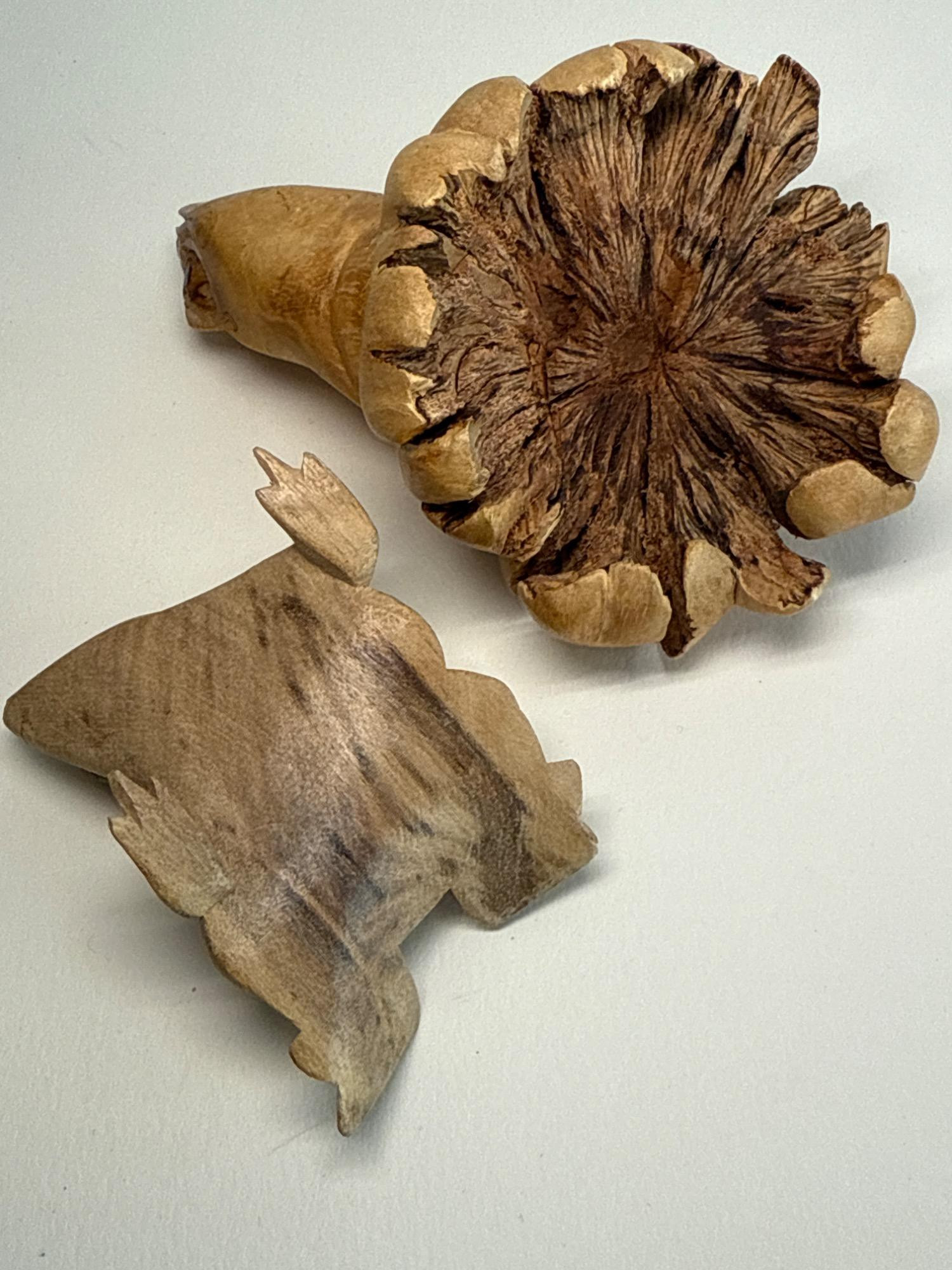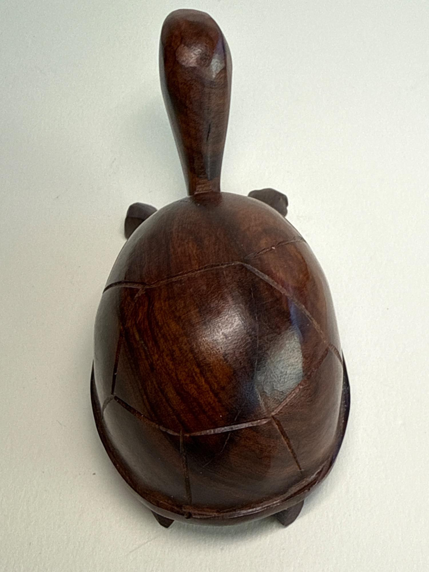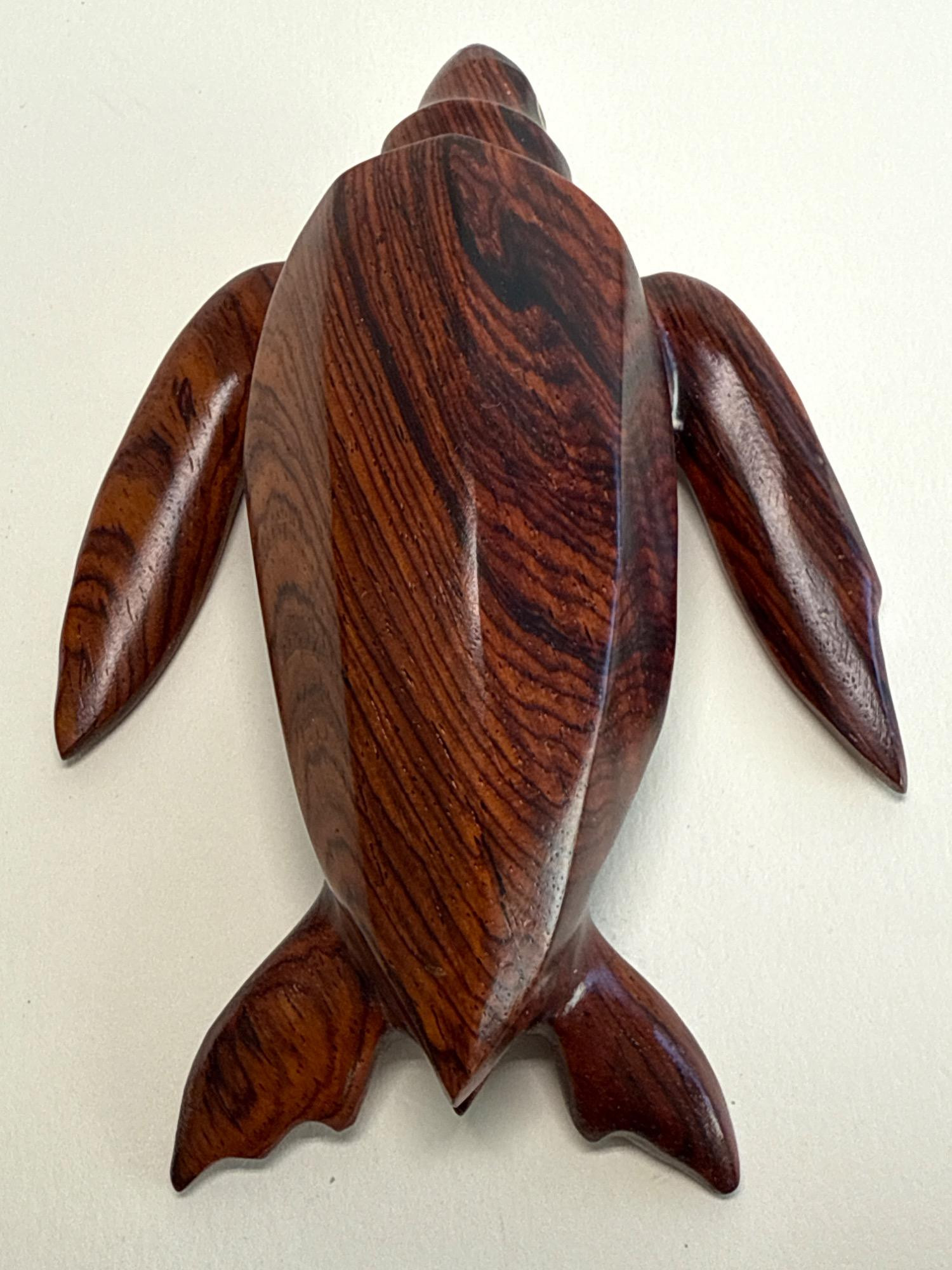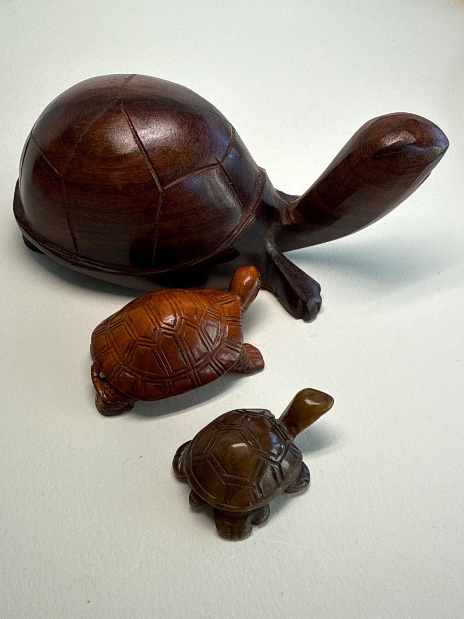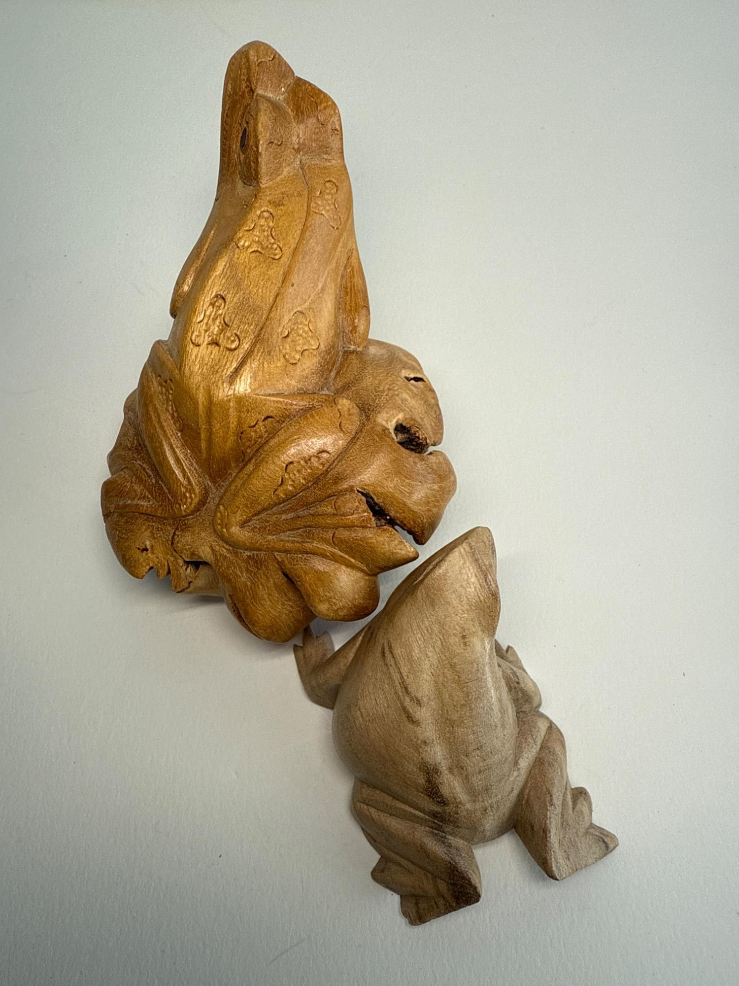 Materials: Exotic Woods, Costa Rican Fustic Wood, Burl Wood Included in the Set: 2 Carvings in Costa Rican Fustic Wood 1 Tortoise 1 Frog Rich, dark wood with natural grain patterns Price tags still attached ($30.95 & $20.95) 1 Frog Carved from Burl Wood Light in tone with a dramatic natural burl base Unique texture and organic feel 1 Light Wood Frog Smooth, simple finish Subtle grain pattern 3 Turtles in Various Finishes One large stylized turtle Two smaller turtles with shell detailing One signed on the bottom with drilled peg holes