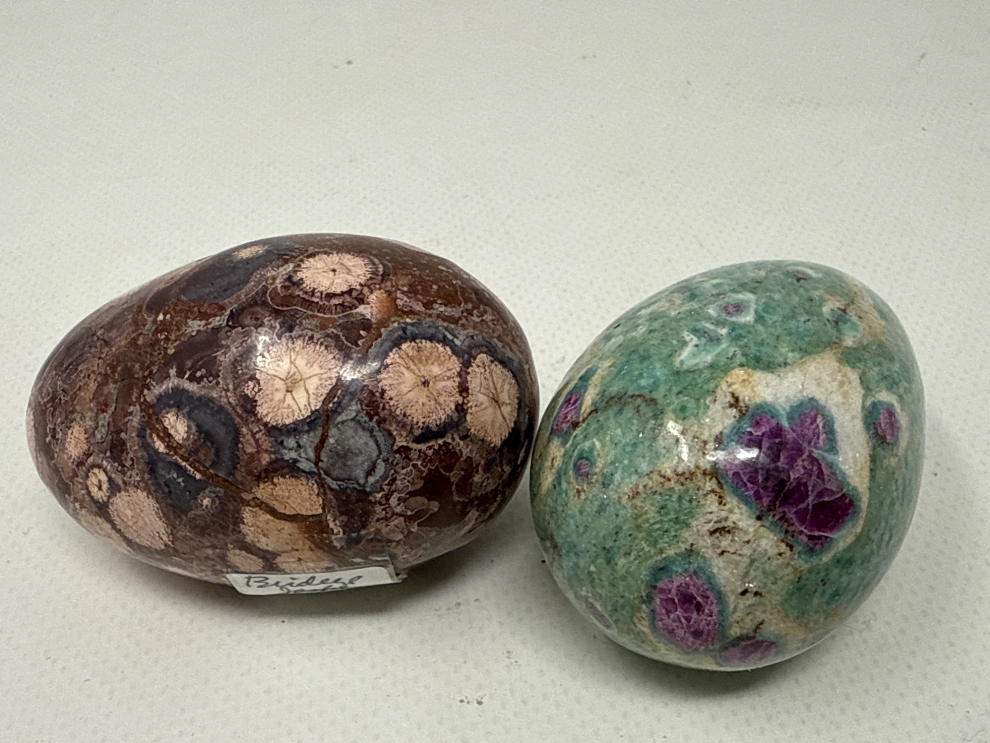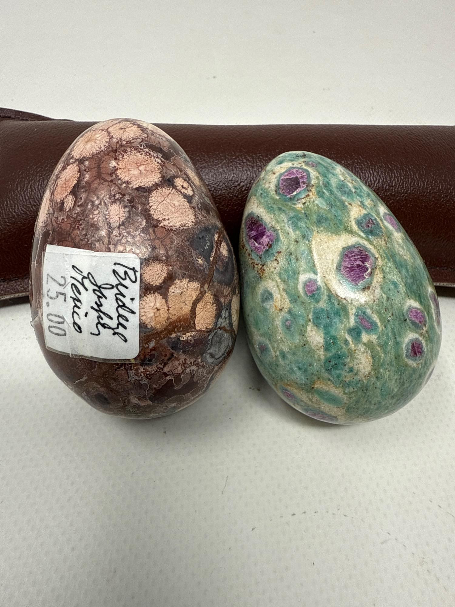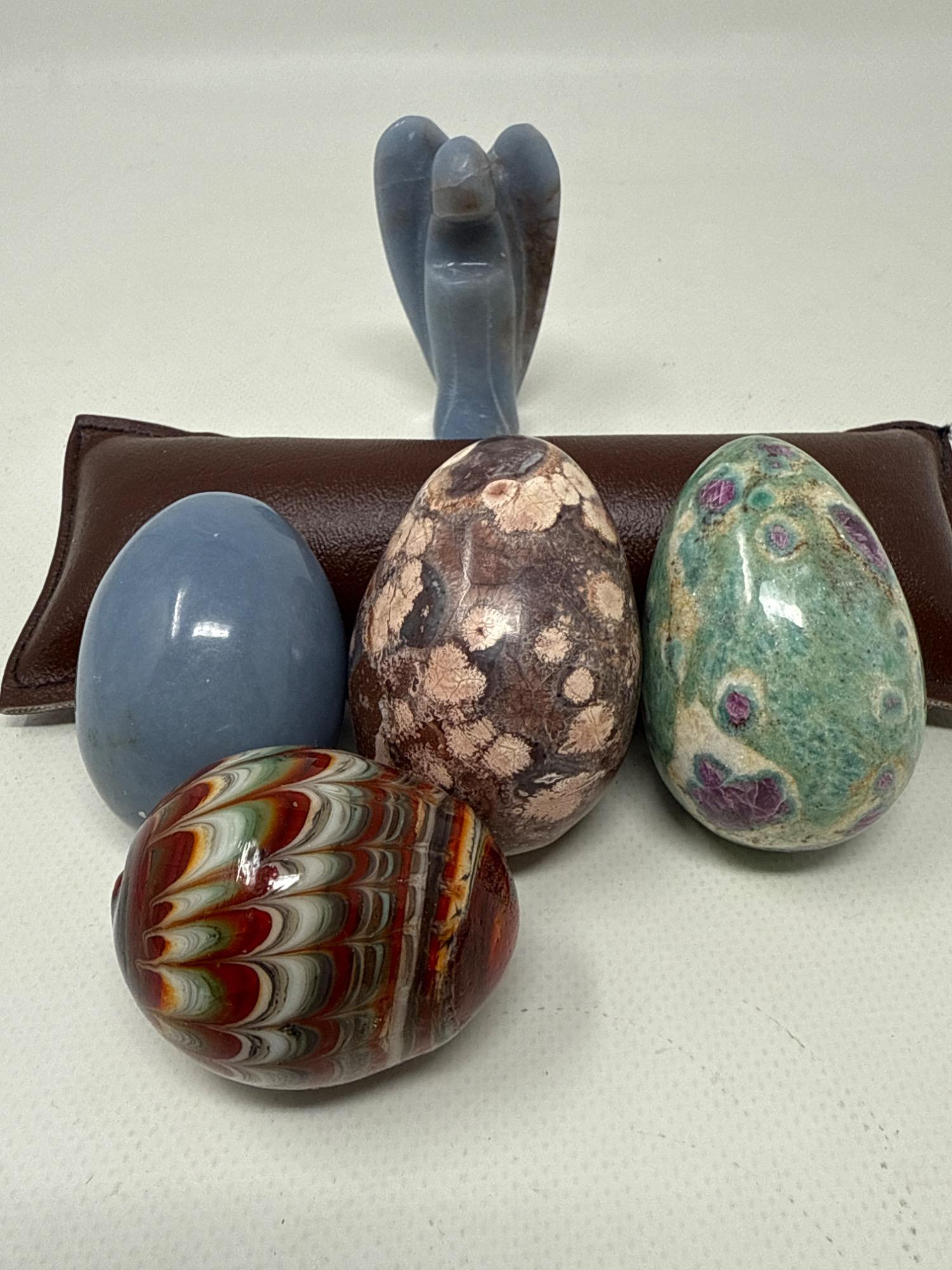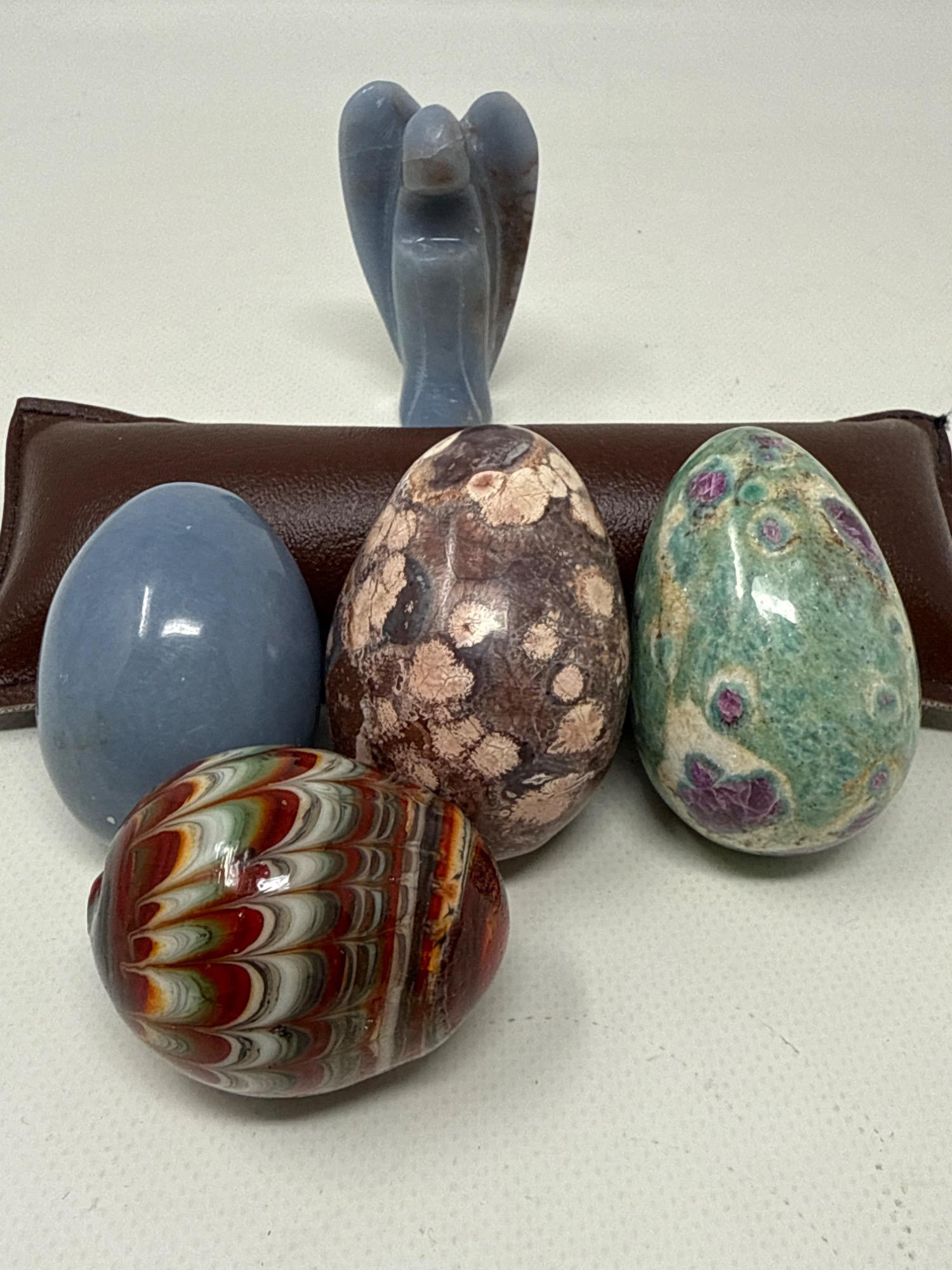 This beautiful collection includes four unique stone eggs and one hand-carved angel figure, perfect for collectors, spiritual spaces, or natural home décor. Included in the set: Brindle Jasper Egg (labeled, from Mexico) Earthy tones with intricate natural patterns Original marked value: $25.00 Ruby in Fuchsite Egg Vivid green with deep purple ruby inclusions Striking natural crystal contrast Polished Blue Stone Egg Smooth, serene appearance Possibly blue quartz or blue calcite Swirled Glass Egg Vibrant hand-blown art glass with a multicolor feathered swirl pattern Average eggs height: approx. 2.75” Blue Stone Angel Figurine (Made in Peru) Smoothly carved angel with subtle brown mineral veining Dimensions: approx. 2.75" tall x 1.75" wide Labeled price: $36.00