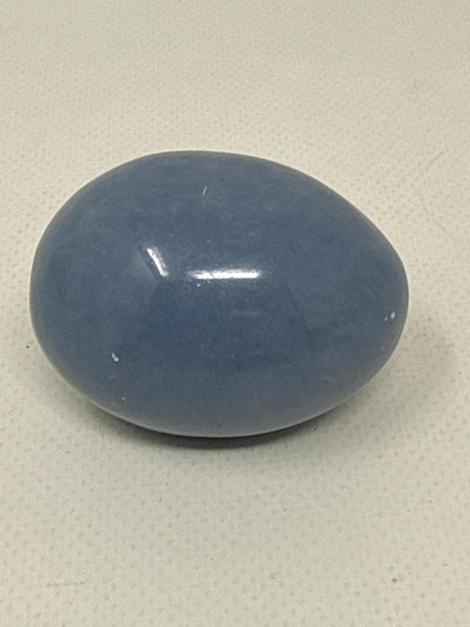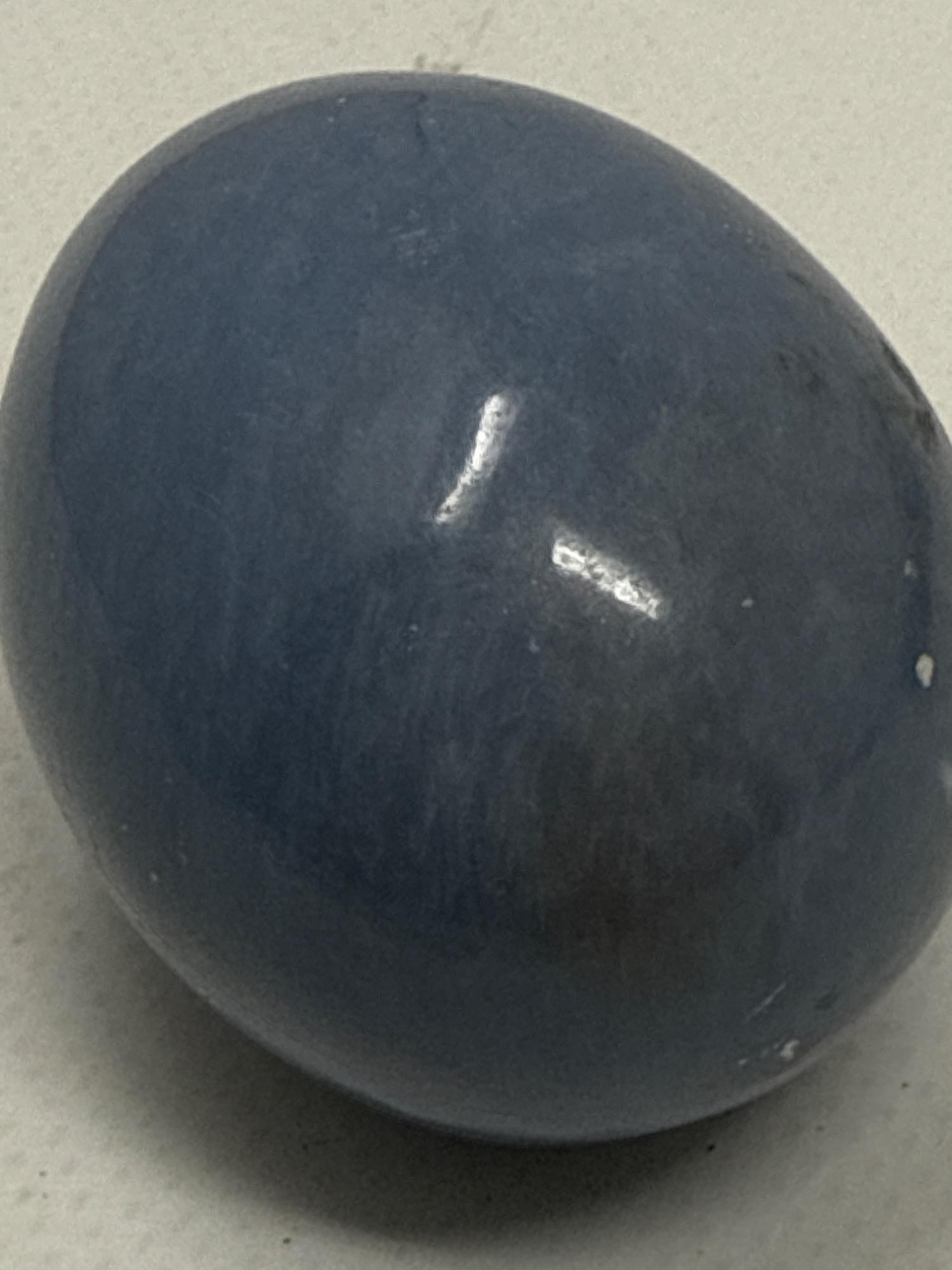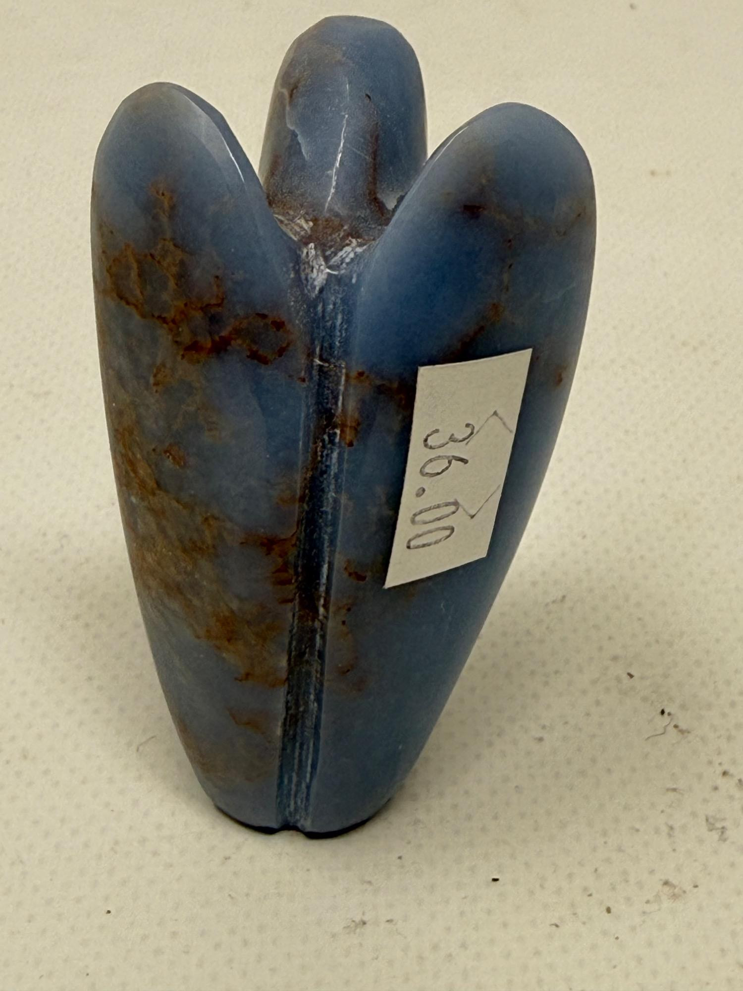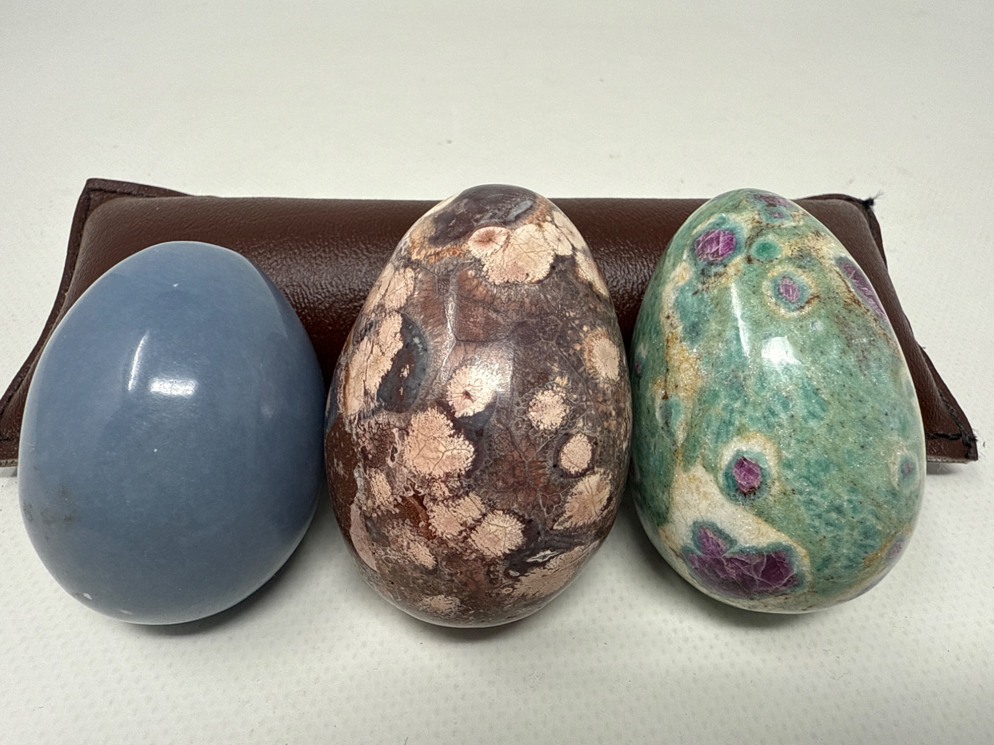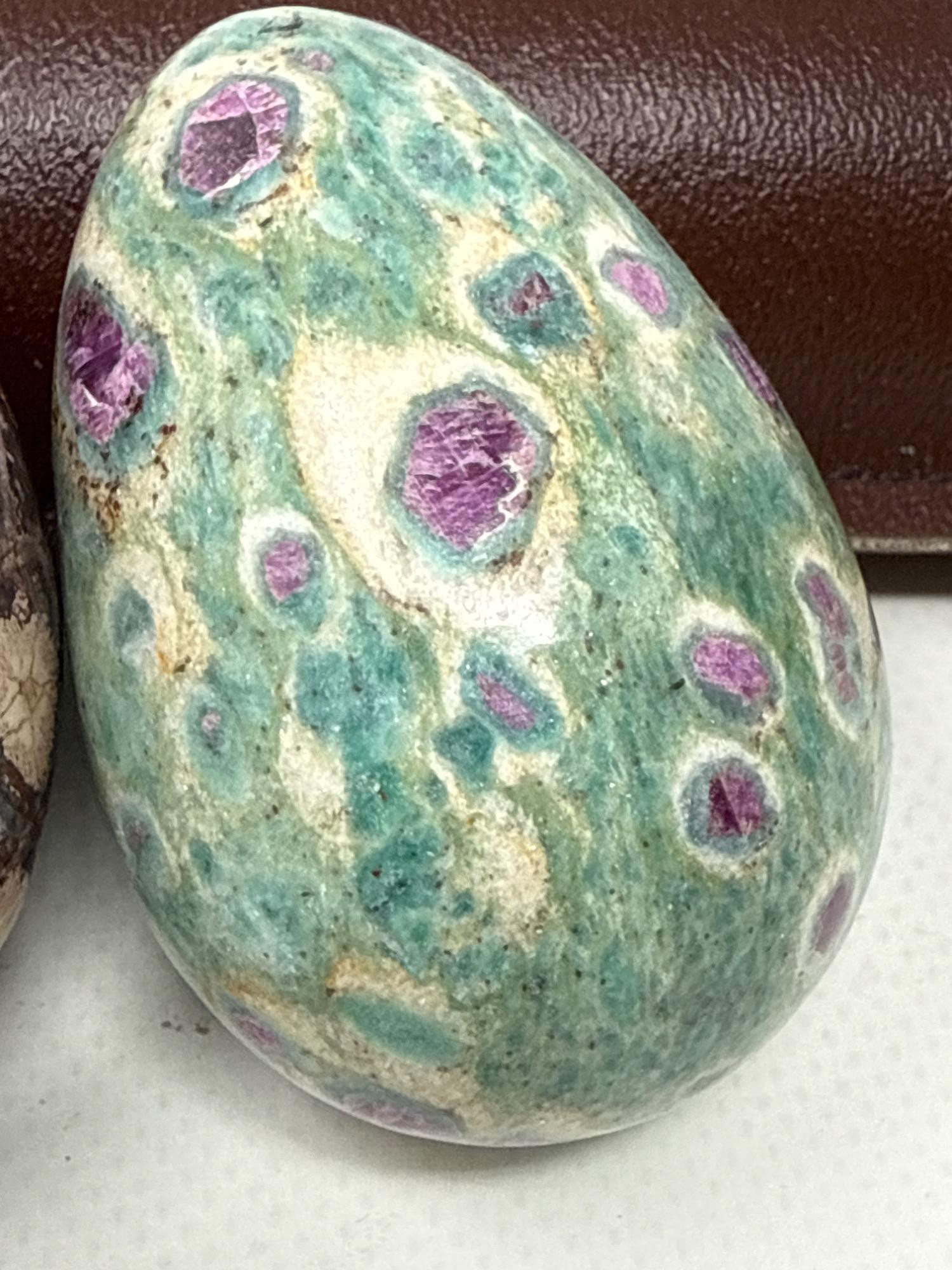 This beautiful collection includes four unique stone eggs and one hand-carved angel figure, perfect for collectors, spiritual spaces, or natural home décor. Included in the set: Brindle Jasper Egg (labeled, from Mexico) Earthy tones with intricate natural patterns Original marked value: $25.00 Ruby in Fuchsite Egg Vivid green with deep purple ruby inclusions Striking natural crystal contrast Polished Blue Stone Egg Smooth, serene appearance Possibly blue quartz or blue calcite Swirled Glass Egg Vibrant hand-blown art glass with a multicolor feathered swirl pattern Average eggs height: approx. 2.75” Blue Stone Angel Figurine (Made in Peru) Smoothly carved angel with subtle brown mineral veining Dimensions: approx. 2.75" tall x 1.75" wide Labeled price: $36.00
