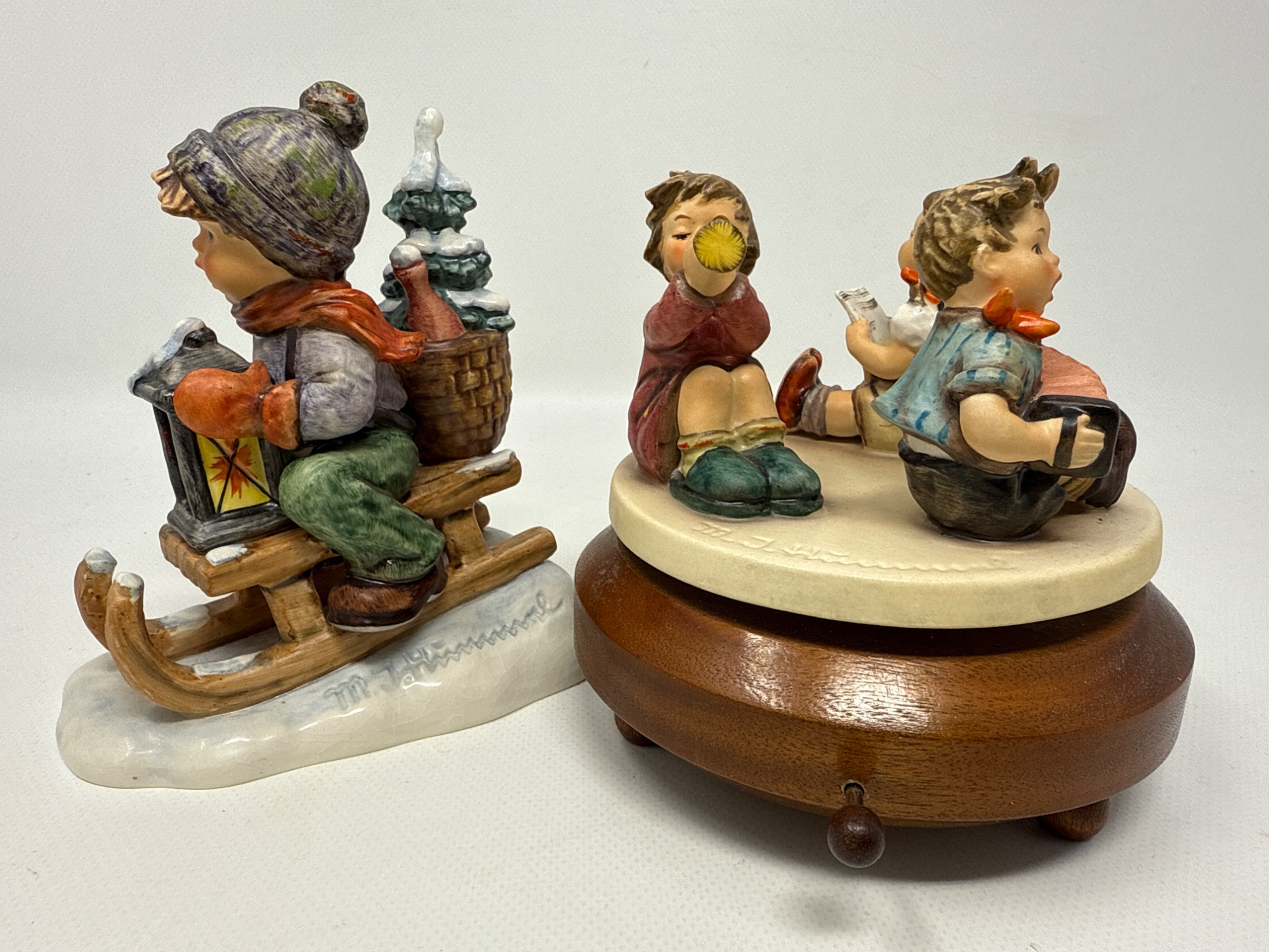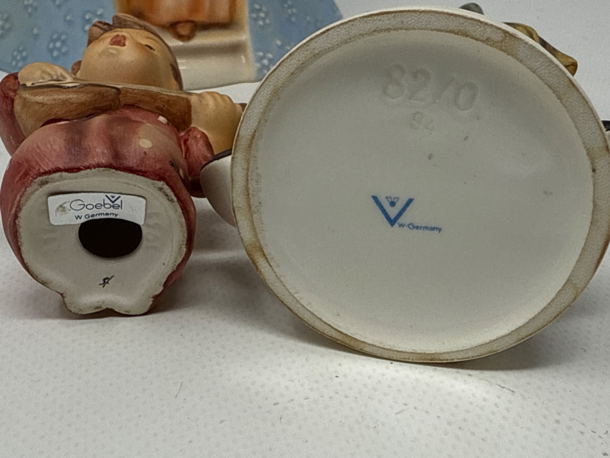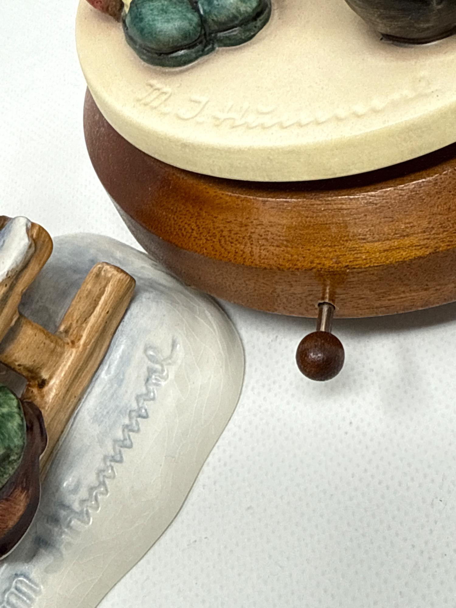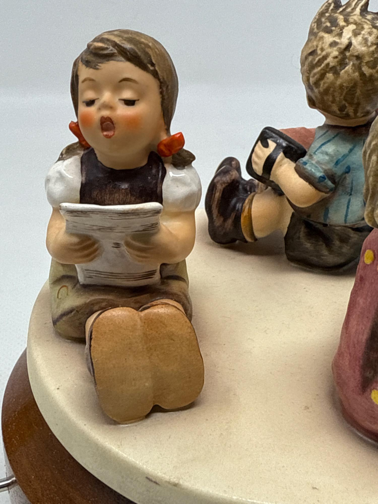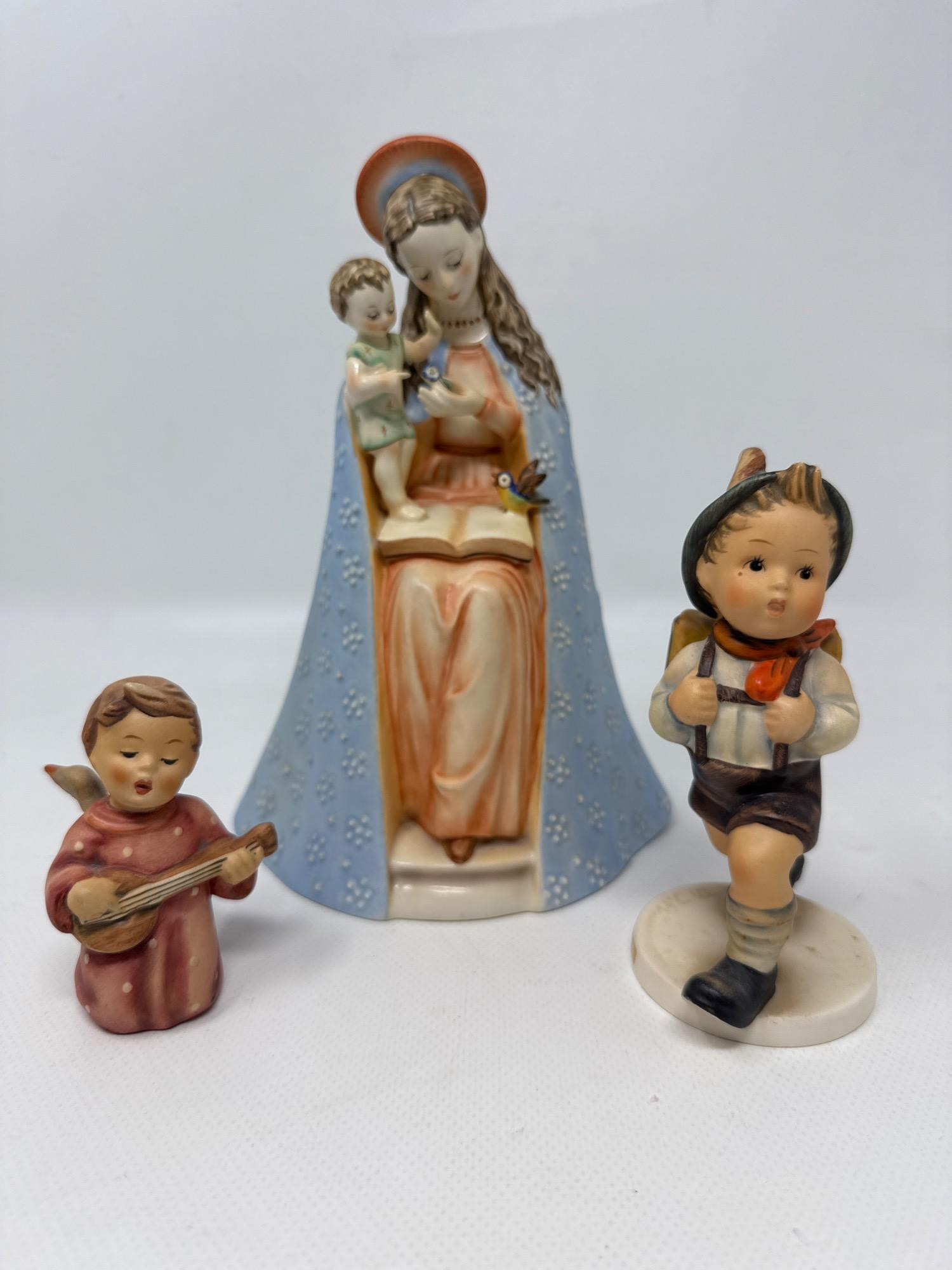 Bring timeless charm to your home or collection with this curated lot of authentic Hummel and Goebel figurines and collector books. Each porcelain piece is marked "Goebel W. Germany" and showcases the detailed craftsmanship that has made Hummel figurines beloved worldwide. This collection includes: Madonna and Child (Flwr Madonna, 10/1) – 8.5" tall, delicate and serene religious figure with birds and book School Boy figurine – classic M.I. Hummel design with original base label Angel with Lute – sweet and petite, perfect for holiday decor Boy on Sled with Christmas Tree Musical Trio on Rotating Base – plays "Hänschen Klein" via Swiss MAPSA movement Also included are 4 collector books filled with rich background, pricing, and images of Hummel figurines: Price Guide to M.I. Hummel Hummels: 20 Years of Columns In the Land of Hummel Full-color photo book on Bavarian tradition