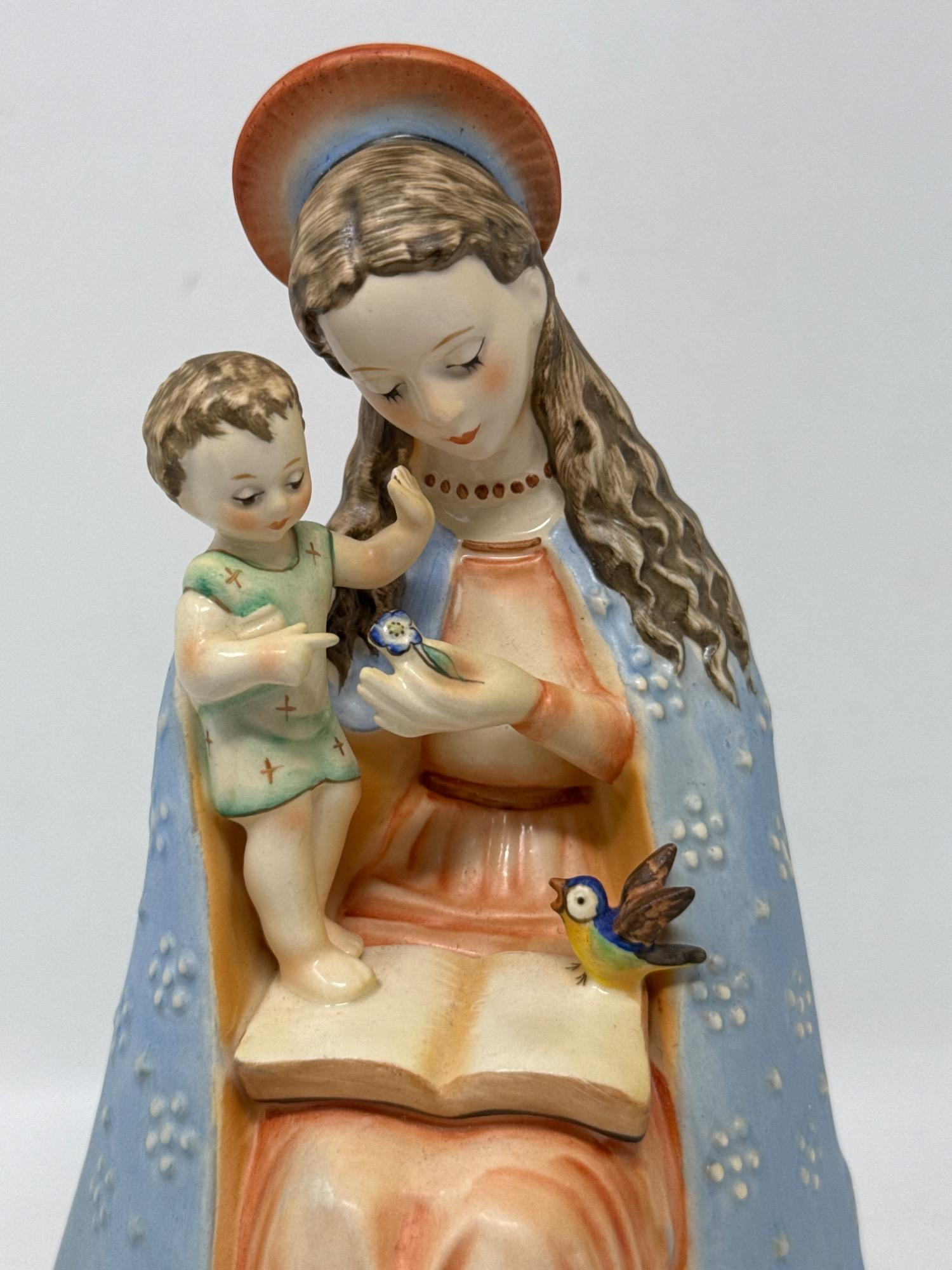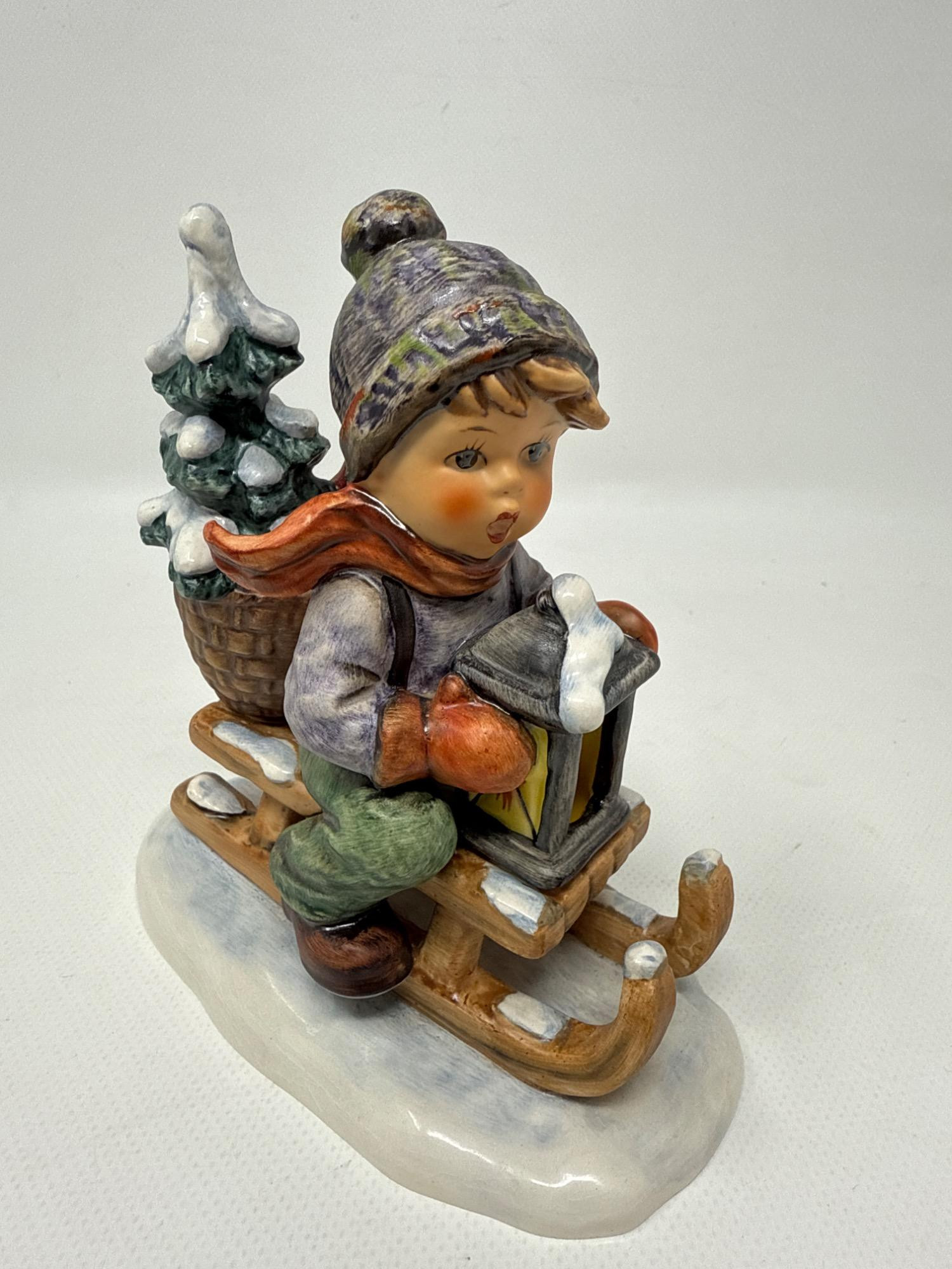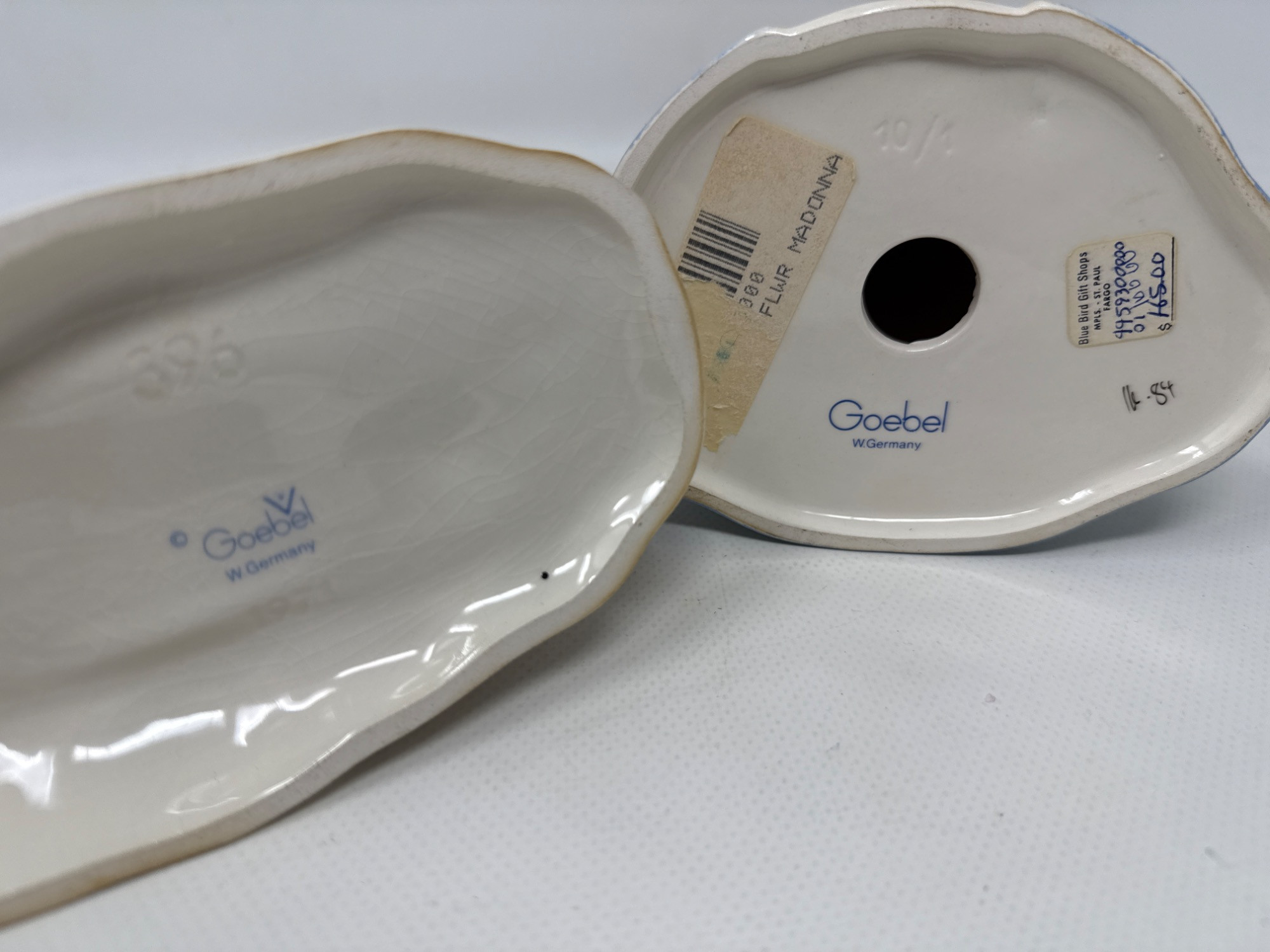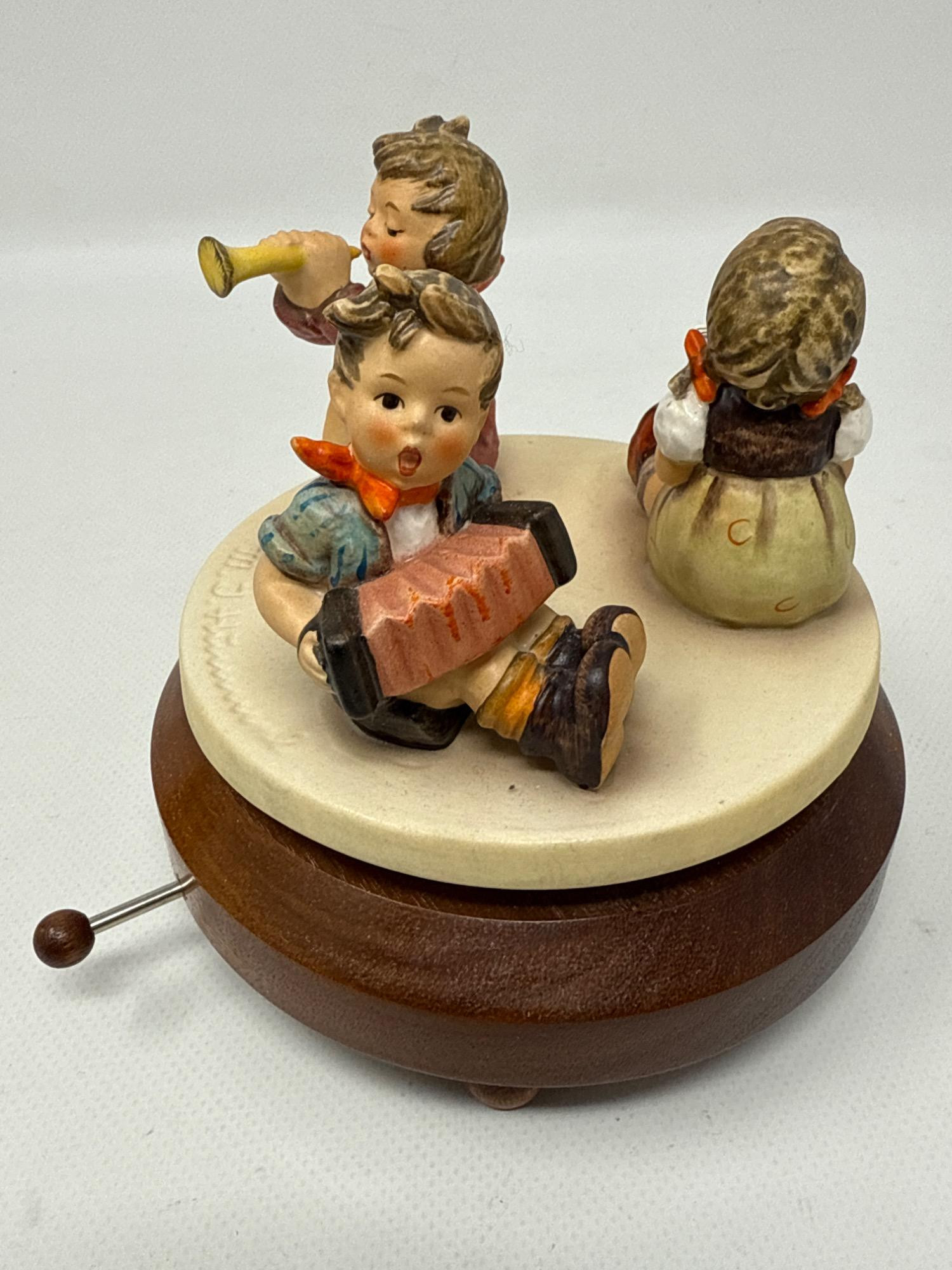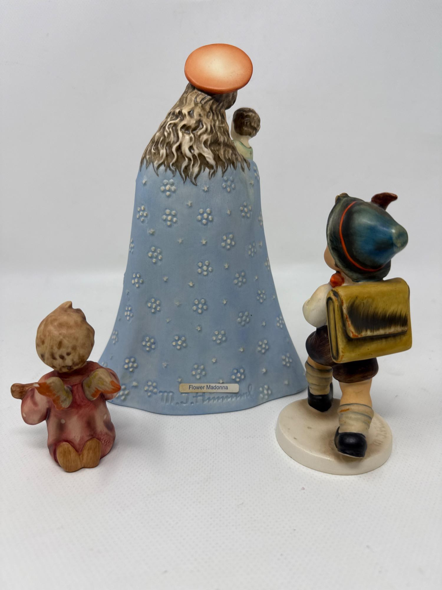 Bring timeless charm to your home or collection with this curated lot of authentic Hummel and Goebel figurines and collector books. Each porcelain piece is marked "Goebel W. Germany" and showcases the detailed craftsmanship that has made Hummel figurines beloved worldwide. This collection includes: Madonna and Child (Flwr Madonna, 10/1) – 8.5" tall, delicate and serene religious figure with birds and book School Boy figurine – classic M.I. Hummel design with original base label Angel with Lute – sweet and petite, perfect for holiday decor Boy on Sled with Christmas Tree Musical Trio on Rotating Base – plays "Hänschen Klein" via Swiss MAPSA movement Also included are 4 collector books filled with rich background, pricing, and images of Hummel figurines: Price Guide to M.I. Hummel Hummels: 20 Years of Columns In the Land of Hummel Full-color photo book on Bavarian tradition