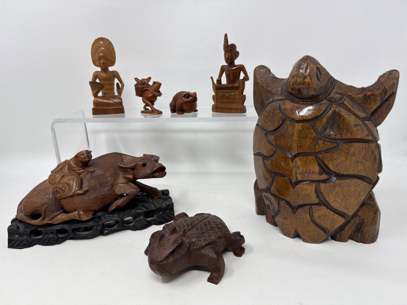 This unique collection features intricately carved wooden figures with cultural and artistic significance from various regions in Asia and the Pacific. Highlights include: Japanese Netsuke Turtle – A finely detailed carving, signed on the base with traditional characters, measuring approx. 7.5”L x 5.5”W x 3.5”T. Carved Water Buffalo with Rider – A striking piece showcasing a traditional scene, measuring approx. 7”L x 3.2”T x 3”W. Base is carved plastic Large Carved Turtle from Tonga – Marked "Tonga" on the base, beautifully rendered with bold textures. Assorted Carvings – Includes two seated figures (possibly Balinese or Southeast Asian), a frog, and additional miniature sculptures, each full of character and craftsmanship.
