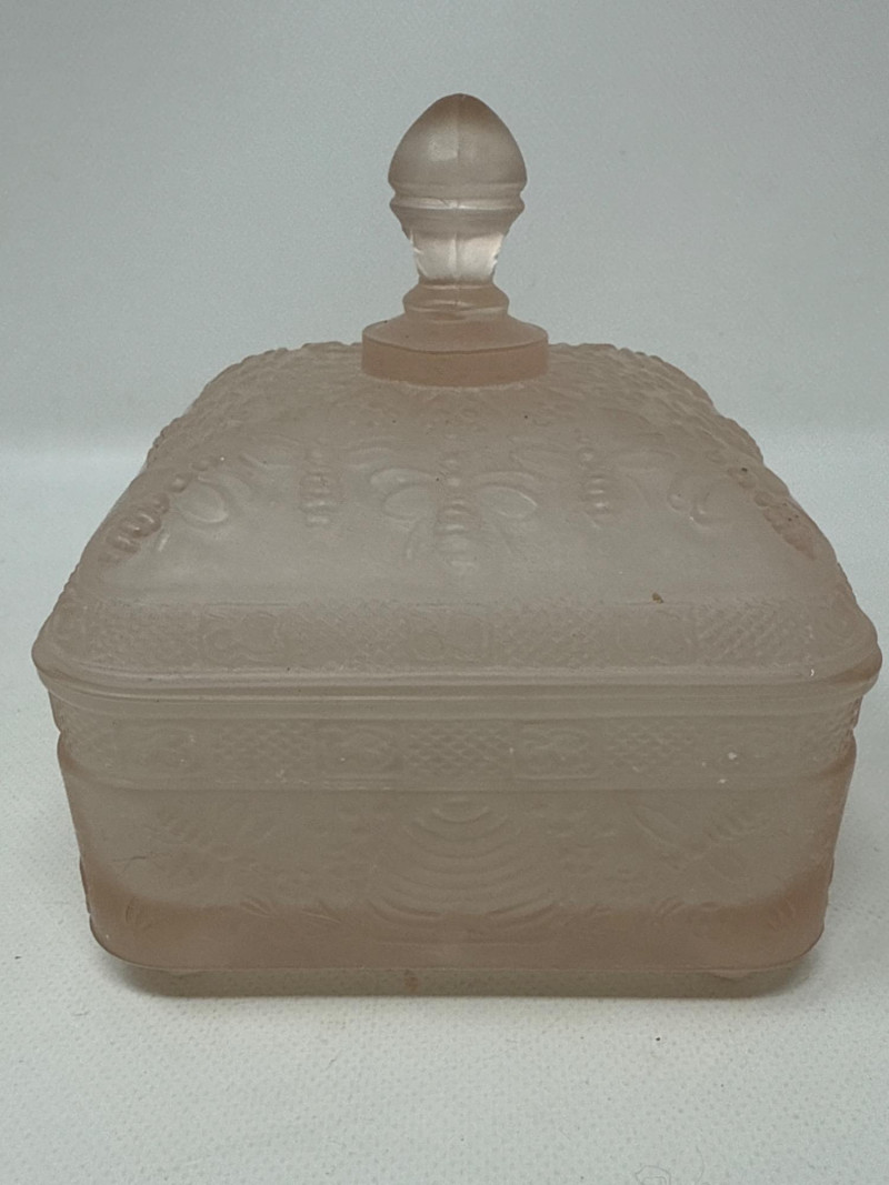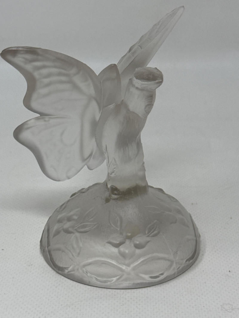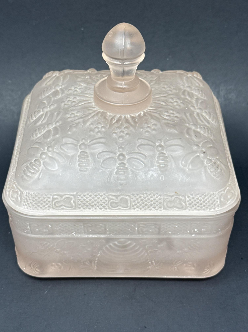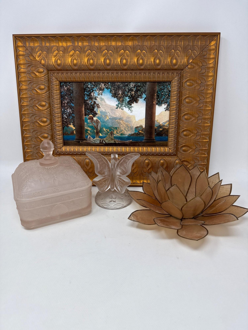 This charming 4-piece decorative lot includes: Maxfield Parrish Art Print: A beautifully framed piece showcasing one of Parrish’s iconic dreamlike scenes. Set in a richly embossed bronze-toned frame that’s both high-quality and substantial. Approx. dimensions (including frame): 17.5" L x 13.5" H. Ready to hang and perfect as a focal point in any room. Tiara Indiana Pink Frosted Glass Box: A lidded trinket box with an intricate bee and hive pattern. Stamped Fenton on the base, this piece is ideal for vanity or dresser storage and a must-have for vintage glass collectors. Fenton Glass Butterfly Candle Holder: Frosted glass butterfly perched on a detailed floral base. Holds a taper candle and adds a soft, whimsical touch to your decor. Lotus Flower Votive Holder: Blush and Copper-toned metal lotus flower design, perfect for tea lights or as a stunning standalone accent. Delicate