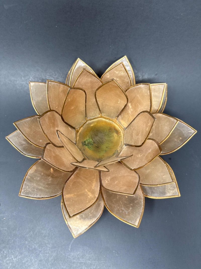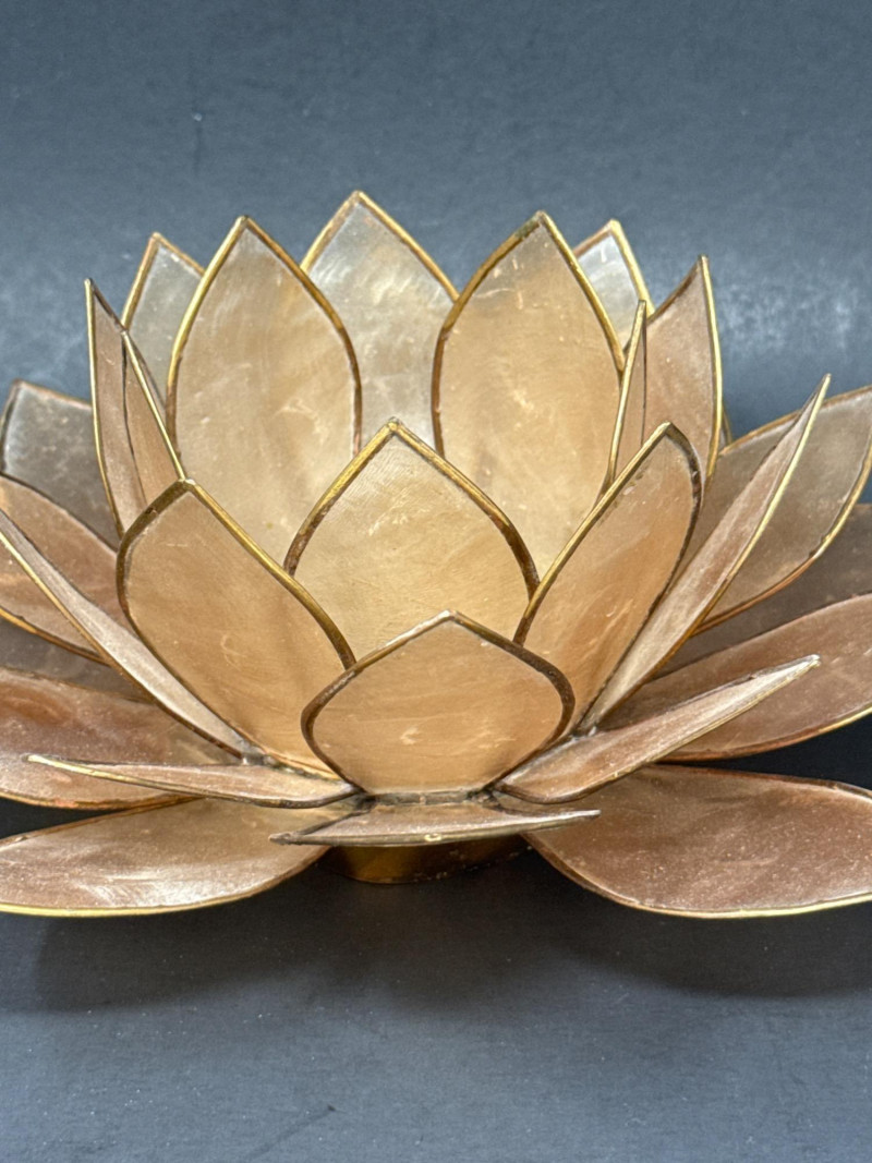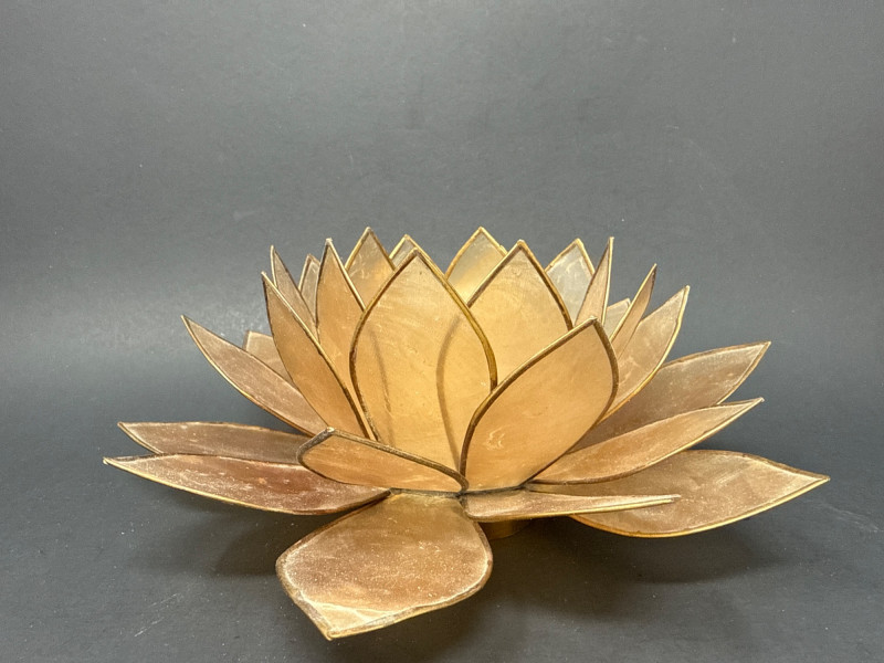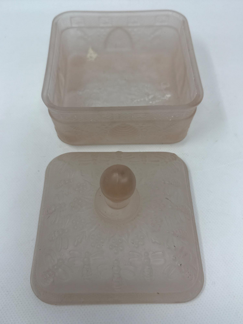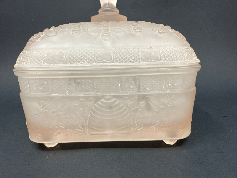 This charming 4-piece decorative lot includes: Maxfield Parrish Art Print: A beautifully framed piece showcasing one of Parrish’s iconic dreamlike scenes. Set in a richly embossed bronze-toned frame that’s both high-quality and substantial. Approx. dimensions (including frame): 17.5" L x 13.5" H. Ready to hang and perfect as a focal point in any room. Tiara Indiana Pink Frosted Glass Box: A lidded trinket box with an intricate bee and hive pattern. Stamped Fenton on the base, this piece is ideal for vanity or dresser storage and a must-have for vintage glass collectors. Fenton Glass Butterfly Candle Holder: Frosted glass butterfly perched on a detailed floral base. Holds a taper candle and adds a soft, whimsical touch to your decor. Lotus Flower Votive Holder: Blush and Copper-toned metal lotus flower design, perfect for tea lights or as a stunning standalone accent. Delicate