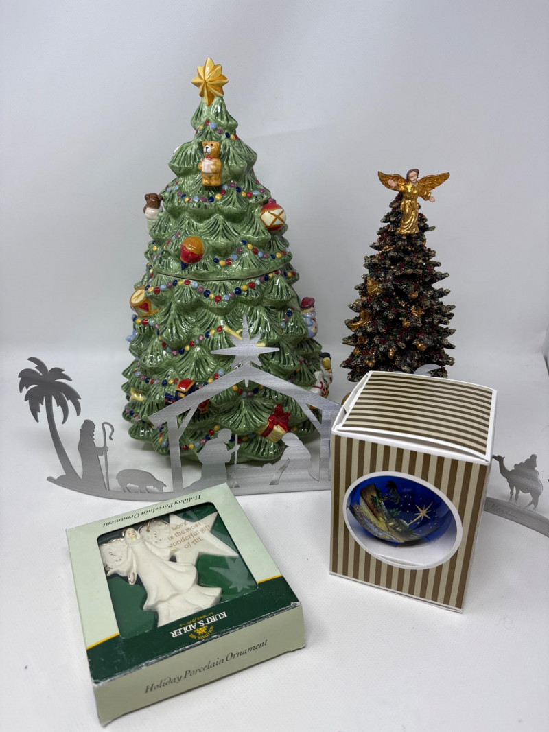 Festive mixed lot of collectible Christmas décor items – perfect for decorating, gifting, or adding to your holiday collection. This bundle includes: Christopher Radko Ceramic Christmas Tree Cookie Jar Department 56 Musical Christmas Tree Kurt S. Adler Holiday Porcelain Ornaments (Set of 2) Angel ornament with star featuring the quote: “Love is the most wonderful gift of all.” Hand-painted blue glass ball ornament with a nativity scene. Sondra Gerber Silver Metal Nativity Scene