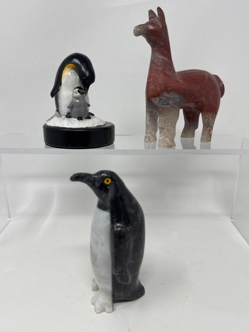 Charming set of hand-carved stone animal figurines including two penguins and a horse. The centerpiece is a polished black-and-white SPI penguin sculpture with lifelike details and a glossy finish. Accompanying it is a delightful mother-and-chick penguin duo, mounted on a snowy base, adding warmth and personality to the collection. Completing the trio is a reddish-brown carved stone horse with subtle marbling, lending a rustic elegance to the group. These pieces are perfect for collectors of animal figures or natural stone carvings. Dimensions (Horse): 5 inches tall and 4.5 inches long