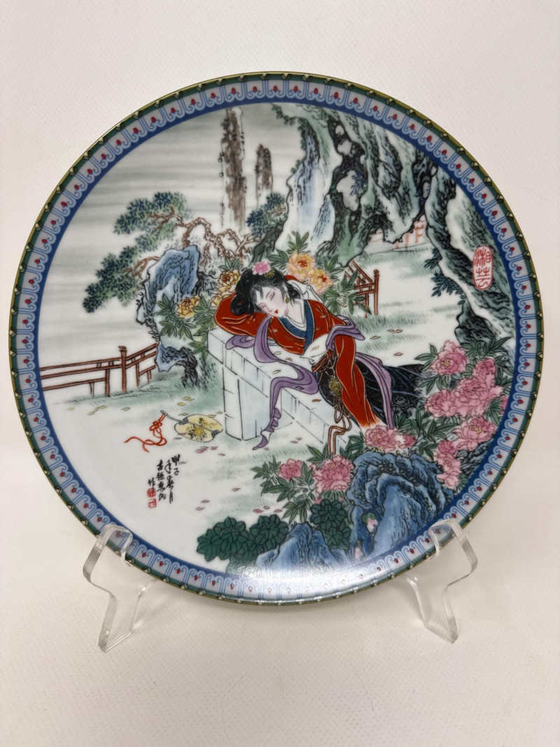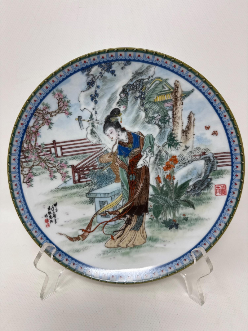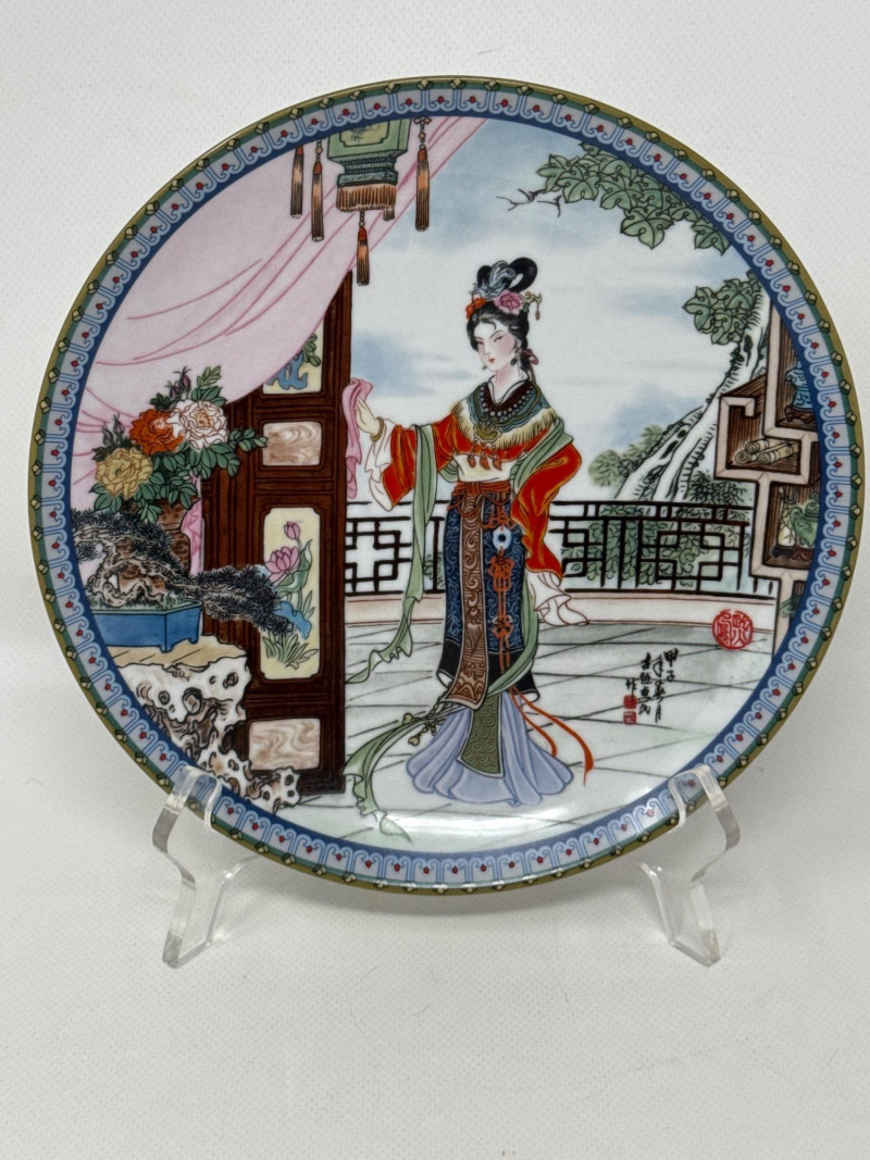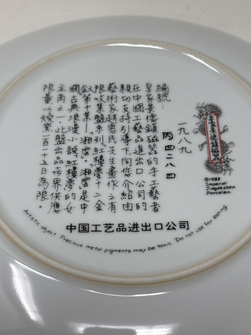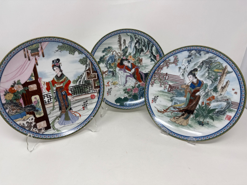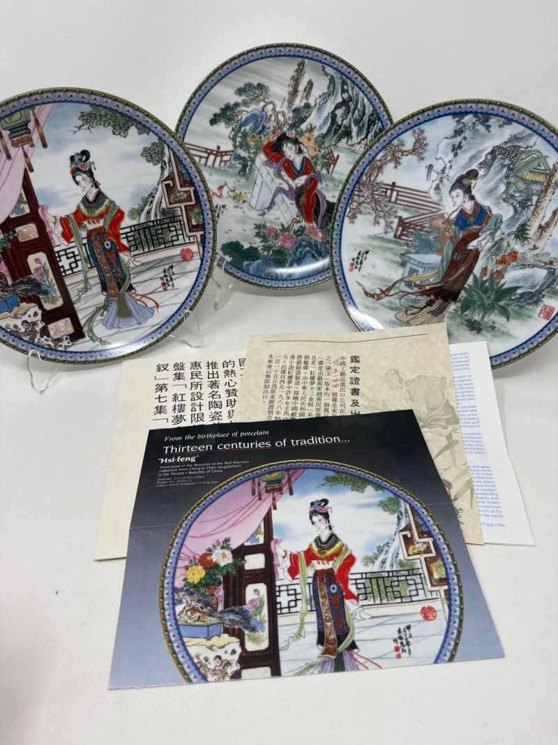 This exquisite set features three 8.5-inch porcelain collector plates from the renowned “Beauties of the Red Mansion”series. Hand-decorated in vivid color and intricate detail, each plate showcases a graceful lady in a classic Chinese garden scene, inspired by the characters of the literary masterpiece Dream of the Red Chamber. Manufacturer: Imperial Jingdezhen Porcelain
