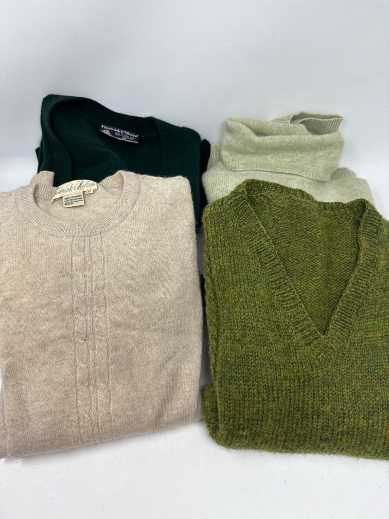 Stay cozy and stylish with this beautiful collection of four high-quality sweaters in ladies’ size Medium. This mixed lot features premium materials like cashmere, lambswool, merino wool, and angora, making it perfect for colder weather or layering in any season. Included in this lot: Frederick & Nelson 100% Cashmere Sweater Size: Medium Color: Soft beige Made in Hong Kong Classic cable knit detail on front Exceptionally soft and luxurious Preswick & Moore 100% Lambswool Sweater Size: Medium Color: Deep forest green Made in Hong Kong Timeless design with warm, rich texture. Small hole on shoulder L.L. Bean Merino Wool/Angora Blend Turtleneck Sweater Tagged Size: L-Regular (fits closer to a Medium) Color: Light sage 88% Merino Wool, 12% Angora Rabbit Hair Made in China Super soft and cozy with a relaxed fit Olive Green Wool Blend Sleeveless Sweater Vest V-neck style with textured cable-knit accents Warm and versatile — great for layering Material feels like wool or wool blend