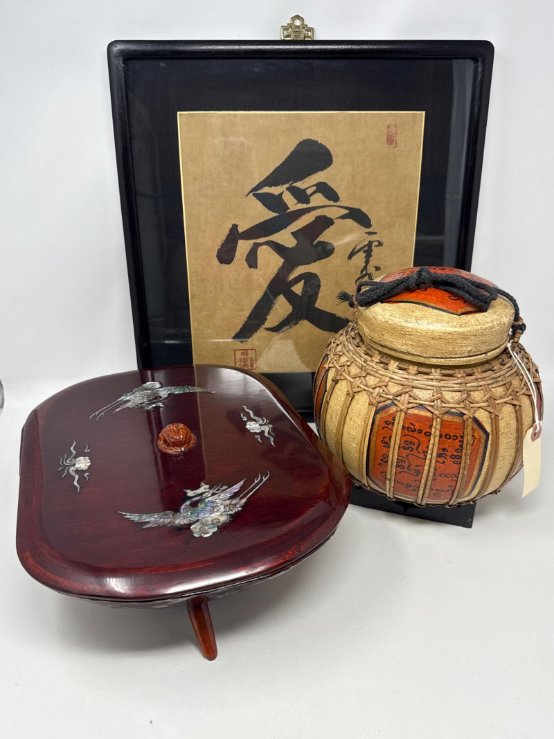 A beautifully curated trio of vintage and artistic pieces with strong Asian cultural influence: Vintage Thai Rice Bucket – This traditional Thai rice storage container features woven bamboo detailing over a lacquered surface, complete with a tightly fitted lid. Decorative script panels enhance its rustic charm. The interior is clean and black-lacquered. Mother of Pearl Inlay Box/Table – A stunning low-profile wooden piece with intricate hand-inlaid mother of pearl designs, showcasing cranes and floral motifs. Glossy lacquer finish and folding legs suggest it could be used as a decorative box or small table. Lid lifts off to reveal a deep storage cavity inside. Framed Asian Calligraphy Art – This elegant framed work of calligraphy spells the word "Love", signed by artist Song Sug. Mounted in a sleek black wood frame,