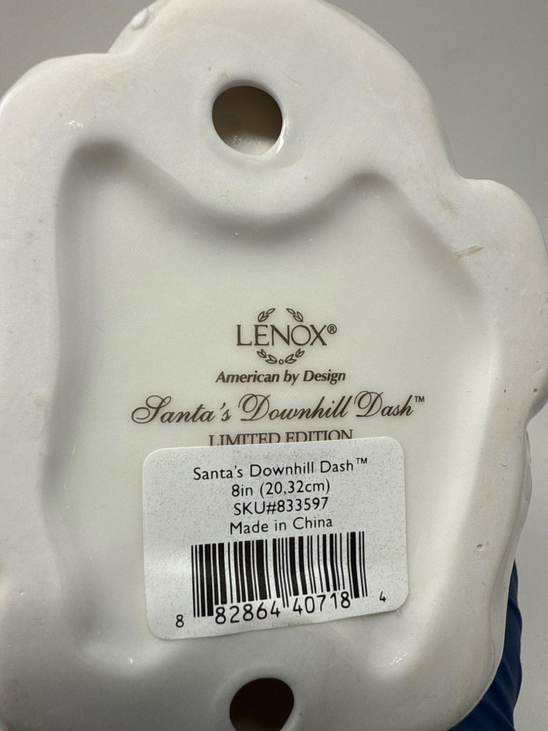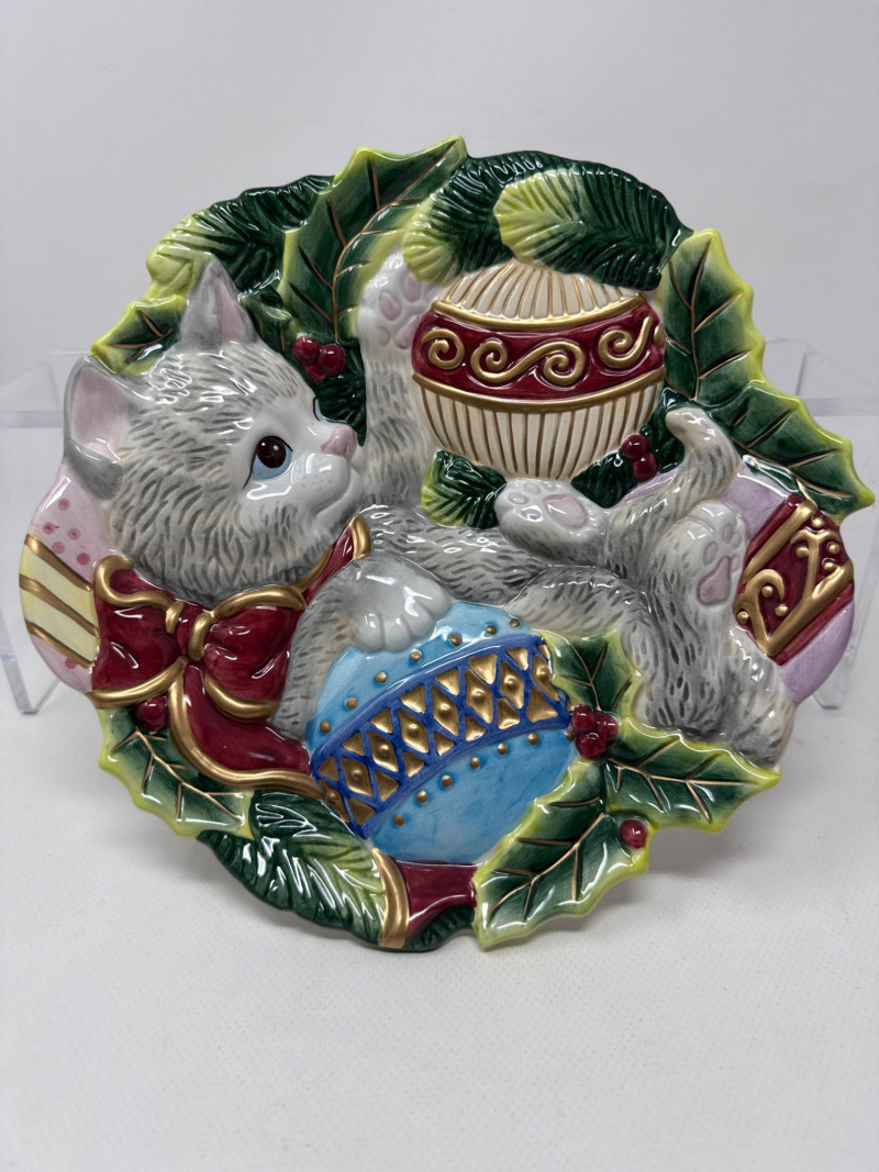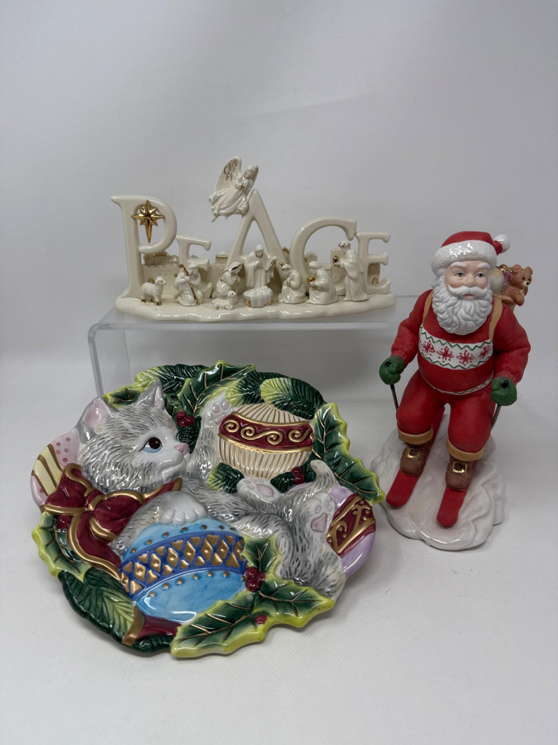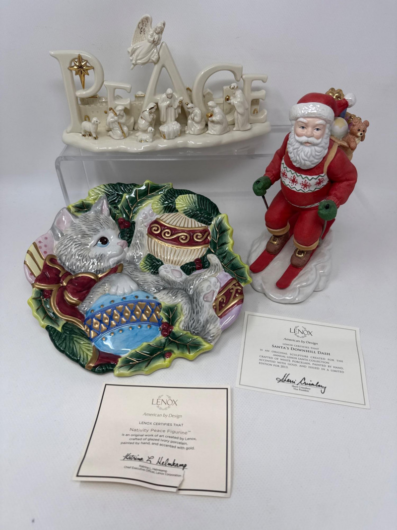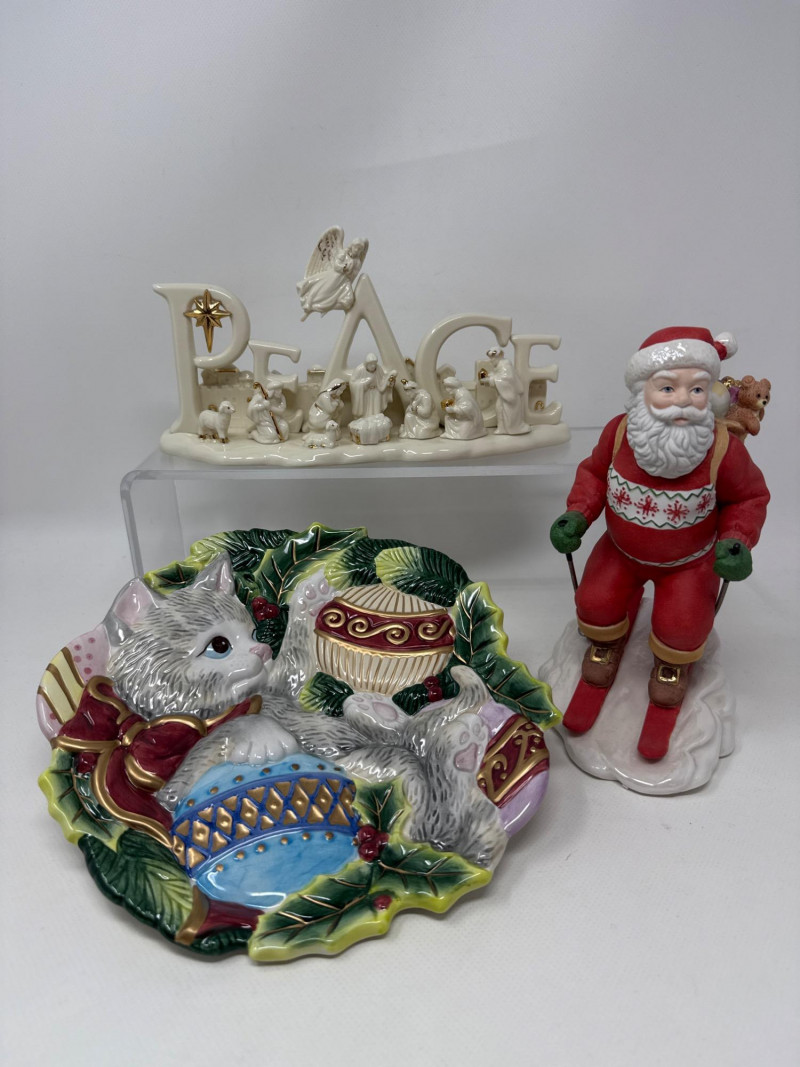 Celebrate the season with this delightful trio of collectible holiday décor: Lenox "Santa's Downhill Dash" Figurine (8.”5) – A limited-edition sculpture depicting Santa skiing downhill with gifts in tow. Hand-painted and accented with gold. Comes with certificate of authenticity. Lenox "Nativity Peace Figurine" (10" L x 5.5" T) – A beautiful ivory and gold-accented nativity scene integrated into the word “PEACE.” Handcrafted and elegant, also includes certificate of authenticity. Fitz and Floyd Essentials Holiday Cat Plate (9" dia) – A charming, colorful plate featuring a playful kitten nestled in festive ornaments and holly. Handcrafted and richly glazed.