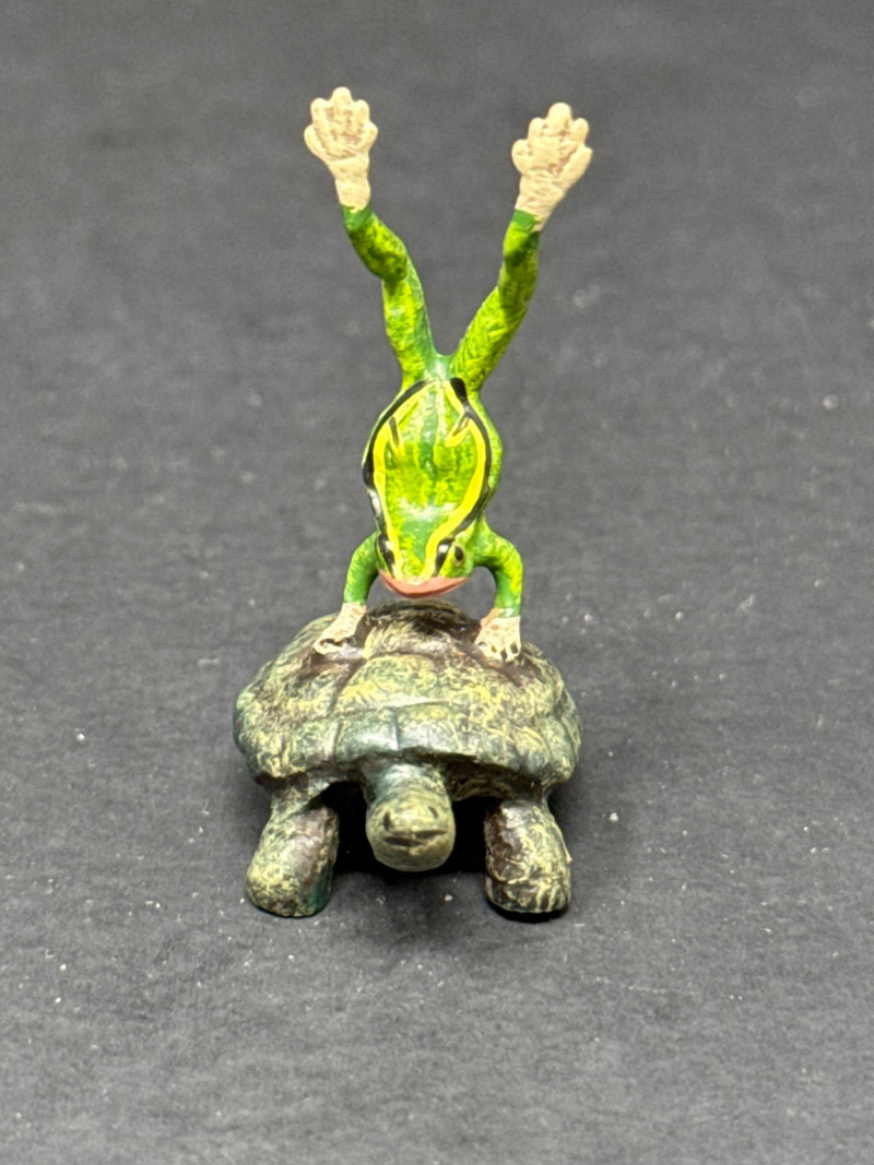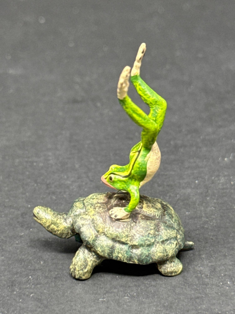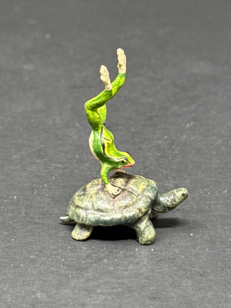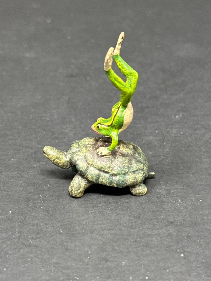 Charming and whimsical bronze sculpture by Fritz Bermann, Vienna. This hand-painted miniature features a vibrant green frog performing a handstand atop a turtle’s shell. Richly patinated with fine detailing on both the frog and the turtle, this piece showcases Bermann's signature artistry and Austrian craftsmanship. Artist: Fritz Bermann Material: Cold-painted bronze Subject: Frog balancing on turtle Markings: Stamped with Fritz Bermann hallmark underneath Dimensions: 2 inches tall, 1 inch wide Origin: Vienna, Austria