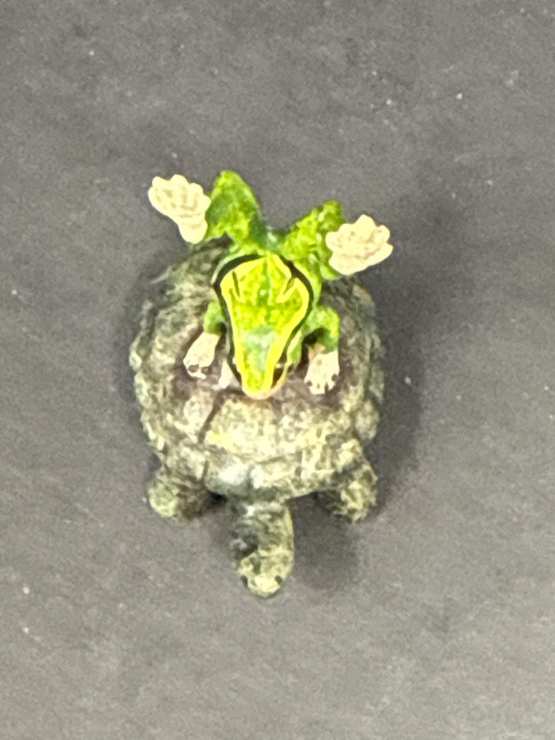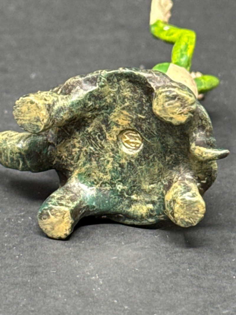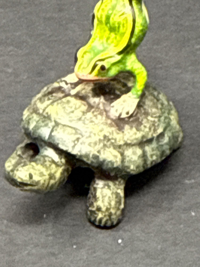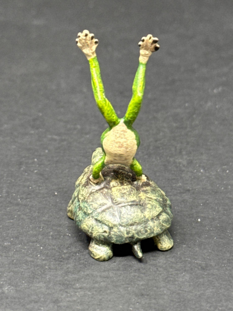 Charming and whimsical bronze sculpture by Fritz Bermann, Vienna. This hand-painted miniature features a vibrant green frog performing a handstand atop a turtle’s shell. Richly patinated with fine detailing on both the frog and the turtle, this piece showcases Bermann's signature artistry and Austrian craftsmanship. Artist: Fritz Bermann Material: Cold-painted bronze Subject: Frog balancing on turtle Markings: Stamped with Fritz Bermann hallmark underneath Dimensions: 2 inches tall, 1 inch wide Origin: Vienna, Austria