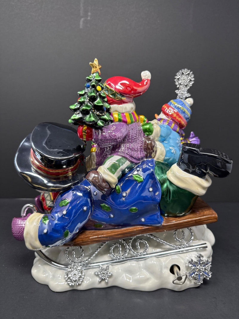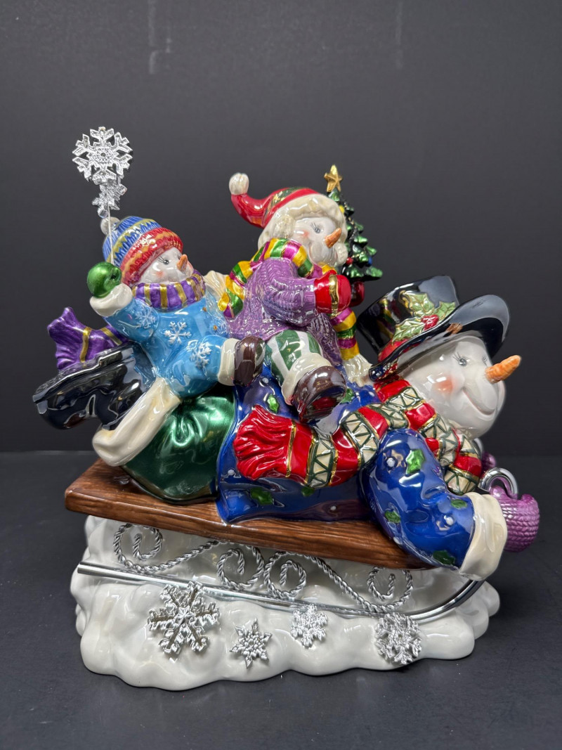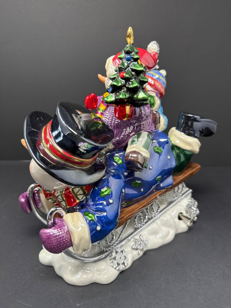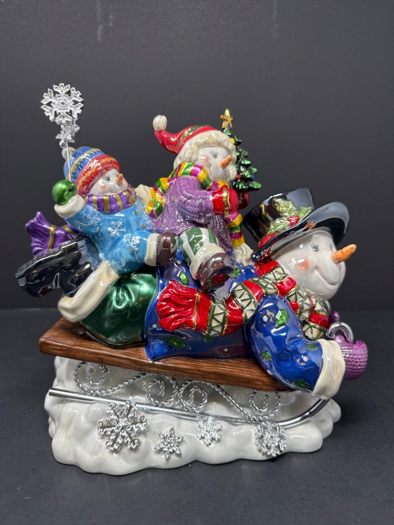 Bring festive cheer to your holiday decor with this charming Christopher Radko musical figurine titled “Three’s a Breeze.” This beautifully crafted piece features three joyful snow characters—two children and a snowman—riding a sled through a snowy landscape. Features: Title: Three’s a Breeze Brand: Christopher Radko Theme: Winter/Holiday Design: Snowman and children sledding, adorned in colorful winter clothing Details: Hand-painted with vibrant colors and intricate designs Base: Accented with silver-tone snowflakes and rope detailing Music Box: Wind-up mechanism plays “Winter Wonderland” Material: Ceramic Dimensions: 10.5" H x 9" L x 5.5" W Markings: Embossed “Radko” with sticker labels (including “Made in China”) on the base