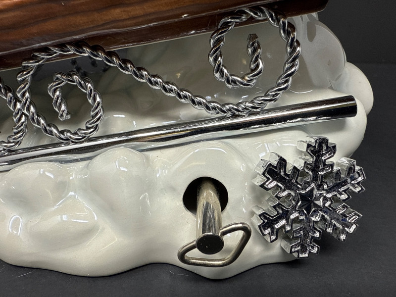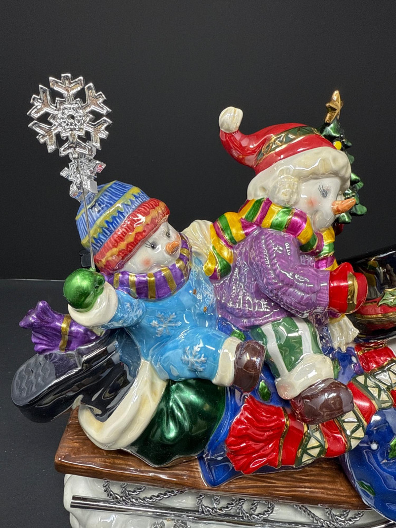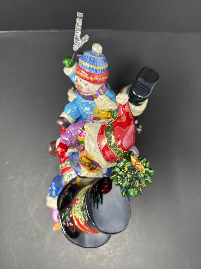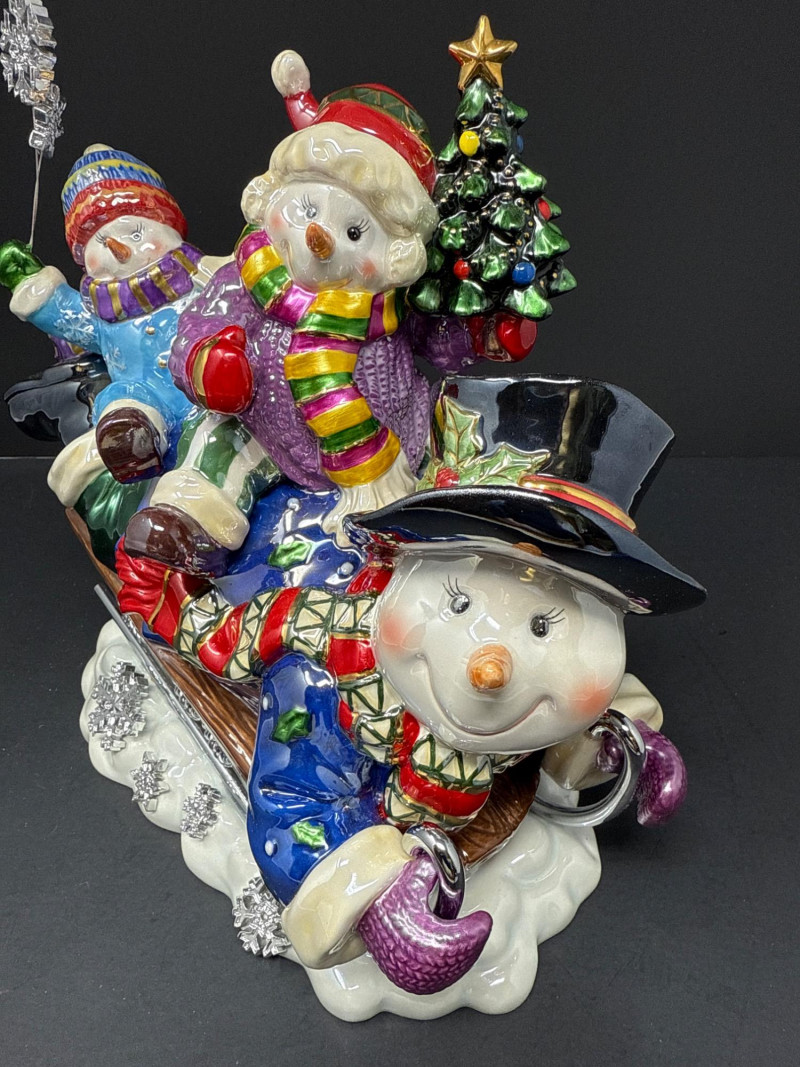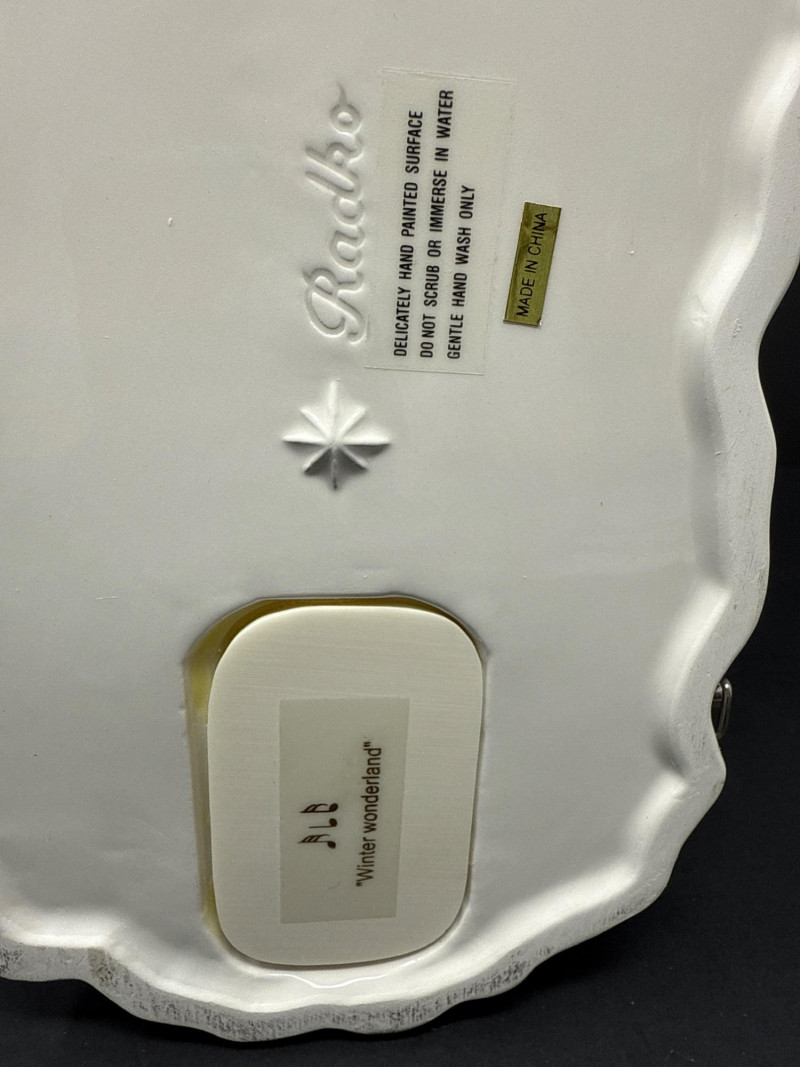 Bring festive cheer to your holiday decor with this charming Christopher Radko musical figurine titled “Three’s a Breeze.” This beautifully crafted piece features three joyful snow characters—two children and a snowman—riding a sled through a snowy landscape. Features: Title: Three’s a Breeze Brand: Christopher Radko Theme: Winter/Holiday Design: Snowman and children sledding, adorned in colorful winter clothing Details: Hand-painted with vibrant colors and intricate designs Base: Accented with silver-tone snowflakes and rope detailing Music Box: Wind-up mechanism plays “Winter Wonderland” Material: Ceramic Dimensions: 10.5" H x 9" L x 5.5" W Markings: Embossed “Radko” with sticker labels (including “Made in China”) on the base