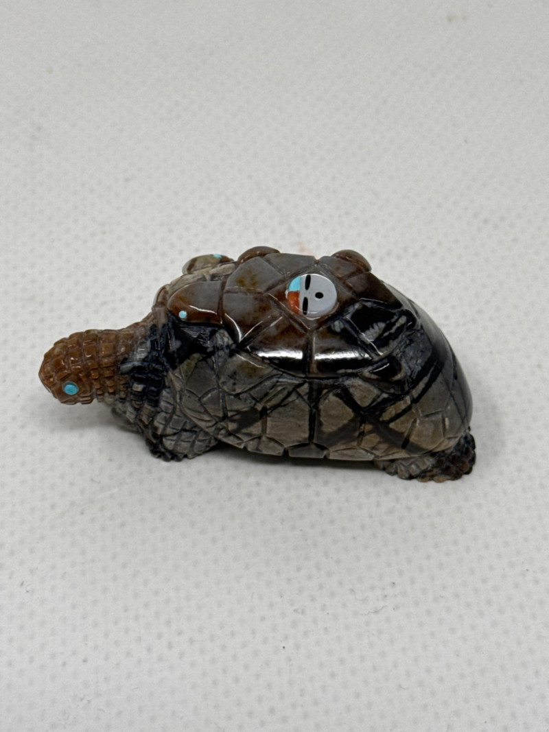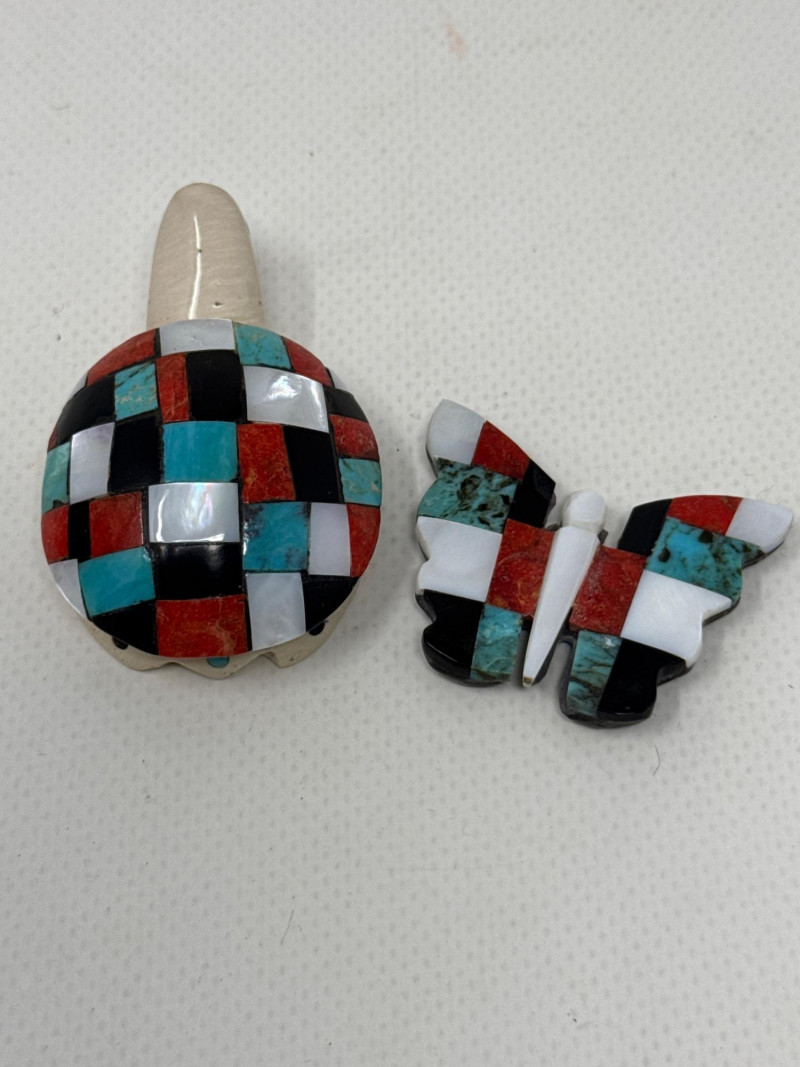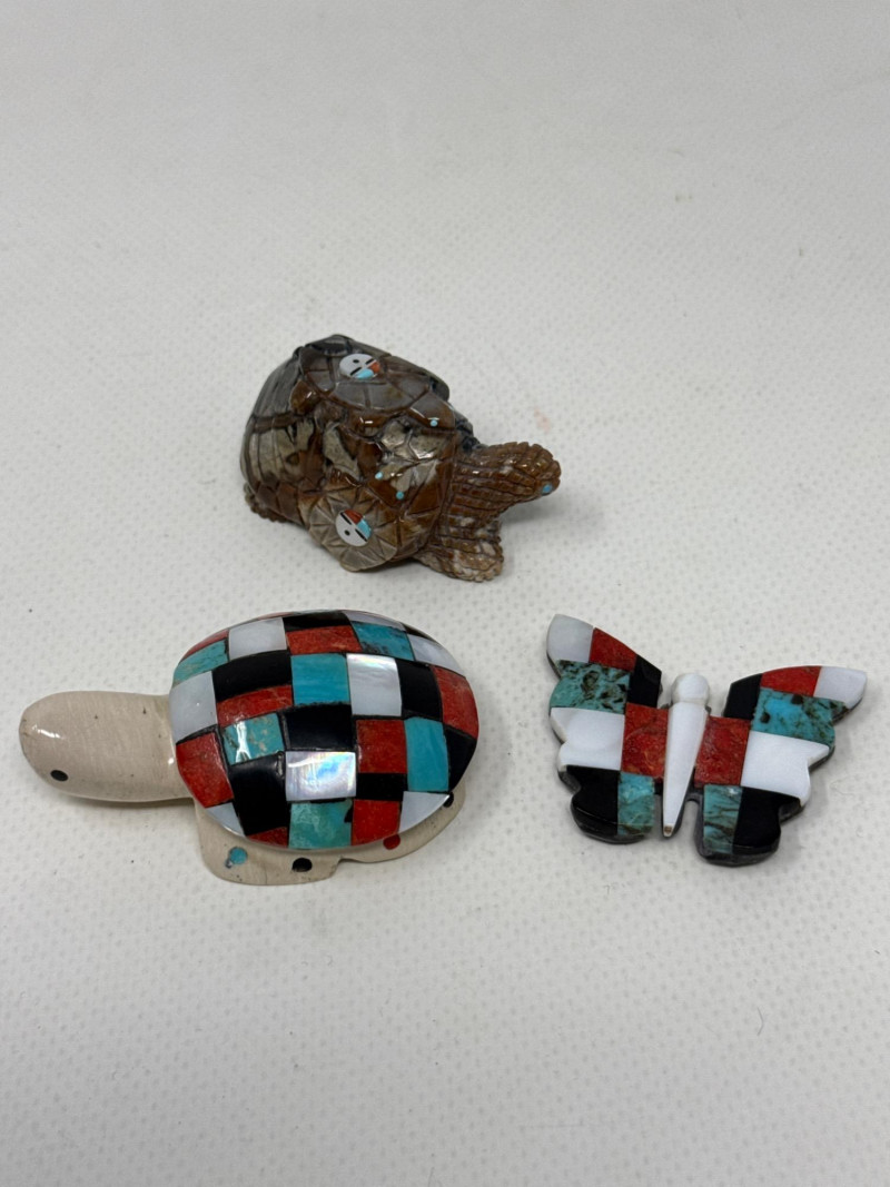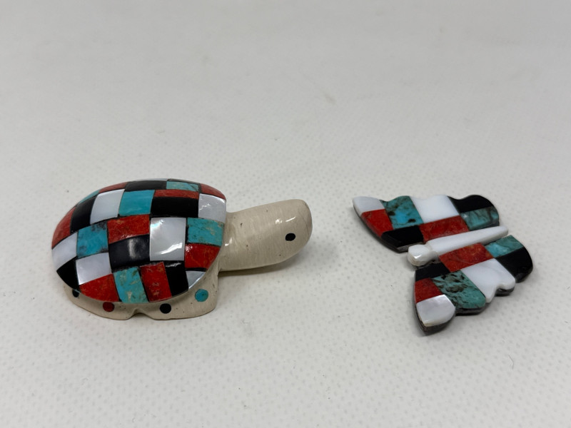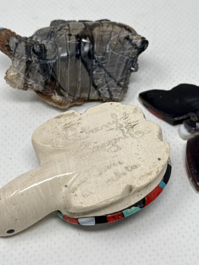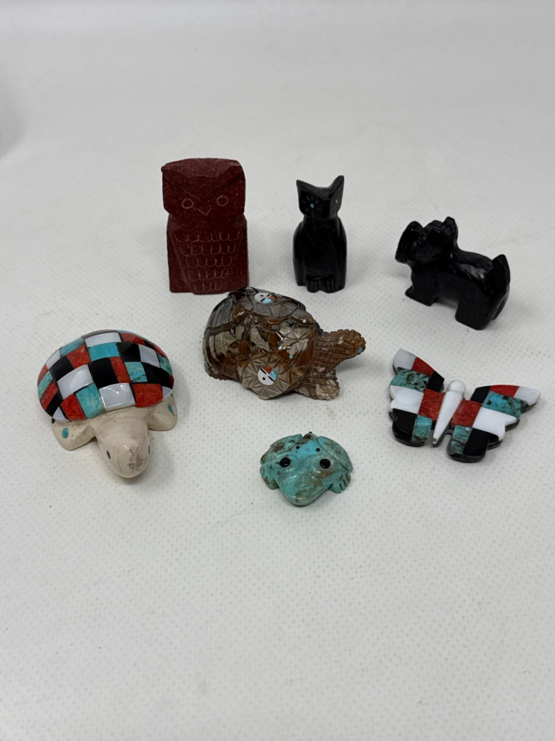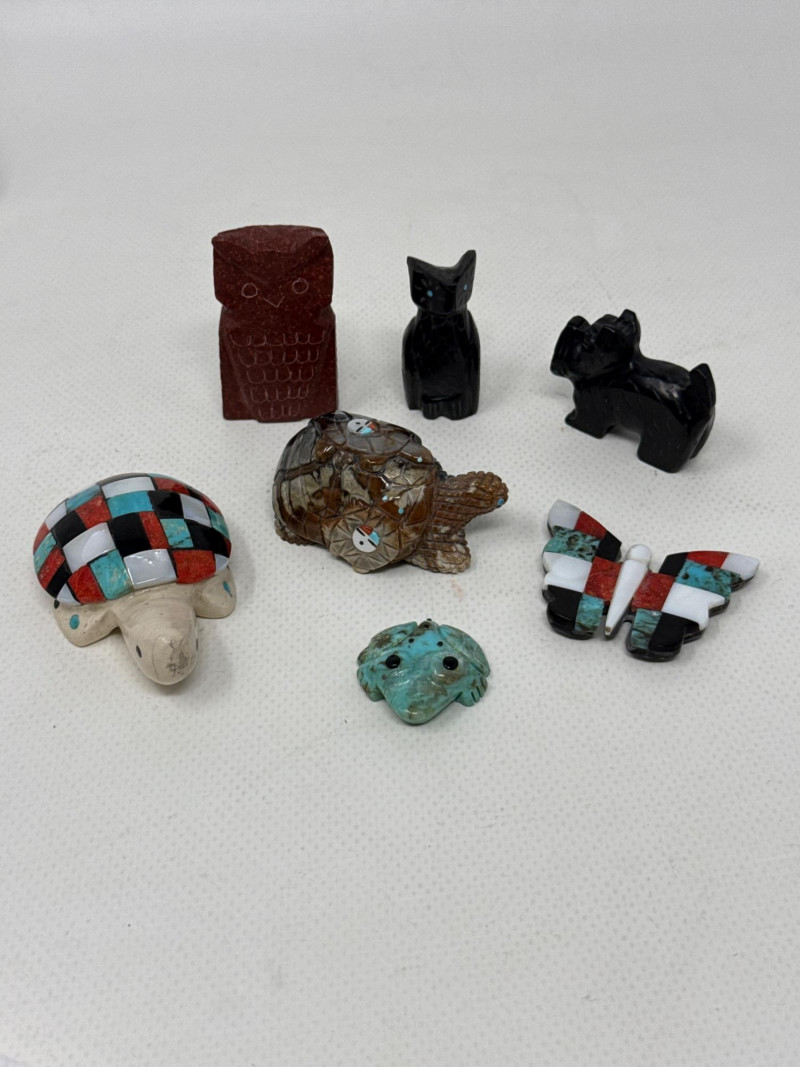 This unique collection features handcrafted animal miniatures, each skillfully carved and inlaid with intricate detail, attributed to Indigenous artisans, likely of Zuni origin. The set showcases a variety of materials including turquoise, jet, and stone, and several pieces are signed by the artists. Included in the Set: Red stone owl (signed) Jet black owl (signed) Jet black dog (signed) Turquoise-colored crab (signed) Inlaid butterfly with red, black, white, and turquoise stone Inlaid turtle with similar pattern Polished stone turtle with inlay accents and etched details Cream-based inlaid turtle signed "Cheryl Beyuka, Zuni" Features: Hand-carved animal figures in various materials Beautiful mosaic inlays and etched designs Artist signatures on several bases Represent traditional Zuni fetish carving style
