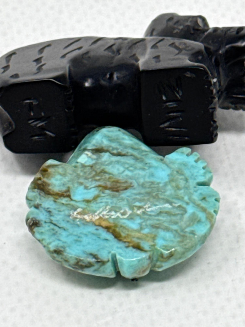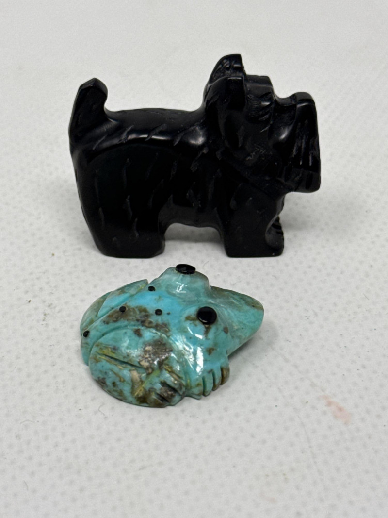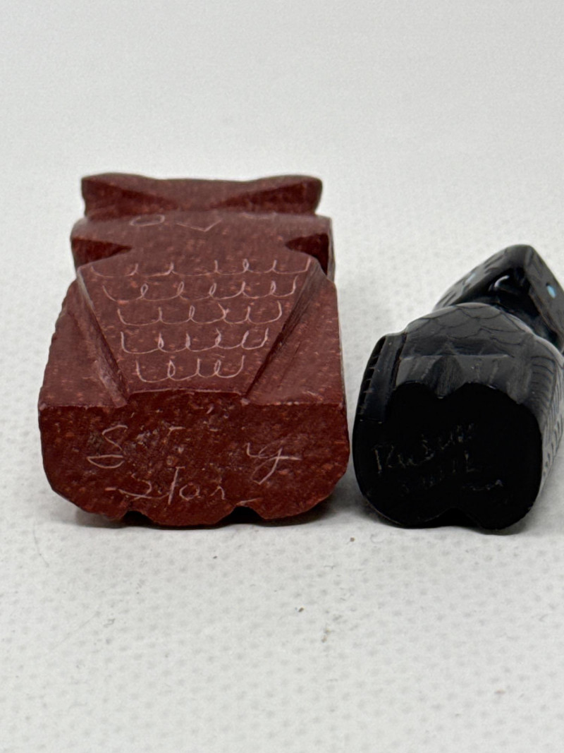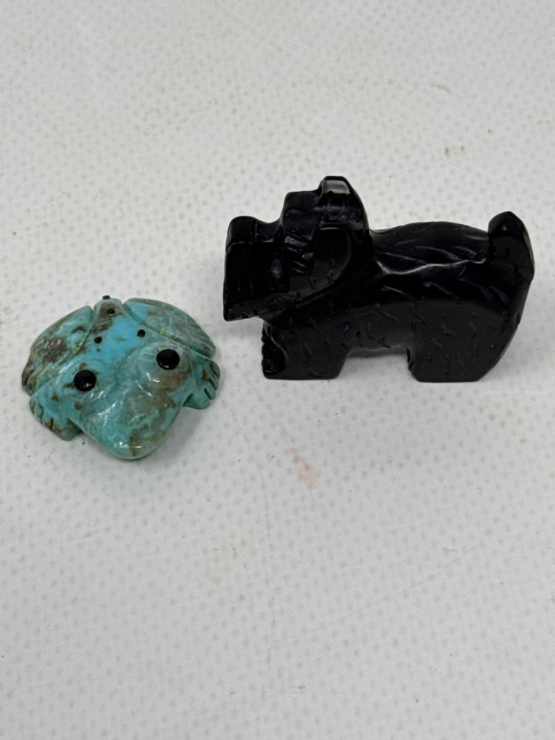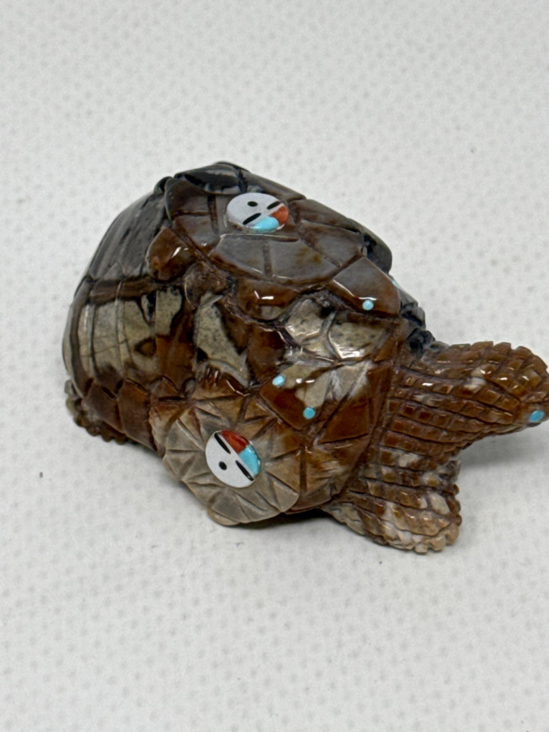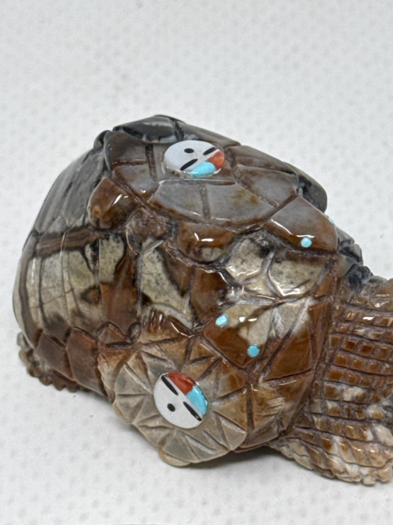 This unique collection features handcrafted animal miniatures, each skillfully carved and inlaid with intricate detail, attributed to Indigenous artisans, likely of Zuni origin. The set showcases a variety of materials including turquoise, jet, and stone, and several pieces are signed by the artists. Included in the Set: Red stone owl (signed) Jet black owl (signed) Jet black dog (signed) Turquoise-colored crab (signed) Inlaid butterfly with red, black, white, and turquoise stone Inlaid turtle with similar pattern Polished stone turtle with inlay accents and etched details Cream-based inlaid turtle signed "Cheryl Beyuka, Zuni" Features: Hand-carved animal figures in various materials Beautiful mosaic inlays and etched designs Artist signatures on several bases Represent traditional Zuni fetish carving style