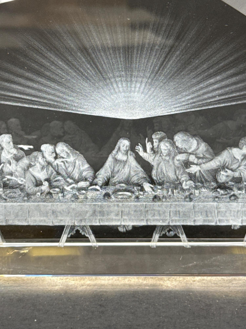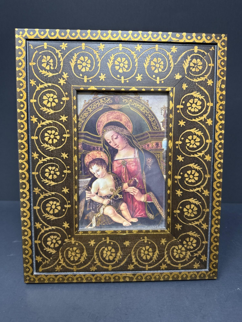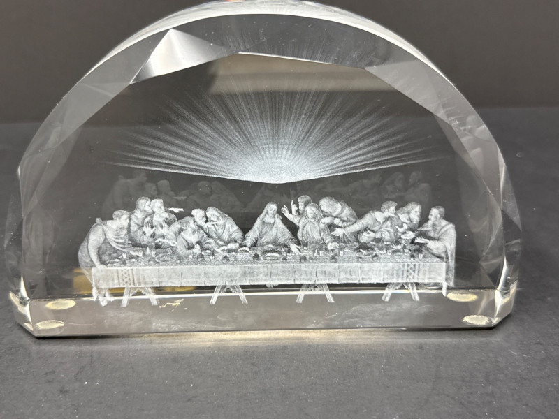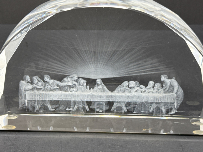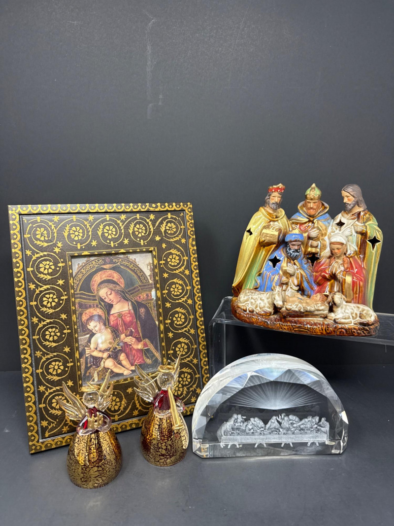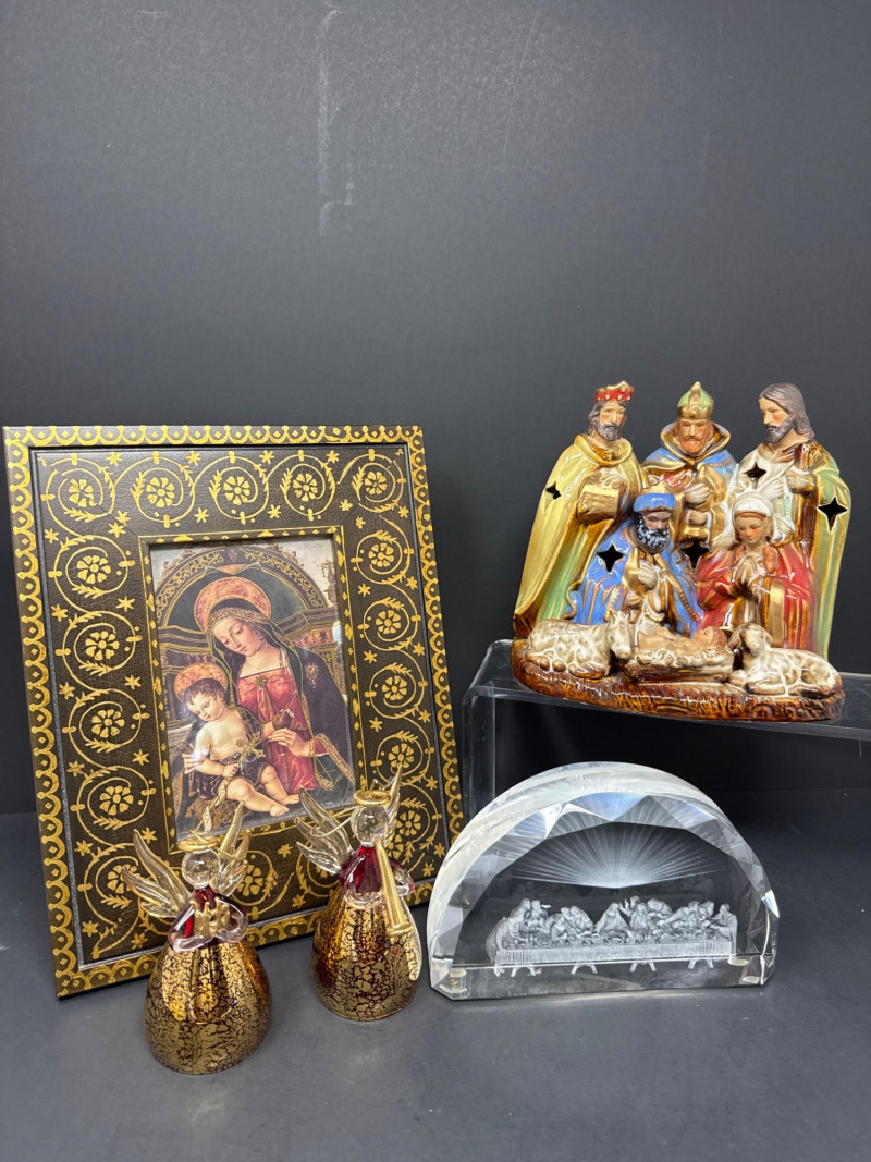 This beautiful collection of Christian religious decor includes a variety of meaningful and artful pieces: Etched Glass “Last Supper” Sculpture (Christian Brands): A radiant etched glass depiction of Leonardo da Vinci’s "The Last Supper," with stunning detail and light-catching facets. Approx. 6.25”L x 4.2”T x 2.75”W. Hand-Painted Nativity Scene: A vibrant and detailed ceramic nativity figurine with the Holy Family and Three Wise Men. Framed Madonna and Child Print by Martin Aborn: A richly colored religious print in an ornate gold and black floral frame. Frame measures approx. 8.5” x 11”. Pair of Glass Angel Figurines: Beautiful deep red and gold crackle-glass angels holding a trumpet and harp. Intricately detailed with gold wings and halos.