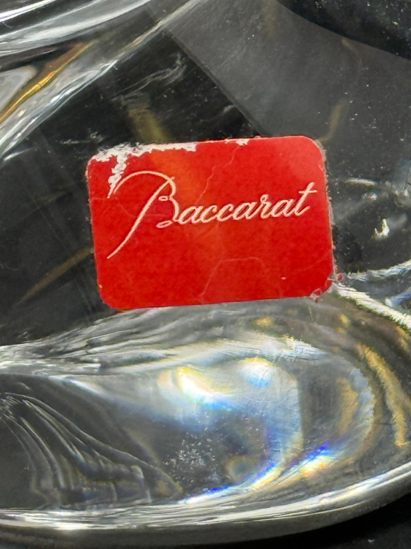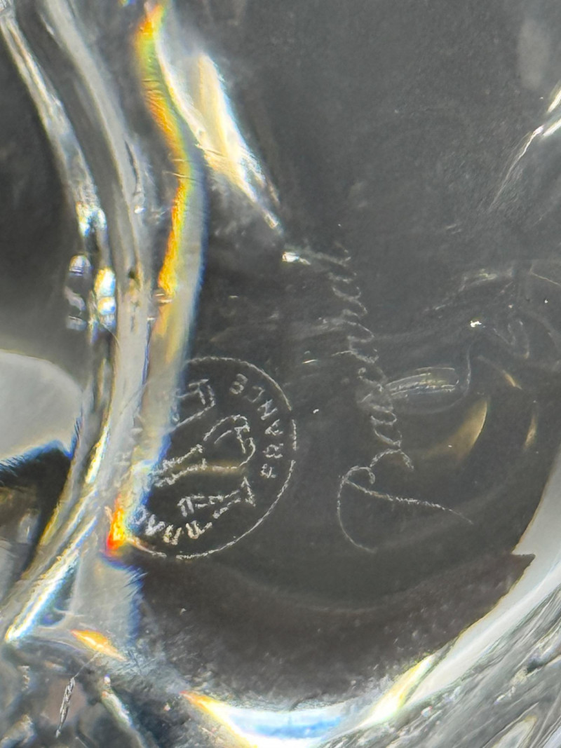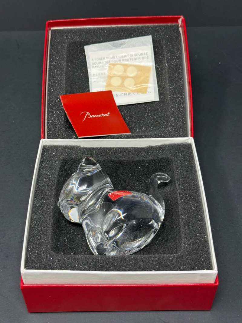 This charming Baccarat crystal kitten figurine features a playful and endearing design, expertly crafted in clear fine crystal. The piece is signed "Baccarat" and includes the etched hallmark stamp on the base. It also retains the original red Baccarat label. Material: Fine French crystal Signed: Etched “Baccarat” signature on the base Label: Original red Baccarat sticker intact Box: Comes with original Baccarat red box and insert Dimensions: Approximately 3" H x 2" L x 3.5" W