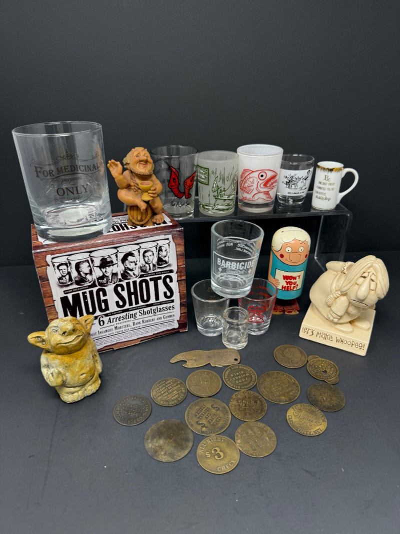 A unique and amusing collection of vintage adult humor items, novelty shot glasses, and collectible tokens. This lot includes a variety of playful and risqué memorabilia sure to spark conversation. Contents include: Shot Glasses: “For Medicinal Purposes Only” glass Vintage “Mug Shots” boxed set of 6 glasses featuring infamous mobsters Barbicide germicide shot glass (noted at $59.95 retail) Graphic novelty glasses with sayings, measurements, crawfish, and spinning wheel imagery Tiny clear miniatures and souvenir glasses Figurines & Novelties: “Let’s Make Whoopee!” comical figure “Won’t You Help?” donation-style character Laughing man with goblet Small goblin or troll figure Adult Humor Tokens (approx. 15+): Vintage-style brass brothel or saloon tokens, with humorous inscriptions such as: “Good for One Screw – 10 Ladies for Your Pleasure” “Whiskey, Tobacco and Fancy Women” “Compliments of Miss Olga, Denver” “Uncle Sam Hotel – 12 Ladies to Assist You” Various others with adult-themed or satirical content