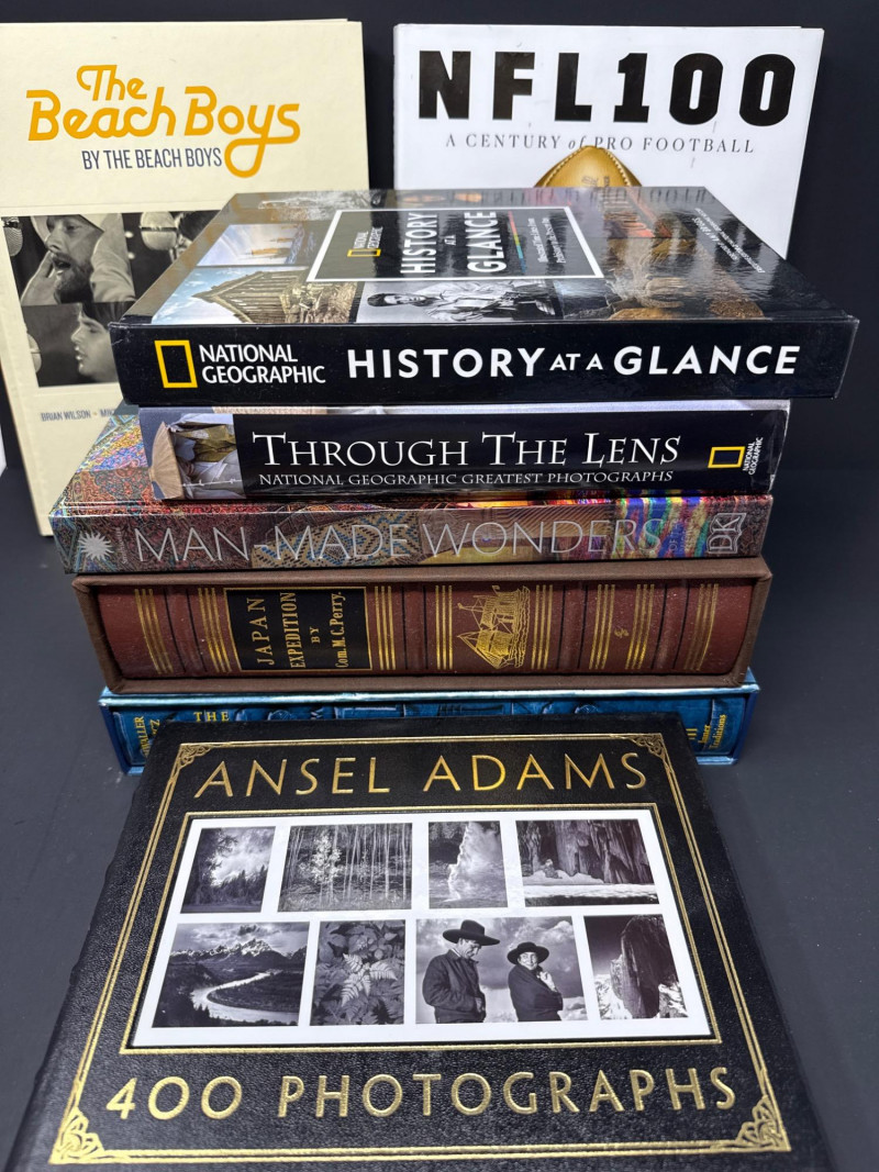 A diverse and engaging collection of hardcover and coffee table books ideal for the curious mind. This lot features a wide range of topics—from iconic photography and world history to cultural wonders and legendary music and sports moments. Titles Include: Ansel Adams: 400 Photographs National Geographic: Through the Lens National Geographic: History at a Glance Man-Made Wonders of the World Japan Expedition by Com. M.C. Perry The Temples of Karnak The Beach Boys – In Their Own Words and Pictures NFL 100: A Century of Pro Football