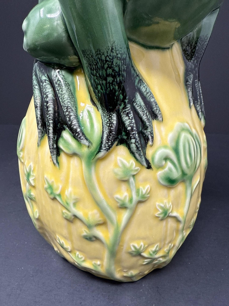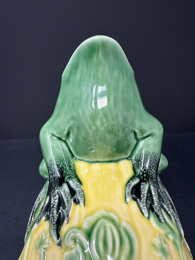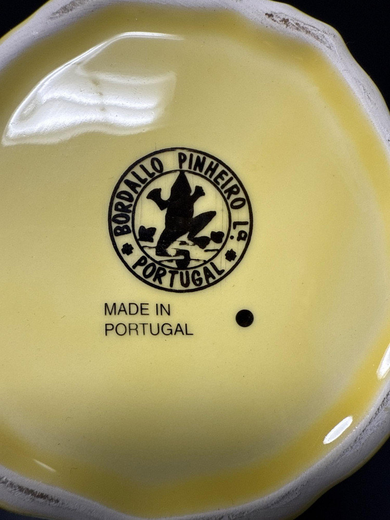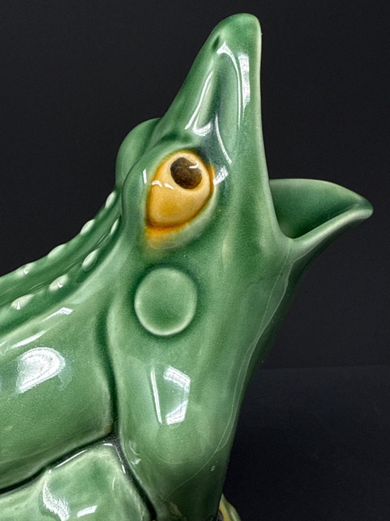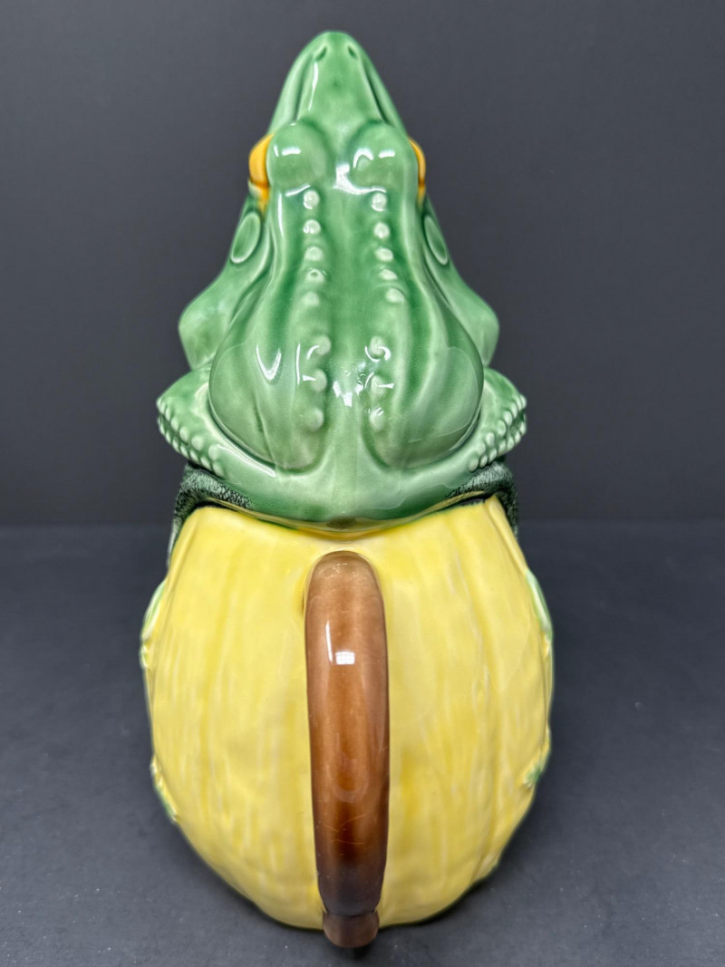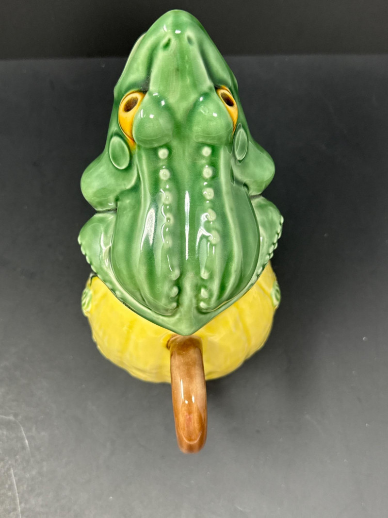 This whimsical ceramic pitcher by Bordallo Pinheiro features a vibrant green frog perched on a yellow floral-textured base, with a brown handle and an open mouth that serves as the spout. A charming and functional piece of Portuguese pottery. Details: Maker: Bordallo Pinheiro Country of Origin: Portugal Material: Glazed ceramic Dimensions: 10.5" tall × 7" long × 5" wide Marked on base: "Bordallo Pinheiro Ldª Portugal"